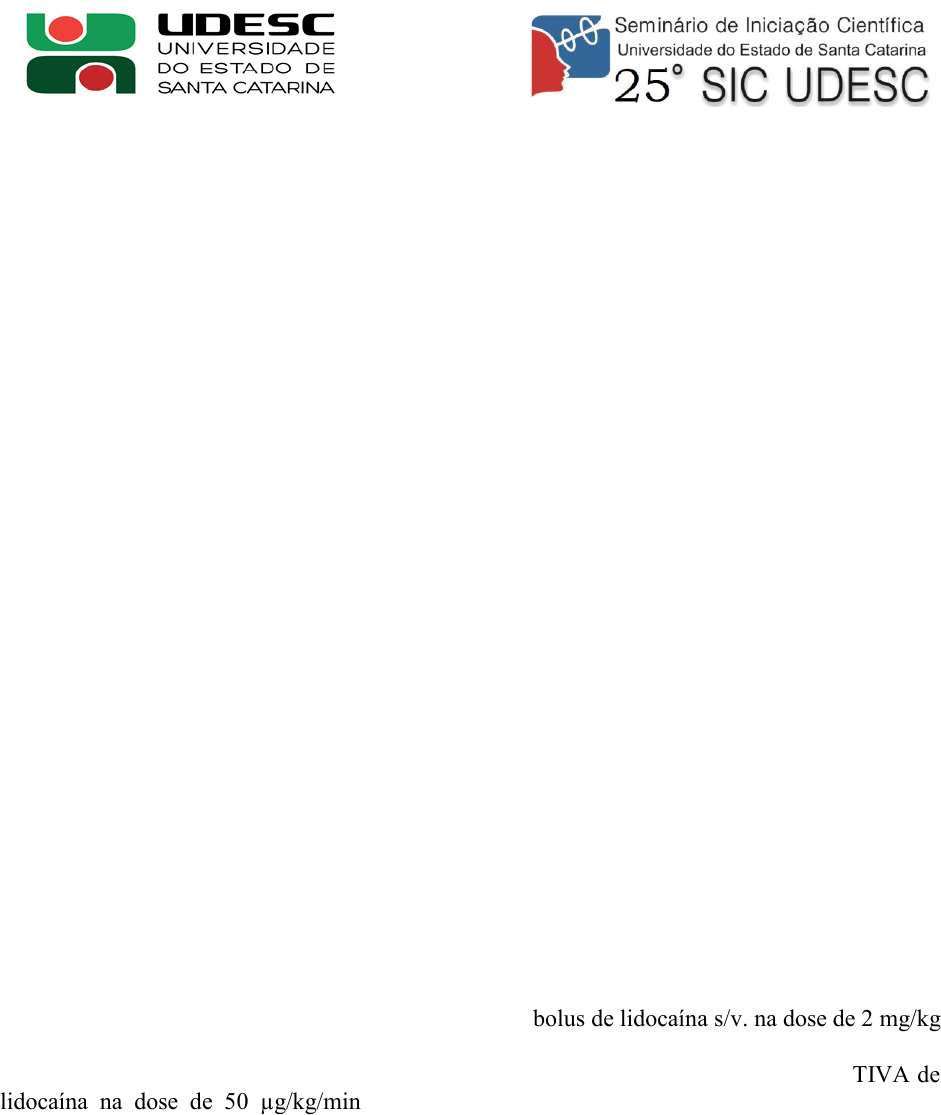 AVALIAÇÃO CLÍNICA E ANALGÉSICA DA INFUSÃO CONTÍNUA INTRAVENOSA DE LIDOCAÍNA SEM VASOCONSTRITOR EM GATAS. Nilson Oleskovicz 1 , Samuel Jorge Ronchi 2 , Felipe Comassetto 3 , Luara da Rosa 3 , Karen S. Fuchs 2 , Isabela T. de Lima 2 , Vanessa Sasso Padilha 4 , Ronise Tochetto 4 1 Orientador, Departamento de Medicina Veterinária, CAV – nilson.oleskovicz@udesc.br 2 Acadêmico do Curso de Medicina Veterinária, CAV - bolsista PIVIC/UDESC 3 Doutoranda em Ciência Animal, CAV 4 Professor Participante do Departamento de Medicina Veterinária, CAV Palavras-chave: Gatos. Anestesia total intravenosa. Lidocaína. A anestesia total intravenosa (TIVA) é uma técnica difundida na Medicina Veterinária e pode ser utilizada de forma efetiva no controle de dor transoperatório em cães e gatos. Neste contexto, a lidocaína, um anestésico local, pode ser utilizada por meio da TIVA, como um adjuvante na anestesia balanceada, diminuindo o requerimento dos agentes inalatórios e auxiliando no controle da dor. Porém, o seu uso através da TIVA em felinos é uma técnica pouco difundida, devido à toxicidade que esses animais podem apresentar em relação a este anestésico local. Desta forma, objetivou-se avaliar os parâmetros clínicos e analgésicos de felinos submetidos à TIVA com lidocaína sem vasoconstrictor em gatas submetidas ao procedimento de ovariossalpingohisterectomia (OSH) eletiva, realizada sempre pelo mesmo cirurgião. Para isso foram utilizadas até o presente momento, seis gatas, comprovadamente hígidas através de hemograma e perfil bioquímico prévio. Os animais receberam como medicação pré-anestésica, acepromazina e metadona (0,02 mg/kg e 0,3 mg/kg), respectivamente. Após 15 minutos, foram induzidas à anestesia geral, com propofol, na dose de 4 mg/kg, sendo alocadas em três grupos: grupo GF: as quais receberam bolus de solução fisiológica após a indução anestésica seguida da infusão de solução fisiológica; GB: as quais receberam bolus de lidocaína s/v. na dose de 2 mg/kg após a indução anestésica, seguida da infusão de solução fisiológica; e o grupo GL: os quais receberam lidocaína s/v. na dose de 2 mg/kg após a indução anestésica, com posterior TIVA de lidocaína na dose de 50 µg/kg/min todos durante 60 minutos. Após o início da TIVA, foi realizado o procedimento de OSH, e os parâmetros avaliados foram: frequência cardíaca (FC), frequência respiratória (f), pressão arterial sistólica (PAS), temperatura corpórea (TºC), saturação periférica de oxigênio (SPO2) e fração expirada de gás carbônico (EtCO2). Realizou-se como regate analgésico transoperatório, fentanil, na dose de 2,5 µg/kg, pela via intravenosa, quando no mínimo dois destes parâmetros (FC, f e/ou PAS) apresentasse valores acima 20% em relação aos do momento basal. Os momentos avaliados foram: 5 minutos após a indução anestésica (M0); 5 minutos após o bolus de lidocaína ou solução fisiológica (M1); 10 minutos após o início da infusão (M2); antes da incisão de pele (M3); após incisão da musculatura (M4); após o pinçamento do primeiro pedículo (M5); após o pinçamento do segundo pedículo (M6); após o pinçamento da cérvix (M7); ao final da sutura da musculatura (M8); no final da cirurgia (M9); 30 mailto:nilson.oleskovicz@udesc.br Alex Destacar Alex Destacar minutos após o início da infusão (M10); 45 minutos após início da infusão (M11); e aos 60 minutos após o início da infusão (M12). A avaliação da dor pós-operatória, foi realizada com a Escala Multidimensional de Dor Aguda Pós-operatória em Felinos da FMVZ – UNESP (Botucatu) por dois avaliadores experientes e cegos aos tratamentos, e os momentos avaliados foram: 2, 4, 6, 8, 12 e 24 horas após o término do procedimento cirúrgico (T1, T2, T4, T6, T8, T12 e T24). Ainda, avaliou-se a ocorrência ou não de toxicidade durante o trans e pós-operatório das gatas submetidas à TIVA de lidocaína s/v. Os resultados médios observados até o presente momento estão listados na Tabela 1. Neste estudo, serão realizados um total de 18 gatas, 6 em cada grupo, faltando então 12 animais para a sua conclusão e através disto, espera-se que a lidocaína, na dose utilizada, apresente efeitos analgésicos satisfatórios, com menor requerimento de resgates analgésicos trans e pós operatórios, sem a ocorrência de efeitos tóxicos nesta espécie. Tab. 1 Resultados médios dos seis animais submetidos aos seguintes tratamentos: GF, bolus de solução fisiológica e infusão de solução fisiológica; GB, bolus de lidocaína s/v. (2 mg/kg) e infusão de solução fisiológica; GL, bolus de lidocaína s/v. (2 mg/kg) e infusão de lidocaína s/v. na taxa de 50 µg/kg/min. Parâmetros Grupos Momentos avaliados M0 M1 M2 M3 M4 M5 M6 M7 M8 M9 M10 M11 M12 FC GF 146 129 128 129 139 199 177 171 170 189 173 155 179 GB 157 125 122 124 152 191 199 188 190 186 185 199 172 GL 163 155 196 159 169 171 200 175 185 190 177 190 188 f GF 39 26 25 25 28 37 24 20 19 23 25 20 27 GB 36 23 22 23 30 34 24 24 28 31 31 32 31 GL 23 16 25 25 23 29 23 22 22 21 22 29 29 PAS GF 83 80 85 85 90 140 145 109 90 85 89 85 91 GB 105 104 100 100 124 155 135 140 105 110 110 110 125 GL 75 100 160 138 96 149 166 149 140 143 133 130 130 SPO2 GF 97 98 98 98 98 97 97 95 97 97 95 96 93 GB 98 99 99 99 98 98 99 99 97 100 99 97 98 GL 100 95 96 96 95 97 99 97 98 99 98 99 100 EtCO2 GF 29 31 31 31 33 31 33 35 33 31 31 34 31 GB 28 30 31 31 33 29 27 29 30 29 30 30 29 GL 33 32 31 31 32 29 33 29 28 30 30 27 28 ISOexp GF 1,4 1,3 1,4 1,4 1,3 1,3 1,3 1,3 1,3 1,4 1,4 1,4 1,4 GB 1,3 1,4 1,3 1,3 1,3 1,3 1,3 1,3 1,4 1,4 1,4 1,4 1,4 GL 1,2 1,2 1,2 1,2 1,3 1,4 1,4 1,4 1,3 1,3 1,3 1,3 1,3 Resgate analgésico GF 0 0 0 0 0 2 4 0 0 0 0 0 0 GB 0 0 0 0 0 5 5 3 0 0 0 0 0 GL 0 0 0 0 0 3 1 0 2 0 0 0 0