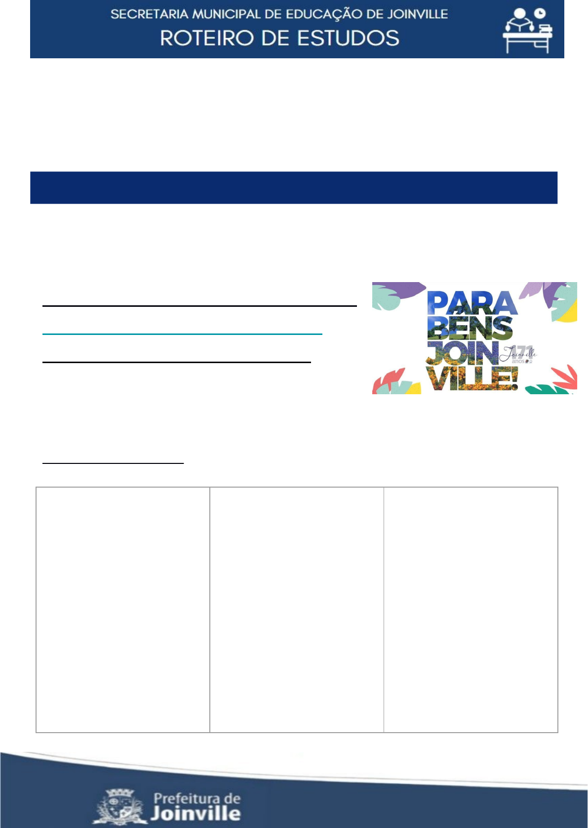 ESCOLA MUNICIPAL AMADOR AGUIAR COMPONENTE CURRICULAR: HISTÓRIA PROFESSORA: RÚBIA TURMA: 3º ANO NÚMERO DE AULAS: 04 AULASROTEIRO DE ESTUDOS VOLUME 03- 07/03 A 18/03 02 AULAS ( 1ª semana) EM NOSSA AULA VAMOS CONVERSAR UM POUCO SOBRE A NOSSA CIDADE. ELA FEZ (FAZ) ANIVERSÁRIO, DIA 9 DE MARÇO, SÃO 171 ANOS! VIVA JOINVILLE! VAMOS ASSISTIR UM VÍDEO SOBRE A NOSSA CIDADE https://www.youtube.com/watch?v=HySlGzHjDUM HISTÓRIA DE JOINVILLE PARA OS PEQUENOS APÓS VER O VÍDEO E A HISTÓRIA DA FUNDAÇÃO, VAMOS DESENHAR UMA HISTÓRIA EM QUADRINHOS SOBRE JOINVILLE (ATIVIDADE AVALIATIVA) 2 AULAS (2ª semana) OS PRIMEIROS HABITANTES DO BRASIL HÁ MAIS DE 500 ANOS, OS EUROPEUS ENCONTRARAM NAS TERRAS QUE DEPOIS SERIAM CHAMADAS DE BRASIL, DIFERENTES POVOS INDÍGENAS, CADA QUAL COM COSTUMES E LÍNGUAS PRÓPRIAS. APESAR DA GRANDE DIVERSIDADE ENTRE ESSES POVOS, ALGUMAS CARACTERÍSTICAS ERAM COMUNS COMO NÃO CONSIDERAR A TERRA UMA PROPRIEDADE PARTICULAR. PARA ELES A TERRA NÃO PODIA SER COMPRADA EM, ALÉM DISSO, O PRODUTO DO TRABALHO SE DESTINA AO SUSTENTO DA COMUNIDADE E NÃO AO COMÉRCIO. INICIALMENTE OS PORTUGUESES ESTABELECERAM MAIS CONTATO COM OS INDÍGENAS DO GRUPO TUPI. NESSE GRUPO, O TRABALHO ERA DIVIDIDO ENTRE HOMENS E MULHERES E O CHEFE ORGANIZAVA AS ATIVIDADES. OS HOMENS CAÇAVAM E DERRUBAM ÁRVORES PARA ABRIR TERRENOS. NELES AS MULHERES PLANTAVAM MANDIOCA MILHO, BATATA-DOCE ENTRE OUTROS ALIMENTOS. A PESCA E A COLETA DE RAÍZES E DE FRUTOS ERAM FEITAS POR TODOS DA ALDEIA. AS MORADIAS ERAM CHAMADAS DE MALOCAS E, GERALMENTE, ERAM ORGANIZADAS DE MODO CIRCULAR EM TORNO DE UM PÁTIO CENTRAL. A COLONIZAÇÃO FOI A ESTRATÉGIA UTILIZADA PELO GOVERNO PORTUGUÊS PARA EXPLORAR O TERRITÓRIO BRASILEIRO. O PAÍS COLONIZADOR ERA CHAMADO DE METRÓPOLE E O TERRITÓRIO ADMINISTRADO E EXPLORADO PELA METRÓPOLE ERA DENOMINADO COLÔNIA. A FUNÇÃO DA COLÔNIA ERA PRODUZIR E FORNECER MERCADORIAS QUE PUDESSEM ENRIQUECER A METRÓPOLE. OS COLONIZADORES PORTUGUESES UTILIZAVAM A MÃO DE OBRA INDÍGENA PARA EXTRAIR UMA ÁRVORE CHAMADA PAU-BRASIL, CUJA TINTA ERA USADA PARA TINGIR TECIDOS E TINHA MUITO VALOR NA EUROPA. OS PORTUGUESES SE CONSIDERAVAM OS SENHORES DA TERRA E ACHAVAM NATURAL TOMAR POSSE DELA E DE SEUS HABITANTES, FAZENDO-OS ESCRAVOS. PARA OS INDÍGENAS, A COLONIZAÇÃO PORTUGUESA RESULTOU NA DESTRUIÇÃO DE GRANDE PARTE DA POPULAÇÃO, NO ENFRAQUECIMENTO DA CULTURA E NA PERDA DE SUAS TERRAS. AOS POUCOS SURGIRAM FAZENDAS DE PRODUÇÃO DE CANA-DE-AÇÚCAR. A PRINCIPAL MÃO DE OBRA UTILIZADA ERA DE AFRICANOS CAPTURADOS EM SUAS TERRAS DE ORIGEM E TRAZIDOS BRASIL. AQUI ELES ERAM ESCRAVIZADOS E FORÇADOS A TRABALHAR NAS LAVOURAS POR PELO MENOS 12 HORAS POR DIA. VIERAM AO BRASIL MILHÕES DE AFRICANOS QUE POVOARAM GRANDE PARTE DO TERRITÓRIO E ESTABELECERAM RELAÇÕES SOCIAIS CULTURAIS ECONÔMICAS QUE, JUNTO COM INDÍGENAS E PORTUGUESES CONSTITUEM A BASE DA IDENTIDADE BRASILEIRA. ATIVIDADE 1 – RESPONDA EM SEU CADERNO: QUE POVOS FORMAM A BASE DA IDENTIDADE BRASILEIRA? DAS VILAS ÀS CIDADES MUITOS PORTUGUESES QUE VIERAM AO BRASIL TINHAM O OBJETIVO DE OCUPAR A TERRA E ENRIQUECER: ERAM OS COLONOS. A MAIOR PARTE DO TRABALHO PESADO, PORÉM, NÃO ERA REALIZADA POR ELES. OS COLONOS ESCRAVIZARAM INDÍGENAS E AFRICANOS QUE TRABALHAVAM NA PRODUÇÃO DE AÇÚCAR, NA ROÇA E EM SERVIÇOS DOMÉSTICOS, NO CUIDADO COM O GADO ENTRE OUTRAS. AS VILAS FORAM SURGINDO ONDE HAVIA ATIVIDADE ECONÔMICA. A VILA DE SÃO VICENTE, FUNDADA POR MARTIM AFONSO DE SOUZA E O PRIMEIRO NÚCLEO DE PORTUGUESES NO BRASIL, ABRIGAVA UM ENGENHO DE CANA-DE-AÇÚCAR. EM 1549, CHEGARAM AO BRASIL OS MEMBROS DE UMA ORDEM RELIGIOSA CHAMADA COMPANHIA DE JESUS, OS JESUÍTAS, QUE VIERAM PARA DIVULGAR O CATOLICISMO E FUNDAR ESCOLAS. EM 1554, ELES FUNDARAM O COLÉGIO QUE DEU ORIGEM A VILA DE SÃO PAULO DE PIRATININGA, ONDE ATUALMENTE ESTÁ A CIDADE DE SÃO PAULO. ATIVIDADE 2 – RESPONDA AS QUESTÕES ABAIXO EM SEU CADERNO. A) QUEM ERAM OS COLONOS E QUAIS ERAM SEUS OBJETIVOS? B) POR QUE OS JESUÍTAS VIERAM PARA O BRASIL? TAREFA DE CASA GRUPOS POPULACIONAIS QUE FORMARAM E FORMAM A CIDADE E O MUNICÍPIO MUITAS PESSOAS MUDAM DE CIDADE, REGIÃO E ATÉ DE PAÍS. MUITAS DESSAS PESSOAS ESPERAM MELHORAR DE VIDA E MORAR EM UM LUGAR ONDE TENHA PAZ, SEGURANÇA, SAÚDE, EDUCAÇÃO, DESENVOLVIMENTO, SUSTENTO E QUALIDADE DE VIDA. QUANDO UM LUGAR JÁ NÃO OFERECE CONDIÇÕES NECESSÁRIAS PARA UMA PESSOA VIVER, ELA PROCURA UM NOVO LUGAR PARA MORAR, DENTRO DO PRÓPRIO PAÍS OU DE OUTRO. CHAMAMOS ESSE VAI E VEM DE PESSOA, EM BUSCA DE MELHORES CONDIÇÕES DE VIDA, DE PROCESSOS MIGRATÓRIOS E SÃO ESSES PROCESSOS, JUNTAMENTE COM AS PESSOAS QUE JÁ VIVEM NUM DETERMINADO LOCAL, QUE ACABAM FORMANDO OS GRUPOS POPULACIONAIS E A CULTURA DE UMA REGIÃO. CONHECEMOS A HISTÓRIA DE JOINVILLE E VIMOS QUE SUÍÇOS, ALEMÃES E NORUEGUESES FORAM OS IMIGRANTES QUE VIERAM NA BARCA COLLON, COM O OBJETIVO DE FUNDAR UMA NOVA COLÔNIA NO BRASIL, MAS, ELES NÃO FORAM OS PRIMEIROS A CHEGAREM POR AQUI. JÁ HAVIA NESTA REGIÃO, COLÔNIAS DE PORTUGAL, COM SEUS ESCRAVOS NEGROS E TAMBÉM OS ÍNDIOS NATIVOS, QUE VIVIAM EM TERRAS BRASILEIRAS ANTES DA CHEGADA DE TODO MUNDO. E ANTES DOS ÍNDIOS QUE FORAM ENCONTRADOS EM TERRAS BRASILEIRAS PELAS CARAVELAS DE PORTUGAL, ENCONTRAMOS EM TERRAS JOINVILENSES E EM OUTROS LUGARES DO BRASIL, VESTÍGIOS DE POVOS MUITO ANTIGOS, PRIMITIVOS, QUE VIVIAM PRINCIPALMENTE NO LITORAL E CONSUMIAM OSTRAS, MARISCOS E AMONTOAVAM SUAS CASCAS E OS RESTOS DE OBJETOS PRODUZIDOS POR ELES EM ENORMES MONTES DE CONCHAS CHAMADOS DE SAMBAQUIS. ENTÃO, SE PARARMOS PARA PENSAR NO COMEÇO DA HISTÓRIA DA HUMANIDADE E NA FUNDAÇÃO DE JOINVILLE ENCONTRAMOS VÁRIAS CULTURAS: POVOS DOS SAMBAQUIS, INDÍGENAS, NEGROS, PORTUGUESES, ALEMÃES, SUÍÇOS E NORUEGUESES. CADA UM TRAZENDO UM POUCO DA SUA CULTURA E CONHECIMENTO NA CONSTRUÇÃO DA HISTÓRIA DO MUNICÍPIO. E COM O PASSAR DO TEMPO, OUTROS GRUPOS TAMBÉM MIGRARAM E CONTINUAM MIGRANDO PARA TERRAS CATARINENSES E JOINVILENSES: ITALIANOS, AÇORIANOS, HAITIAN