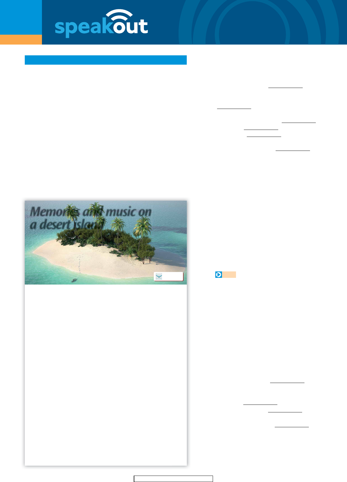 1 © Pearson Education Limited 2016 READING & LISTENING EXTRA INTERMEDIATE UNIT 1 1 Work in pairs and discuss. Is there a piece of music that is particularly important to you? Why? 2 Read the article and answer the questions. 1 What kinds of people have appeared on the programme Desert Island Discs ? 2 Do people only choose music to take on the island? 3 Read the article again. Are the sentences true (T) or false (F)? 1 Desert Island Discs is over eighty years old. 2 The guests are always TV celebrities. 3 J. K. Rowling chose a song by the Beatles. 4 You have to choose four things to take with you on the island. 5 War and Peace is a popular book with many of the guests. 6 Many people don’t want to take chocolate with them to the island. 4 Read the text again and Complete the summary of the article. Use one word or number in each gap. The article is about a 1 programme that started many years ago. The interviewer asks a guest to choose 2 songs or pieces of music they like and at the end of the programme they also have to choose a 3 item and a 4 . People o� en choose very 5 things to take with them. It’s best not to choose chocolate as it is almost certain to 6 in the heat on the island. 5 Find words in the text that have the same meaning as the words below. 1 sending out radio or television programmes 2 something you remember from the past 3 introducing new and better ideas fi rst 4 people who are invited to an event or occasion 5 individual songs 6 infl uence/e� ect 6 Work in pairs and discuss. What music tracks and books would you take with you to a desert island? Why ? 7 1.1 Listen to a radio interview about favourite books . Are the sentences true (T) or false (F)? 1 Trevor Jones is a writer. 2 His teacher made him interested in science. 3 His favourite book is about science. 4 Pip, in Great Expectations, didn’t have parents. 5 Trevor Jones had a good childhood. 6 Pip had a good childhood. 8 Complete the extracts with the correct words. Then listen again to check. 1 I am from the South of England. 2 I work on medicines that will hopefully help the of many people. 3 I had a much more upbringing 4 Pip deals with almost situations. 9 Work in pairs and discuss. What was the last book you read? Would you recommend it to someone? Why/Why not? BBC radio started broadcasting in 1927 and some of the programmes it broadcasts today are almost as old. One programme that has a long history is Desert Island Discs . For over 70 years, people from all parts of society and the world have been invited to go on the programme to talk about some of the special or interesting things that have happened to them and choose eight pieces of music that hold a special memory or meaning for them. The people who have been on Desert Island Discs range from actors and musicians to scientists and politicians. Some people are less in the public eye but have made great contributions to society, such as pioneering surgeons and scientists. It can be interesting and surprising to hear about the fascinating lives of these less-well-known guests. So what kind of music do people choose as their favourite tracks? The music is often classical but there are also a lot of modern songs, too. The author J. K. Rowling chose a mixture of music that ranged from the Beatles to Beethoven. In-between each track, she talked about her life, telling listeners about her time as a schoolgirl, and the train trip that inspired the Hogwarts Express and Harry Potter, her most famous creation. Princess Margaret, the sister of the British Queen, Elizabeth II, chose military music and also a rock song among her tracks. At the end of the programme, once the guest has talked about his/her chosen songs and the impact they have had on his/her life, it’s time to make some important decisions. The question is this: If you were sent to live on a desert island on your own, what music track, what book and what luxury item would you take with you? A book that is often chosen is War and Peace by Tolstoy, perhaps this is because it is a very long book. The luxury item can be anything as long as it is not practical and sometimes people ask for very strange things. One comedian asked for a tin of baked beans and lots of people have asked for chocolate, which would almost certainly melt on a desert island. Memories and music on a desert island 530 shares 2 © Pearson Education Limited 2016 READING & LISTENING EXTRA INTERMEDIATE UNIT 2 1 Work in pairs and discuss. 1 How o� en do you go to the cinema? 2 What was the last fi lm you saw? 2 Read the fi lm reviews. Match the fi lms with the categories 1–3. 1 cartoon 2 factual comedy 3 science fi ction 3 Read the reviews again and answer the questions. 1 What does Alan Bennett do? 2 Which fi lms are funny? 3 Who moves to a city? 4 Which fi lm is most suited for everyone? 5 Can you see all the fi lms in 3D? 4 Match the words in bold in the text with their meanings 1–6. 1 in general 2 very funny 3 bad people, o� en criminals 4 something special to make you happy 5 unhappy, rude 6 cry 5 Work in pairs and discuss. What fi lms are showing in cinemas at the moment? Which one would you like to see? Why? 6 2.1 Listen to a conversation between two friends, Amelia and Oliver, and answer the questions. 1 What happened to Amelia’s mobile phone? 2 What fi lm did Oliver see? 3 Which Bond fi lm does Amelia prefer? 4 Where did Oliver go on holiday? 5 What do they want to do next week? 6 Which fi lm do they decide to see? 7 Listen again. Are the sentences are true (T) or false (F)? Correct the false sentences. 1 Amelia saw Spectre yesterday. 2 Oliver thinks Daniel Craig is a bad actor. 3 Oliver saw some actors fi lming in Mexico City. 4 Amelia was in Mexico, too. 5 Amelia suggests going to the cinema. 6 They both want to see a funny fi lm. 8 The words in the box are from the recording. Complete the sentences with the correct form of the words in the box. extras plot charged up fancy 1 Do you going out for a pizza to