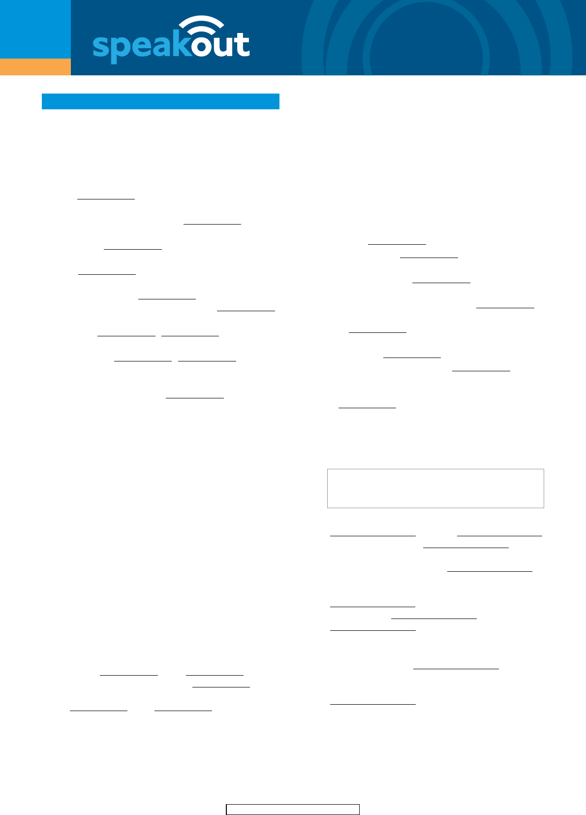 1 © Pearson Education Limited 2016 VOCABULARY EXTRA INTERMEDIATE UNIT 1 1.1 Language 1 Complete the sentences with one word in each gap. The fi rst letter in each word is given. 1 Ben is multilingual. He knows several f languages. 2 I didn’t understand the advice on this computer forum. It’s full of technical j . 3 Jorge speaks English so well that people think he’s a n speaker! 4 My students think listening is the most di� cult s to master. 5 Chatting to other students has really helped to improve my f , but I still make mistakes and need to work on my a . 6 Andrea speaks French and German, but Spanish is her m t . 7 Our teacher encourages us to use a variety of di� erent l s when we study. 8 My friend can speak two languages fl uently. I’m so jealous, I’d love to be b . 1.2 Relationships 2 Underline the correct alternatives to complete the conversations. a) A: My 1boss/godfather has given me a huge report to write for tomorrow. B: That’s because you’re his best 2employee/pupil and he knows you’ll do a great job. A: But I can’t stay late. I’ve got football tonight and my 3partners/team-mates need me. b) A: So, where did you meet your 4fiancé/fiancée? B: We were 5members/mentors of the same gym. I met him there. Then we discovered we’d gone to the same school but we’d never been 6classmates/pupils. 3 Complete the text with one word in each gap. The fi rst letter in each word is given. My wedding next year will be expensive. All eight of our brothers and sisters have kids so that means fi � een 1n and 2n . I’ve got twenty cousins on my father’s 3s and my parents divorced and remarried so that’s a 4s and 5s to invite, plus their children. Collocations 4 Circle the word or phrase in each group which does not collocate with the verb in bold. 1 take medicine a photo well an hour 2 get responsibility a salary depressed fl u 3 do well a cold you good the washing up 4 go blind by taxi a hobby with 5 Complete the sentence with the correct form of do, get, go or take. 1 I never housework. 2 We sometimes for a drink with friends. 3 He really needs to a little more exercise. 4 She gets bored easily. She quickly o� new hobbies. 5 If I grey, I’ll dye my hair! 6 Chris is always so calm. Even when his team wins, he doesn’t excited. 7 In the evenings, they like to out for a walk. 8 If you do something wrong, you should responsibility for it. 1.3 Interview advice 6 Complete the text with the words in the box. answer briefl y arrive on time avoid eye contact be prepared dress smartly doing some research shake hands show enthusiasm speak clearly To be successful in a job interview you need to 1 . Start by 2 on the company. It will 3 and the interviewer will think you are knowledgeable. Think carefully about your clothes. 4 so you make a good fi rst impression. Don’t rush to the interview. Leave home early so you 5 . When greeting the interviewer, don’t forget to 6 fi rmly and don’t 7 . Look the interviewer in the eye. Look confi dent, even if you’re nervous. When answering questions, take time to think about your answers. 8 so the interviewer can understand you. Your responses shouldn’t be too long and detailed, so 9 . With these tips you can really help improve your chances of getting your dream job. Good luck! VOCABULARY EXTRA 1 © Pearson Education Limited 2016 VOCABULARY EXTRA Focus on do 7 Find fi ve words or phrases in the box that do not go with do. 120 kilometres per hour athletics badly business a cold a course an exam your hair the ironing a good job a mess a mistake your nails nothing on a diet the shopping a train the washing yoga your best 8 Complete the diagram with the words and phrases from Exercise 7. 9 Complete the questions with the correct form of the phrases from Exercise 8. 1 You should try to in everything you try, even if it’s hard. 2 He got a ticket from the police for over on the motorway. 3 Are you going to before we go out? Brush it at least! 4 Can you tonight? I don’t have any clean clothes. 5 Have a good night’s sleep before you . You’ll get a higher grade. 6 I hate . I’d rather wear clothes with lines all over them. 7 Sales people by building good relationships with customers. 8 Are you going to lie there and all day? Get up and do some work! 9 Would you like me to for you? I can paint them purple. 10 If you , your boss might give you a promotion. 11 That test was really di� cult. I think I . 12 I’m really bad at cooking. I should at evening school. 13 Most kids learn to , such as the long jump or high jump, at school. 14 Have you ever ? It’s good exercise and helps you breathe better. work 1 2 housework 13 14 15 sport 11 12 beauty 9 10 studies 3 4 e� ort 5 6 7 speed 8 do 1 © Pearson Education Limited 2016 VOCABULARY EXTRA Crossword 10 Use the clues to complete the crossword with words and phrases from Unit 1. Across 3 leave the house to eat out (2, 3, 1, 4) 7 the new wife of my father (10) 9 the man I used to be married to (2-7) 10 a person you do something with, e.g. start a business (7) 12 your fi rst language (6, 6) 13 a man who promises in church to support a child (9) 15 informal words or phrases (5) 17 pick up an illness where you cough and sneeze (3, 1, 4) 18 My new wife’s male child is my . (7) 3 7 14 16 9 17 18 15 12 5 10 13 1 2 11 4 6 8 Down 1 reduce the amount of food you eat to lose weight (2, 2, 1, 4) 2 a child who has lessons in a subject (5) 4 a good thing you do to help someone (6) 5 the brother of my wife (7-2-3) 6 no longer working because you are too old (7) 7 to post or email information about a previous employee (4, 10) 8 a scientifi c test (10) 11 wear clothes that are clean and look good (5, 7) 12 learn something very well (6) 14 lose your eyesight (2, 5) 16 spend time on an activity you enjoy (2, 1, 5) 2 © Pearson Education Limited 2016 VOCABULARY EXTRA INTERMEDIATE UNIT 2 2.1 Types of story 1 Put the letters in the box in the correct order to make types of fi lms. Then match 