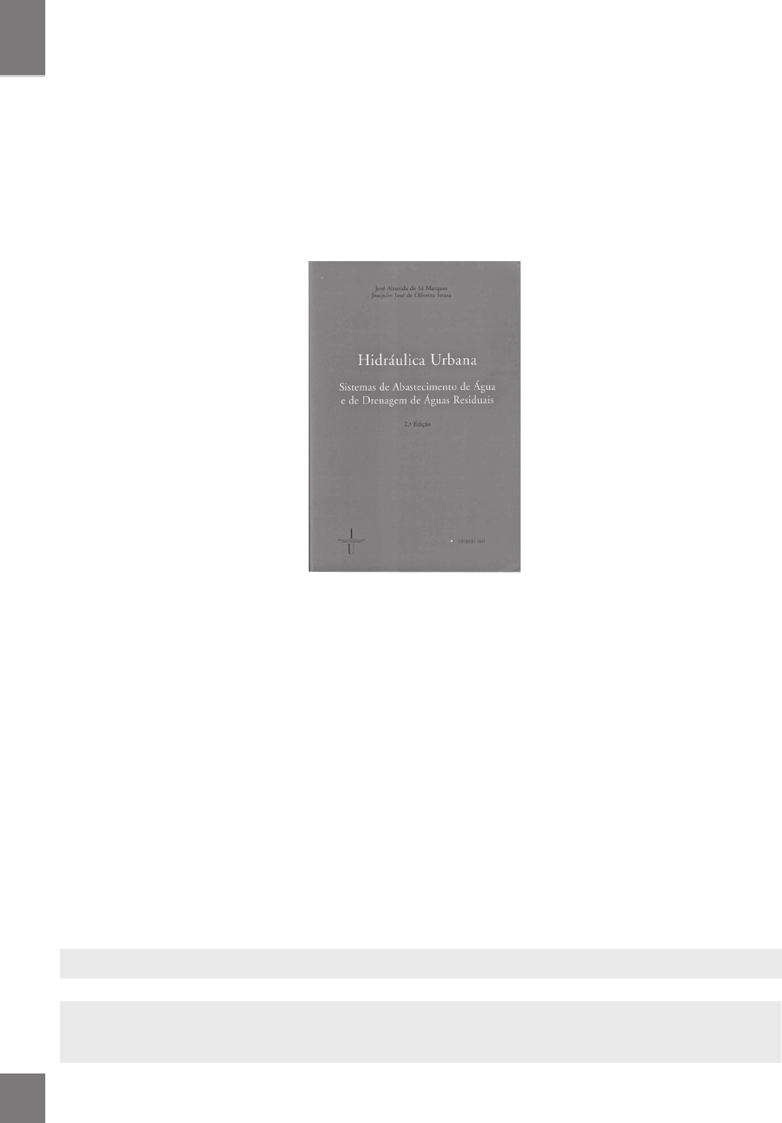 Li vr os IV Durante minha estadia na cidade do Porto para participar do 14º Simpósio Luso Brasileiro de Engenharia Sanitária e Ambiental (SILUBESA), em outubro de 2010, tive a oportunidade de conhecer este livro, que logo me chamou atenção pela qualidade e pela forma como reúne, em um só volume, os temas da Hidráulica Urbana de interesse da Engenharia Sanitária e Ambiental. Após uma breve introdução (Capítulo 1), se- guem os outros capítulos com seus respectivos con- teúdos principais: Capítulo 2 – Elementos de Base: horizonte de pro- jeto; estudos de evolução da população; consumos e variações de consumo; cálculo das vazões dos di- ferentes componentes dos sistemas de abastecimen- to de água e de drenagem de águas residuárias; Capítulo 3 – Adução: regras gerais sobre traçado em planta e em perfil; tipos de tubos e juntas; cál- culo de perdas de carga em condutas; estudo eco- nômico de adutora; vazão de dimensionamento; de- terminação da secção mais econômica; elevatórias; órgãos de manobra e segurança; assentamento das tubulações; Capítulo 4 – Reservatórios: classificação e finalida- de dos reservatórios; cálculo da capacidade dos reservatórios; aspectos fun- cionais e construtivos; Capítulo 5 – Sistemas de Distribuição de Água: traçado e tipos de redes de distribuição; condições prévias ao dimensionamento da rede; modelos mate- máticos para análise de sistemas de distribuição de água; métodos numéricos de resolução; acessórios e elementos especiais; cálculo hidráulico de um sis- tema de distribuição; Capítulo 6 – Transitórios Hidráulicos: classificação do escoamento; descri- ção física do fenômeno; regimes variáveis sob pressão; análise simplificada do choque hidráulico; Capítulo 7 – Simulação Dinâmica de Sistemas Sob Pressão: equações do mo- vimento; modelos de simulação dinâmica; Capítulo 8 – Modelação Matemática da Qualidade em Sistemas de Abastecimento de Água: formulação de base; modelos cinéticos de decaimento do cloro; méto- dos numéricos para resolução dos sistemas de equações da qualidade da água; Comentário elaborado pelo Coordenador da Coluna Livros, Professor Cícero Onofre de Andrade Neto A sessão “Livros”, que a cada edição traz resumos comentados sobre livros de interesse na área, tem como principal objetivo permitir que o leitor, de forma rápida, se atualize e conheça o que há disponível no mercado editorial. As contribuições deverão ser encaminhadas para: resa@abes-dn.org.br Hidráulica Urbana – Sistemas de Abastecimento de Água e de Drenagem de Águas Residuais José Alfeu Almeida de Sá Marques e Joaquim José de Oliveira Sousa Capítulo 9 – Sistemas de Drenagem de Águas Residuais (os portugueses não distinguem águas residuárias e águas residuais): concepção dos sistemas de drenagem de águas residuais; constituição das redes de drenagem de águas residuais domésticas; estudo do traçado das redes; va- zões de projeto; dimensionamento hidráulico-sanitário dos sistemas; implantação dos coletores; Capítulo 10 – Sistemas de Drenagem de Águas Pluviais: caudal de águas pluviais; tempo de concentração; inten- sidade da chuva; tempo de recorrência ou período de retorno; coeficiente de escoamento; avaliação do caudal; cálculo hidráulico dos coletores; coletores, galerias e ór- gãos acessórios; Capítulo 11 – Reabilitação de Condutas: técnicas para reabilitação de condutos; Anexo 1 – Cálculo de Perdas de Carga; Anexo 2 – Instalações Elevatórias. Ao final de cada capítulo, encontram-se exemplos de aplicação ou de dimensionamento, ou análise com- parativa dos métodos e técnicas expostos. Sem dúvida, é um livro muito útil para projetistas e consultores no domínio da Hidráulica Urbana, mas a forma como apresenta as soluções de engenharia para as questões da hidráulica dos sistemas de abastecimento de água e de coleta (drenagem) de esgotos e águas pluviais, em um único volume, faz dele um livro muito adequado para apoiar o ensino e a pesquisa nos cursos de graduação e pós-graduação em Engenharia Civil, Sanitária, Ambiental e correlatos. Essa forma de apresentação certamente atende às necessidades acadêmicas dos autores e professores da Universidade de Coimbra, sem perder a qualidade e os aspectos práticos necessários para o projetista. Na Universidade Federal do Rio Grande do Norte, já foi indicado para as turmas de 2011 dos cursos de Engenharia Civil (disciplinas Saneamento do Meio e Sistemas Urbanos de Água e Esgotos) e do Mestrado em Engenharia Sanitária (disciplina Águas Urbanas), por dois professores desses cursos. Pode ser adquirido acessando-se o site http://siglv.uc.pt/imprensa (ven- das online). Também fica o exemplo e a motivação provocativa para nossos colegas brasileiros que têm capacidade de produzir um livro com a mesma forma, reunindo a Hidráulica Urbana em um só volume.
