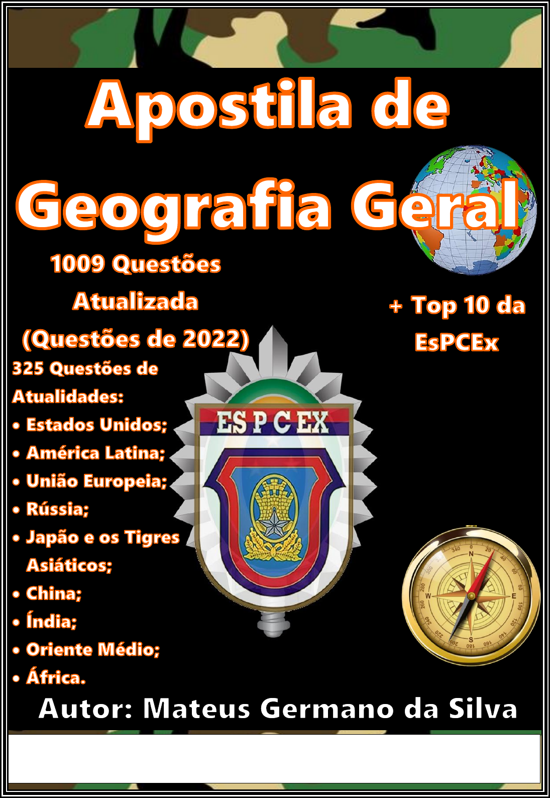 Aluno: . Autor: Mateus Germano da Silva Instagram: @mateus.germano.2001 Concursos Militares abordados: EsPCEx Sumário • Conteúdo Programático da EsPCEx--------------------------------------------------------- 6 • Relação de questões da EsPCEx em cada assunto ---------------------------------------- 7 • Top 10 de Geografia da EsPCEx ------------------------------------------------------------- 7 Localizando-se no Espaço e Cartografia -------------------------------------- 8 • Coordenadas Geográficas e fusos horários ---------------------------------------------------- 8 • Projeções Cartográficas e as várias formas de representação da superfície terrestre --- 10 • Escalas Cartográficas --------------------------------------------------------------------------- 13 • Gabarito ------------------------------------------------------------------------------------------- 15 Espaço Natural ------------------------------------------------------------------- 16 • Geologia Geral ---------------------------------------------------------------------------------- 16 ➢ Interior Terrestre, Estrutura Geológica e Tipos de Rochas ---------------------------- 16 ➢ Agentes Endógenos × Agentes Exógenos e Formação de Relevo -------------------- 18 ➢ Gabarito --------------------------------------------------------------------------------------- 22 • Atmosfera e Buraco na Camada de Ozônio ----------------------------------------------- 23 ➢ Gabarito --------------------------------------------------------------------------------------- 26 • Climatologia Geral ----------------------------------------------------------------------------- 27 ➢ Fatores Climáticos --------------------------------------------------------------------------- 27 ➢ Zonas Climáticos e Fenômenos Climáticos ---------------------------------------------- 28 ➢ Climogramas e Tipos de Climas ---------------------------------------------------------- 30 ➢ Anomalias Climáticas ----------------------------------------------------------------------- 33 ➢ Gabarito --------------------------------------------------------------------------------------- 35 • Domínios Naturais ----------------------------------------------------------------------------- 36 ➢ Gabaritos ------------------------------------------------------------------------------------- 43 • As Superfícies Líquidas ----------------------------------------------------------------------- 44 ➢ Oceanos e Mares ---------------------------------------------------------------------------- 44 ➢ Correntes Marítimas ------------------------------------------------------------------------ 45 ➢ Gabaritos ------------------------------------------------------------------------------------- 48 • Recursos Hídricos e Situações Hidroconflitivas ------------------------------------------ 49 ➢ Recursos Hídricos e Bacias Hidrográficas ----------------------------------------------- 49 ➢ Situações Hidroconflitivas ----------------------------------------------------------------- 54 ➢ Gabaritos ------------------------------------------------------------------------------------- 56 • Solos ----------------------------------------------------------------------------------------------- 57 ➢ Gabarito --------------------------------------------------------------------------------------- 60 Espaço Político e Econômico --------------------------------------------------- 61 • Industrialização --------------------------------------------------------------------------------- 61 ➢ Gabarito --------------------------------------------------------------------------------------- 68 • Fontes de Energia ------------------------------------------------------------------------------ 69 ➢ Matriz Energética Mundial ----------------------------------------------------------------- 69 ➢ Geopolítica do Petróleo --------------------------------------------------------------------- 74 ➢ Gabarito --------------------------------------------------------------------------------------- 78 • Impactos Ambientais -------------------------------------------------------------------------- 79 ➢ Gabarito --------------------------------------------------------------------------------------- 86 • Agropecuária ------------------------------------------------------------------------------------ 87 ➢ Gabarito --------------------------------------------------------------------------------------- 94 • Globalização e Circulação -------------------------------------------------------------------- 95 ➢ Gabarito --------------------------------------------------------------------------------------- 98 • Transportes -------------------------------------------------------------------------------------- 99 ➢ Gabarito ------------------------------------------------------------------------------------- 105 • Comércio Mundial ---------------------------------------------------------------------------- 106 ➢ Gabarito ------------------------------------------------------------------------------------- 112 • Blocos Econômicos --------------------------------------------------------------------------- 113 ➢ Gabarito ------------------------------------------------------------------------------------- 122 • Conflitos Étnicos e Armados no Mundo ------------------------------------------------- 123 ➢ Conflitos Étnicos e Separatistas ---------------------------------------------------------- 123 ➢ Terrorismo ---------------------------------------------------------------------------------- 127 ➢ Gabarito ------------------------------------------------------------------------------------- 132 • Divisão Internacional do Trabalho (DIT) e as Trocas Desiguais ------------------- 133 ➢ Gabarito ------------------------------------------------------------------------------------- 136 • Nação, Territó