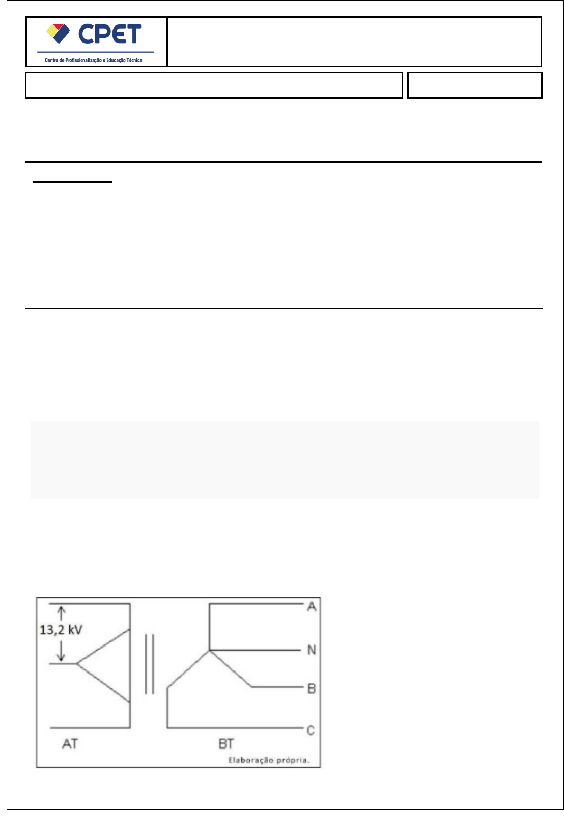 Atividade Prática I INSTRUÇÕES:  Esta Atividade contém questões totalizando 10 (dez) pontos;  Você deve preencher dos dados no Cabeçalho para sua identificação: o Nome /CPF/Data  As respostas devem ser digitadas abaixo de cada pergunta;  Ao terminar salve o arquivo no formato .PDF ou .DOCX;  Envio o arquivo pelo sistema no local indicado;  Em caso de dúvidas consulte o seu Tutor.  ATENÇÃO O NÃO PREENCHIMENTO DOS DADOS ACARRETARÁ NA ANULAÇÃO DA ATIVIDADE. Aluno(a): Walisson Silva De Souza CPF:047416111-08 Data:10/04/2024 Maquinas elétrica (2024) Atividade Prática Questão 1: Um transformador monofásico tem tensão no primário de 220 V e tensão no secun- dário de 11 V. O secundário tem 100 espiras e alimentará uma carga de 500 W. Qual o número de espiras no primário (N1), a corrente circulante do primário (IP) e a corrente circulante do se- cundário (IS) do transformador? R: Número de espiras no primário (N1): 4.400 espiras Corrente circulante do primário (IP): 2,27 A corrente circulante do secundário (IS) é 45,45 A do transformador. Questão 2: Na figura abaixo temos um transformador , qual seria as tensões de fase e de linha no lado de baixa tensão? Sabe-se que a relação de transformação é 60:1. Serviços de Turismo e Viagens - GUI R:Considerando que a relação de transformação é 60:1, a tensão de linha no lado de baixa tensão será 1/60 da tensão de linha no lado de alta tensão. Portanto, se a tensão de linha no lado de alta tensão for, por exemplo, 13800V, a tensão de linha no lado de baixa tensão será 13800V/60 = 230V. Já a tensão de fase no lado de baixa tensão será igual à tensão de linha dividida pela raiz quadrada de 3, ou seja, 230V/√3 = 132,8V (aproximadamente). Questão 3 : O eixo de um motor de indução trifásico, que possui 4 pólos e opera com escorrega- mento de 5% em plena carga, está conectado a uma rede elétrica de 60 Hz. Qual é a velocidade de rotação alcançada pelo eixo do motor? R: A velocidade síncrona de um motor de indução trifásico com 4 polos conectado a uma rede elétrica de 60 Hz é de 1800 RPM (rotações por minuto). Com um escorregamento de 5% em plena carga, a velocidade de rotação alcançada pelo eixo do motor será de: Veloci- dade = Velocidade síncrona x (1 - Escorregamento) Velocidade = 1800 x (1 - 0,05) Velocida- de = 1710 RPM Portanto, a velocidade de rotação alcançada pelo eixo do motor será de 1710 RPM