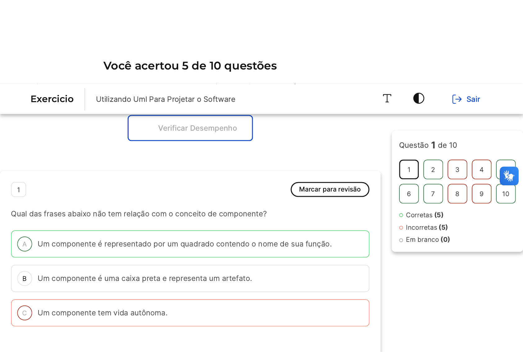 Você acertou 5 de 10 questões Verifique o seu desempenho e continue treinando! Você pode refazer o exercício quantas vezes quiser. Verificar Desempenho A B C 1 Marcar para revisão Qual das frases abaixo não tem relação com o conceito de componente? Um componente é representado por um quadrado contendo o nome de sua função. Um componente é uma caixa preta e representa um artefato. Um componente tem vida autônoma. Questão 1 de 10 Corretas �5� Incorretas �5� Em branco �0� 1 2 3 4 5 6 7 8 9 10 Exercicio Utilizando Uml Para Projetar o Software Sair D E Um componente oferece e requer serviços. Os componentes fazem uso de estereótipos. Resposta incorreta Opa! A alternativa correta é a letra A. Confira o gabarito comentado! Gabarito Comentado A alternativa A afirma que "Um componente é representado por um quadrado contendo o nome de sua função". No entanto, essa afirmação não está correta. O conceito de componente não está relacionado à sua representação gráfica, mas sim à sua funcionalidade e ao papel que desempenha em um sistema. Um componente é uma unidade modular e independente que realiza uma função específica dentro de um sistema maior. Ele pode ser uma "caixa preta", ou seja, um artefato cujo funcionamento interno não é conhecido ou relevante para o restante do sistema �Alternativa B�, pode ter vida autônoma �Alternativa C�, pode oferecer e requerer serviços �Alternativa D� e pode fazer uso de estereótipos �Alternativa E�. Portanto, a alternativa A é a única que não tem relação com o conceito de componente. 2 Marcar para revisão O que é um diagrama de implementação? A B C D E É um conjunto de elementos que define como o sistema funciona. É um conjunto de elementos que define a estrutura de módulos de um sistema. É um conjunto de elementos que define o ambiente do sistema. É um conjunto de elementos que define a arquitetura de execução dos sistemas. É um conjunto de elementos que define o processo de execução do sistema. Resposta correta Parabéns, você selecionou a alternativa correta. Confira o gabarito comentado! Gabarito Comentado O diagrama de implementação é um componente do UML �Unified Modeling Language) que é usado para modelar a arquitetura física de um sistema. Ele descreve a organização do hardware e como o software é mapeado para o hardware. Portanto, a alternativa correta é a D� "É um conjunto de elementos que define a arquitetura de execução dos sistemas". A B C D E 3 Marcar para revisão Qual a notação da UML para representar uma dependência num diagrama de classes? Uma reta tracejada ligando as classes envolvidas. Uma seta cheia ligando as classes envolvidas. Uma seta tracejada ligando as classes envolvidas. Uma reta cheia ligando as classes envolvidas. Uma reta curva ligando as classes envolvidas. Resposta incorreta Opa! A alternativa correta é a letra B. Confira o gabarito comentado! Gabarito Comentado Na notação UML, uma dependência em um diagrama de classes é representada por uma seta cheia ligando as classes envolvidas. Isso significa que uma classe depende de outra para A B C D E funcionar corretamente. Portanto, a alternativa correta é a opção B� "Uma seta cheia ligando as classes envolvidas". 4 Marcar para revisão Qual dos passos abaixo não diz respeito à criação de um diagrama de interação: Determine o caso de uso que será modelado e identifique suas operações. Para cada operação, identifique os objetos que farão parte da sua interação. Identifique as classes de análise que serão modeladas no projeto. Identifique as conexões e relacionamentos entre eles e, em seguida, categorize-os. Identifique a sequência de fluxos de mensagens na interação entre os objetos. Resposta incorreta Opa! A alternativa correta é a letra C. Confira o gabarito comentado! A B C Gabarito Comentado A alternativa correta é a C� "Identifique as classes de análise que serão modeladas no projeto". Isso porque a criação de um diagrama de interação envolve a identificação de casos de uso, operações, objetos envolvidos na interação, conexões e relacionamentos entre eles, e a sequência de fluxos de mensagens. No entanto, a identificação das classes de análise que serão modeladas no projeto não é um passo diretamente relacionado à criação de um diagrama de interação, mas sim a uma etapa posterior do processo de modelagem. 5 Marcar para revisão Quais são os dois tipos de diagrama de interação: Diagrama de classe e diagrama de sequência Diagrama de sequência e diagrama de componentes Diagrama de classes e diagrama de estados D E Diagrama de sequência e diagrama de comunicação Diagrama de atividades e diagrama de estados Resposta correta Parabéns, você selecionou a alternativa correta. Confira o gabarito comentado! Gabarito Comentado Os dois tipos de diagrama de interação são o diagrama de sequência e o diagrama de comunicação. O diagrama de sequência é utilizado para visualizar a interação entre diferentes partes de um sistema. Ele mostra como as mensagens são trocadas entre essas partes ao longo do tempo. Já o diagrama de comunicação é usado para visualizar a interação entre objetos ou partes de um sistema. Ele mostra como as mensagens são trocadas entre esses objetos ou partes, mas não necessariamente em uma sequência de tempo. Portanto, a alternativa correta é a D� Diagrama de sequência e diagrama de comunicação. 6 Marcar para revisão Quais os tipos de visibilidade de um atributo numa classe? A B C D E Pública, protegida, privativa e pacote Pública, segura, privativa e pacote Restrita, protegida, privativa e controle Pública, protegida, segura e pacote Restrita, protegida, privativa e pacote Resposta correta Parabéns, você selecionou a alternativa correta. Confira o gabarito comentado! Gabarito Comentado Os tipos de visibilidade de um atributo em uma classe são: pública, protegida, privativa