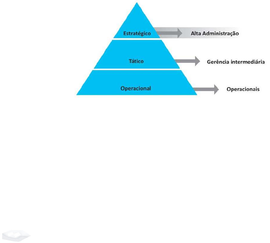 38 Bacharelado em Administração Pública Teorias da Administração I NÍVEIS DE ADMINISTRAÇÃO Estudamos no tópico anterior as funções administrativas que são desenvolvidas nas organizações nos seus mais diversos níveis. Mas você sabe que níveis são esses? Teoricamente, são três os níveis de administração: o estratégico, o tático e o operacional. Veja na Figura 3: Figura 3: Níveis de administração Fonte: Elaborada pelos autores 39 Módulo 1 Unidade 2 – As funções administrativas e organizacionais No nível administrativo ou estratégico a competência básica é traduzir as incertezas de um mercado altamente dinâmico, visando o estabelecimento de objetivos. Através das atividades de planejamento, organização e controle, de forma coordenada, objetiva-se atingir os macro-objetivos da organização. As decisões estratégicas são normalmente de longo prazo e tomadas no alto escalão da empresa, por isso, geram atos cujos efeitos são duradouros e mais difíceis de inverter. Já no nível tático ou intermediário temos as estratégias, em planos e projetos, a serem realizadas pelo nível operacional. O tempo de planejamento no nível tático é o de médio prazo. Neste nível há menos dúvidas para as tomadas de decisões, por isso são mais facilmente revistas, quando necessárias e de menos impacto no funcionamento estratégico da empresa. O imperativo é que cada área ou função tenha seus planos específicos, os quais estejam interligados umbilicalmente às ações estratégicas da companhia como um todo. Enquanto no nível operacional ou mais baixo da organização, os administradores executam os projetos. Neste nível as decisões operacionais estão ligadas ao controle e às atividades operacionais da empresa e são eminentemente técnicas. Aqui o tempo do planejamento é o curto prazo.