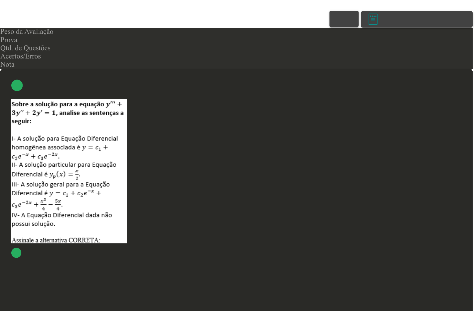 Prova Impressa GABARITO | Avaliação I - Individual (Cod.:956519) Peso da Avaliação 2,00 Prova 79366863 Qtd. de Questões 10 Acertos/Erros 9/1 Nota 9,00 Para encontrar a solução geral de uma Equação Diferencial de ordem superior não homogênea, devemos encontrar a solução para equação homogênea associada e a solução particular yp. A solução geral é dada pela soma das soluções homogênea associada e particular. A As sentenças I e II estão corretas. B Somente a sentença IV está correta. C As sentenças I e III estão corretas. VOLTAR A+ Alterar modo de visualização 1 D As sentenças II e III estão corretas. Uma Equação Diferencial de ordem n pode ser escrita na forma: A Quando temos uma equação de ordem superior linear, homogênea com coeficientes constantes, não é possível encontrar a solução por meio de uma equação característica. B Para encontrar a solução geral das equações de ordem n não homogêneas, não basta encontrar a solução para a equação homogênea associada, a solução particular e fazer uma combinação linear destes resultados. C Para resolver um Problema de Valor Inicial que envolve uma equação de ordem n, precisamos de n condições iniciais. D Os Problemas de Valor Inicial que envolvem equações diferenciais de ordem n, possuem infinitas soluções. O método dos coeficientes indeterminados é utilizado para encontrar a solução particular de Equações Diferenciais não homogêneas. O método baseia-se em supor que a função solução yp possui uma forma semelhante à função g(x), retirada de equações do tipo: 2 3 A Somente a sentença I está correta. B Somente a sentença IV está correta. C Somente a sentença III está correta. D Somente a sentença II está correta. A solução geral de uma equação diferencial é uma família de funções que satisfazem a equação e estão ligadas por um ou mais parâmetros. A solução particular de uma equação diferencial é uma função que satisfaz a equação, neste caso, a função é única pois é livre de parâmetros. Sobre as 4 soluções gerais e particulares, analise as sentenças a seguir: A Somente a sentença II está correta. B As sentenças I e III estão corretas. C Somente a sentença I está correta. D As sentenças II e III estão corretas. Revisar Conteúdo do Livro As Equações Diferenciais lineares homogêneas de segunda ordem com coeficientes constantes, são aquelas que podem ser escritas na forma: A As sentenças I e IV estão corretas. B As sentenças II e III estão corretas. C As sentenças I e III estão corretas. D As sentenças II e IV estão corretas. 5 Resolver uma Equação Diferencial é encontrar uma função y(x) que ao ser substituída na equação, mantém a igualdade verdadeira. Essa função y(x) é chamada de solução da equação. A Somente a opção III está correta. B Somente a opção IV está correta. C Somente a opção I está correta. D Somente a opção II está correta. Existem diversos métodos para encontrar a solução de Equações Diferenciais, cada método é útil para certo tipo de equação, geralmente, decidimos qual método utilizar por meio da classificação das equações. Sobre a classificação de Equações Diferenciais, classifique V para as sentenças verdadeiras e F para as falsas: ( ) Podem ser classificadas como Lineares (não possuem derivadas), Ordinárias (possuem derivadas ordinárias) ou Parciais (possuem derivadas parciais). ( ) Podem ser classificadas de acordo com a derivada de maior ordem da equação. ( ) Podem ser classificadas como lineares sempre que y e suas derivadas são de primeiro grau, ou seja, y e suas derivadas estão sendo elevados à primeira potência. ( ) Podem ser denominadas como lineares quando satisfazem duas condições: os coeficientes de y e suas derivadas dependem no máximo de uma variável; a função y e suas derivadas são de primeiro grau, ou seja, y e suas derivadas estão sendo elevados à primeira potência. Assinale a alternativa que apresenta a sequência CORRETA: 6 7 A V - F - V - F. B F - V - F - V. C V - F - F - V. D F - V - V - V. Equações Diferenciais lineares de primeira ordem são aquelas que podem ser escritas na forma: A Somente a sentença II está correta. B Somente a sentença I está correta. 8 C As sentenças I e III estão corretas. D As sentenças I e II estão corretas. A solução de Equações de Cauchy-Euler homogêneas é dada por meio de uma equação característica. Basta dividir a equação dada pelo coeficiente da derivada de maior ordem, resolver a equação característica e a depender da solução da equação característica, utilizar a fórmula adequada. Sobre as equações homogêneas e sua solução, associe os itens, utilizando o código a seguir e assinale a alternativa que apresenta a sequência CORRETA: A III - I - II. B I - II - III. C II - I - III. D II - III - I. 9 Para encontrar a solução das Equações de Cauchy-Euler homogêneas de segunda ordem, precisamos resolver a equação característica: A Somente a sentença III está correta. B Somente a sentença IV está correta. C Somente a sentença II está correta. D Somente a sentença I está correta. 10 Imprimir
