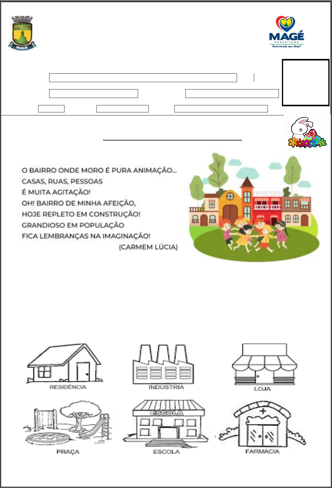 PREFEITURA MUNICIPAL DE MAGÉ SECRETARIA MUNICIPAL DE EDUCAÇÃO E CULTURA E.M. JOÃO ESPERIDIÃO DOS SANTOS PROVA DO 1º BIMESTRE Aluno: Disciplina: GEOGRAFIA Professor(a): AVALIAÇÃO DE GEOGRAFIA Ano/ Série: 2º Ano Ensino: Fundamental Data: / / VALOR: 100 NOTA:____ DE ACORDO COM O TEXTO RESPONDA: (12) 1) QUAL O ASSUNTO DO POEMA? ____________________________________________________________________. 2) OBSERVANDO AGORA O SEU BAIRRO, PINTE AQUILO QUE ENCONTRAMOS NELE: (5) HÁ DIFERENTES TIPOS DE BAIRROS. ELES PODEM SER: RESIDÊNCIAIS: ONDE ENCONTRAMOS RESIDÊNCIAS, COMO CASAS ONDE MORAM PESSOAS. COMERCIAIS: ONDE SE LOCALIZA O COMERCIO, COMO AS LOJAS QUE VENDEM DIVERSAS MERCADORIAS. INDUSTRIAIS: ONDE AS FÁBRICAS E INDÚSTRIAS PRODUZEM ALIMENTOS, TECIDOS, ROUPAS... ENTRE OUTROS. 4) AGORA É A SUA VEZ, CLASSIFIQUE AS IMAGENS ABAIXO DE ACORDO COM CADA TIPO DE BAIRRO: (20) 5) CONHECEMOS DURANTE AS AULA DIVERSOS TIPOS DE MEIOS DE COMUNICAÇÃO, SENDO ELES ANTIGOS OU ATUAIS. SENDO ASSIM, VAMOS FORMAR O NOME DE ALGUNS MEIOS SEGUINDO O QUADRO: (20) 3) QUAL MATERIAL É UTILIZADO NA CONSTRUÇÃO DAS MORADIAS ABAIXO? MARQUE UM “X” NA OPÇÃO CORRETA: (15) TODO PROFISSIONAL PARA EXERCER SUA FUNÇÃO UTILIZA DE OBJETOS ESPECÍFICOS. 6) RELACIONE O NOME DO PROFISSIONAL AO INSTRUTUMENTO UTILIZADO POR ELE PARA EXERCER SUA PROFISSÃO: ( 10) 7) DE ACORDO COM OS MEIOS DE TRANSPORTE, CLASSIFIQUE OS MEIOS SEGUINDO OS NÚMEROS PARA CADA UM: (18) BOA PROVA! VOCÊ VAI FAZER SUCESSO!! PREFEITURA MUNICIPAL DE MAGÉ SECRETARIA MUNICIPAL DE EDUCAÇÃO E CULTURA E.M. JOÃO ESPERIDIÃO DOS SANTOS PROVA DO 1º BIMESTRE Aluno: N.º: Disciplina: ARTES Professor(a): AVALIAÇÃO DE ARTES Ano/ Série: 2º Ano Ensino: Fundamental Data: / / VALOR: 100 NOTA:____ 1)OBSERVE AS OBRAS ABAIXO. NELAS SÃO UTILIZADAS ALGUNS TIPOS DE LINHAS. 2)CONHECENDO O PONTILHISMO, TÉCNICA PINTURA QUE CONSISTE EM PINTAR, PREENCHER O DESENHO USANDO PONTINHOS DE TINTAS OU CANETINHA. FAÇA O PREENCIMENTO DO DESENHO COM A TECNICA DO PONTILHISMO. (30) A) ESCREVA O NOME DE DOIS TIPOS DE LINHAS UTILIZADAS NA OBRA DE NÚMERO “1”: (15) ___________________________________________________________________________. B) QUAL O TIPO DE LINHA É MAIS UTILIZADO NA OBRA DE NÚMERO “2”? (15) ___________________________________________________________________________. 1 2 BOA PROVA, TENHA MUITO CAPRICHO! CORES QUENTES: SÃO AQUELAS ASSOCIADAS AO SOL, SANGUE, FOGO E QUE TRANSMITEM SENSAÇÕES DE ALEGRIA, CALOR, DESCONTRAÇÃO. CORES FRIAS: SÃO AQUELAS CORES QUE ESTÃO ASSOCIADAS AO GELO, À ÁGUA, À LUA, AS QUAIS TRANSMITEM A SENSAÇÃO DE FRIO. 3) AGORA É A SUA VEZ! (20) A) PINTE A PAISAGEM COM CORES FRIAS: B) PINTE A PAISAGEM COM AS CORES QUENTES: A) QUAL O NOME DO(A) ARTISTA QUE PINTOU ESTA OBRA? (10) ( ) ROMERO BRITTO. ( ) VAN GOGH. ( )TARSILA DO AMARAL. B) CIRCULE QUAIS SERES VIVOS APARECEM NA OBRA: (10) PESSOAS ANIMAIS PLANTAS 4) OBSERVE A OBRA E RESPONDA: PREFEITURA MUNICIPAL DE MAGÉ SECRETARIA MUNICIPAL DE EDUCAÇÃO E CULTURA E.M. JOÃO ESPERIDIÃO DOS SANTOS PROVA DO 1º BIMESTRE Aluno: N.º: Disciplina: CIÊNCIAS Professor(a): AVALIAÇÃO DE CIÊNCIAS Ano/ Série: 2º Ano Ensino: Fundamental Data: / / VALOR: 100 NOTA:____ SERES VIVOS E NÃO VIVOS NO NOSSO AMBIENTE PODEMOS ENCONTRAR SERES VIVOS E SERES NÃO VIVOS. OS SERES VIVOS NASCEM, CRESCEM, ALIMENTAM-SE, REPRODUZEM, ENVELHECEM E MORREM. OS SERES NÃO VIVOS SÃO AQUELES QUE NÃO TEM VIDA. 1) NUMERE CORRETAMENTE. (12) 2) PROCURE NO CAÇA-PALAVRAS OS NOMES DOS DESENHOS FAZEM PARTE DOS SERES VIVOS E SERES NÃO VIVOS. (24) MENINA - GATO – CANETA – PEDRA – CACHORRO – BALÃO – BONECA – SAPO. 4) DE ACORDO COM A IMAGEM ACIMA: (6) A) ESCREVA OS NOMES DOS ANIMAIS DOMESTICOS: ____________________________________________________________________________ ___________________________________________________________________________. B) ESCREVA O NOME DOS ANIMAIS SILVESTRES: (6) ____________________________________________________________________________ ___________________________________________________________________________, OS ANIMAIS DOMESTICOS VIVEM JUNTOS ÀS PESSOAS. JÁ OS ANIMAIS SILVESTRES VIVEM SOLTOS NA NATUREZA. 3) ESCREVA O NOME DO GRUPO QUE PERTENCE CADA UM DOS ANIMAIS: (14) 5) NUMERE A COLUNA DE ACORDO COM AS FUNÇÕES DAS PLANTAS: (20) ( ) GUARDA AS SEMENTES. ( ) É O ORGÃO REPRODUTOR DA PLANTA. DÁ ORIGEM AOS FRUTOS. ( ) É POR ELA QUE AS PLANTAS ABSORVEM OXIGÊNIO DO AR E SOLTAM GÁS CARBÔNICO E ÁGUA. ( ) SUSTENTA OS GALHOS E TRASPORTA ALIMENTOS PARA A PLANTA. ( ) FIXA A PLANTA AO SOLO E RETIRA DA TERRA ÁGUA COM SAIS MISERAIS. (1) FRUTO (2) FLOR (3) FOLHA (4) CAULE (5) RAIZ _____________________________________ ______________________________________ BOA PROVA, VOCÊ É 10!!! 6) 7) 8) (10) VARRER (4) (4)