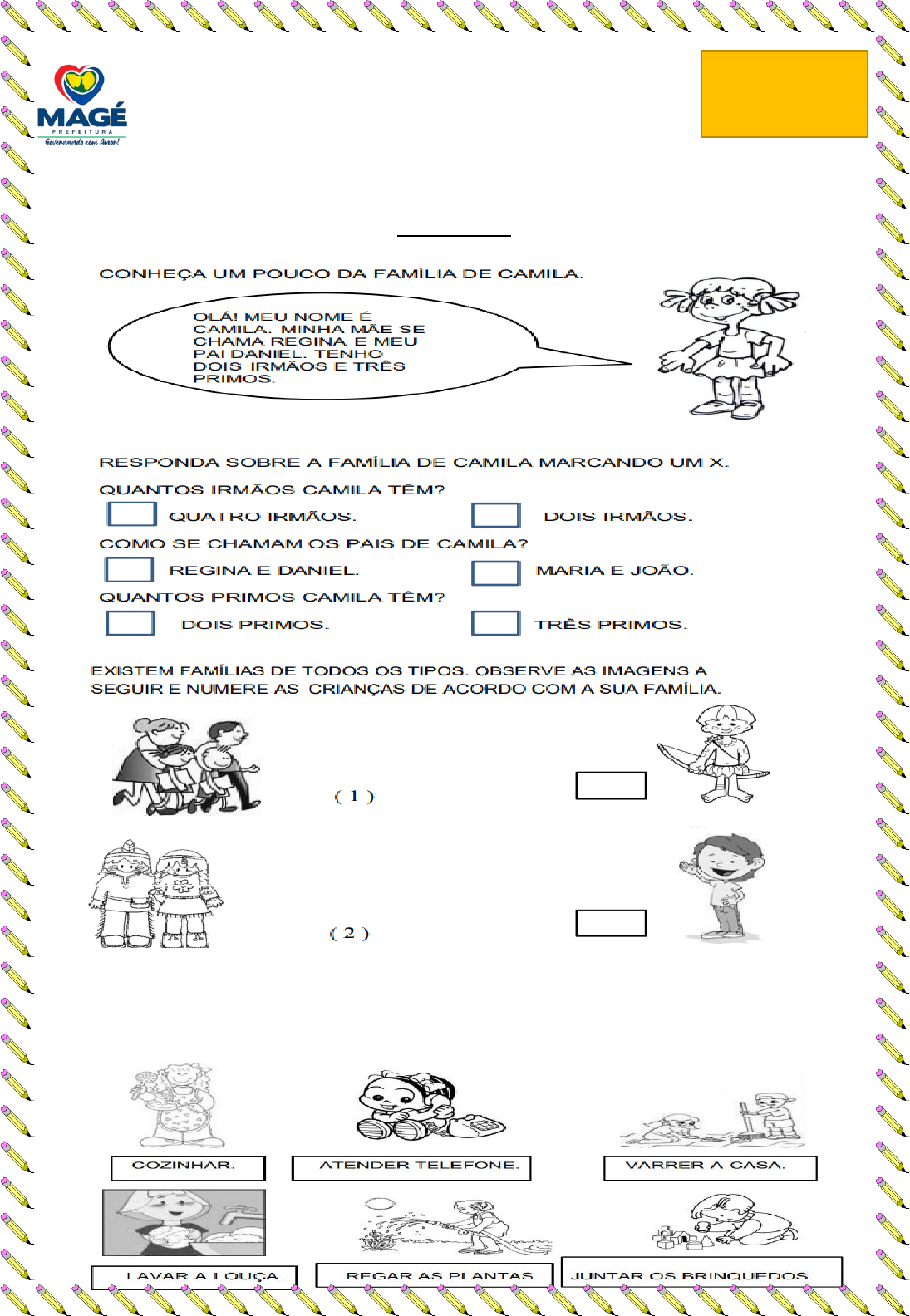 ESCOLA MUNICIPAL JOÃO ESPERIDIÃO DOS SANTOS ALUNO(A):______________________________________. PROFESSORA: AMANDA ANO/SÉRIE: 103. DATA: ____ / ______ / 2023. AVALIAÇÃO DE HISTÓRIA 2º Bimestre OBSERVE AS FIGURAS ABAIXO E PINTE AQUELAS QUE VOCÊ JÁ APRENDEU E REALIZA AJUDANDO SUA FAMÍLIA. Valor: 100 Nota:______ ___ QUESTÃO 1- QUESTÃO 2- (2,0) (0,5) - FAZEMOS PARTE DE UM BAIRRO. PINTE O QUE HÁ EM SEU BAIRRO. QUESTÃO 3- QUESTÃO 3- LEIA O TEXTO: QUESTÃO 4- (1,0) (1,0) (1,0) O QUE FAZ PARTE DO BAIRRO EM QUE VOCÊ MORA? MARQUE UM “x” NOS QUADRINHOS CORRESPONDENTES. LOJAS ESTRADA PRAÇA PONTE CASAS LAGO RUAS RIO PRÉDIO ESCREVA O NOME DO SEU BAIRRO:_____________________________________. APRENDEMOS SOBRE A HISTÓRIA DA NOSSA CIDADE DE MAGÉ, E SEUS PONTOS TÚRISTICOS, COM O PROJETO: “MAGÉ, MEU AMBIENTE”. DESENHE AGORA, COM MUITO CAPRICHO UM PONTO TÚRISTICO QUE VOCÊ GOSTOU DE APRENDER: QUESTÃO 5- QUESTÃO 6- MARQUE V PARA VERDADEIRO E F PARA FALSO: QUESTÃO 8- (1,0) (1,0) (1,0) (1,0) QUESTÃO 7- ESCOLA MUNICIPAL JOÃO ESPERIDIÃO DOS SANTOS ALUNO(A):______________________________________. PROFESSORA: AMANDA ANO/SÉRIE: 103. DATA: ____ / ______ / 2023. AVALIAÇÃO DE ARTES 2º Bimestre CONGADA, CONGADO OU CONGO, É UMA EXPRESSÃO CULTURAL E RELIGIOSA QUE ENVOLVE: ( ) A PINTURA, A ESCULTURA, E A BRINCADEIRA. ( ) A BRINCAEIRA, A MÁGICA, E A DANÇA. ( ) A DANÇA, O CANTO E O TEATRO. Valor: 100 Nota:______ ___ QUESTÃO 1- QUESTÃO 2- QUESTÃO 3- (1,0) (1,0) (2,0) O CONGO E O JONGO, SÃO DANÇAS DE ORIGEM: ( ) ESPANHOLA ( ) AMERICANA ( ) AFRO-BRASILEIRA FAÇA O COMPLEMENTO DO INSTRUMENTO “TAMBOR”, QUE É MUITO UTILIZADO NAS DANÇAS DO CONGO. O QUADRO “CIRANDA” DE IVAN CRUZ REPRESENTA UM ESTILO DE: ( ) PEÇA DE TEATRAL. ( ) DANÇA. ( ) ESCULTURA. ( ) PINTURA. QUESTÃO 4- QUESTÃO 5- QUESTÃO 6- (1,0) (1,0) (1,0) AS FESTAS JUNINAS SÃO REPLETAS DE CANÇÕES E DIVERSÃO. É POSSÍVEL DANÇAR DIVERSOS RITMOS NO SÃO JOÃO, COMO O FORRÓ, A QUADRILHA, E O BAIÃO. VAMOS COLORIR E FESTEJAR O DESENHO DESTA ÉPOCA TÃO ESPECIAL!! QUESTÃO 7- (2,0)