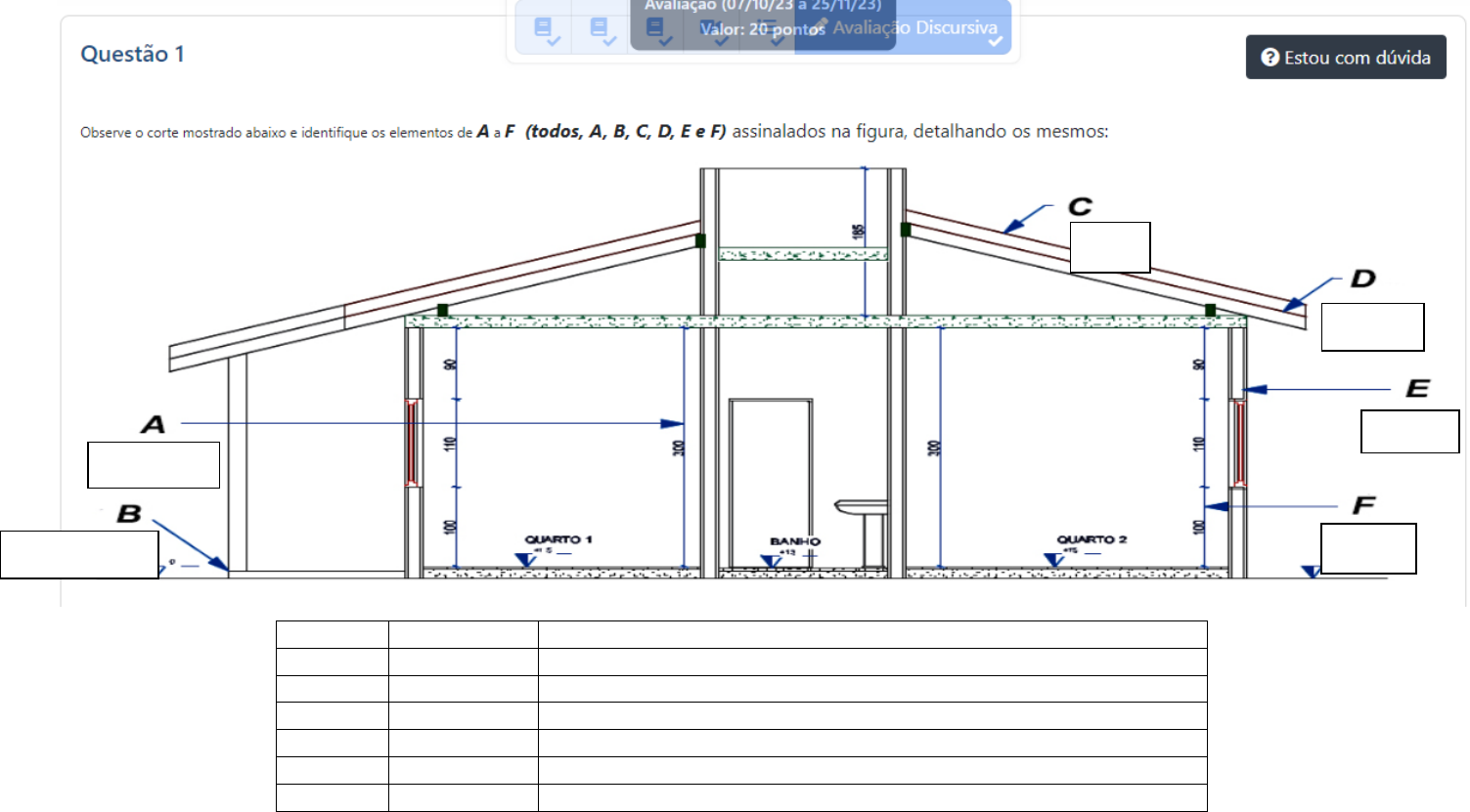 Indicação Elementos Descrição A Pé direito Altura do piso ao forro ou parte mais baixa da cobertura ao piso. B Embasamento Diferença de altura entre o terreno e o piso. C Água Cada porção plana e inclinada de uma cobertura. D Beiral Parte saliente de um telhado que protege a parede contra chuva e sol. E Verga Pequena vigia na parte superior da porta ou janela. F Peitoril Parte inferior da janela ou altura desta parte até o piso. Pé direito Embasamento Água Beiral Verga Peitoril