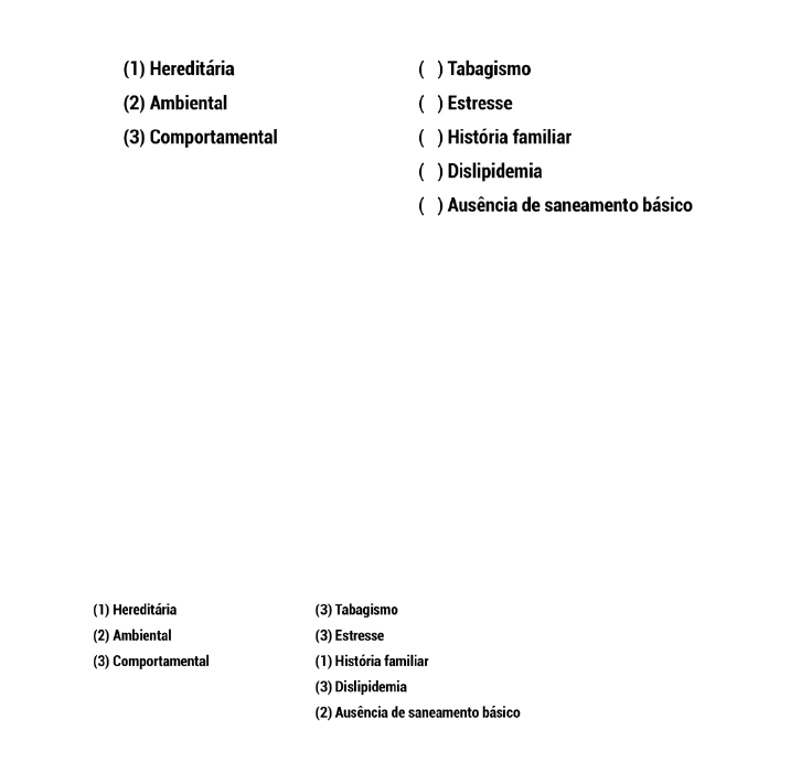 Desafio - Fatores de risco Você atendeu em seu consultório cinco pacientes que apresentaram fatores de risco diferentes, você precisa associá-los a uma origem específica, hereditária, ambiental e comportamental. Pensando nisso, associe as duas colunas e após descreva a sequência numérica correta: Para realizar esta atividade, você deverá atender aos seguintes itens: 1. Revisar a origem dos fatores de risco e suas classificações. 2. Associar as duas colunas identificando a segunda conforme os números da primeira. 3. Descreva a sequência correta de números. Resposta padrão esperado 2. 3 - Sequência numérica: 3, 3, 1, 3, 2. image1.png image2.png