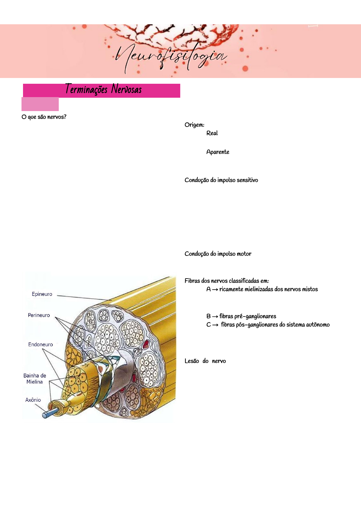 Sandy Vanessa Med 08 - UFPE-CAA Terminações Nervosas Nervos O que são nervos? ● Cordões esbranquiçados constituídos por feixes de fibras nervosas reforçadas por tecido conjuntivo ● Unem o SNC aos órgãos periféricos ○ Conduzem impulsos de um p/ o outro e vice versa ● Podem ser espinhais ou cranianos ● Fibras mielínicas + neurilema ○ N. Óptico ñ tem neurilema ○ N. olfatório tem neurilema mas são amielínicas → fibras de Remak ● Revestidos por bainhas conjuntivas → conferem resistência aos nervos → mais espessas nos superficiais ○ Epineuro→ mais externo ○ Perineuro→ envolve feixes de fibras ○ Endoneuro→ envolve cada fibra Os nervos são mto vascularizados→ percorridos por vasos que que se anastomosam. ● But desprovidos de sensibilidade → dor não é sentida nele, mas na área inervada por ele No seu trajeto os nervos podem se bifurcar ou anastomosar ● Não há bifurcação ou anastomose de fibras, apenas reorganização. Origem: ● Real → local onde estão localizados os corpos neuronais ● Aparente → ponto de emergência ou entrada do nervo na superfície do SNC Condução do impulso sensitivo ● Por meio dos prolongamentos periféricos neuronais ● Corpo localizado no gânglio da raiz dorsal dos nervos espinhais ou no gânglio de algum dos nervos cranianos ● Células pseudounipolares ● Vai do prolongamento periférico para o central → ñ passam pelo corpo celular Condução do impulso motor ● Do corpo celular para o efetuador Fibras dos nervos classificadas em: ● A→ ricamente mielinizadas dos nervos mistos ○ Alfa, beta ou gama → conforme velocidade de condução ● B→ fibras pré-ganglionares ● C→ fibras pós-ganglionares do sistema autônomo ○ Possivelmente algumas relacionadas a impulsos dolorosos Lesão do nervo → perda ou diminuição da motricidade ou sensibilidade da região inervada ● Degeneração Walleriana → nos esmagamentos e nas seções ocorrem degenerações das partes distais do axônio e sua bainha de mielina, estendendo-se em direção proximal até o nódulo de Ranvier mais próximo à lesão ● Corpo celular → cromatólise → atinge máximo entre 7-15 dias ○ Grau inversamente proporcional a distancia da lesão até o corpo celular 1 Sandy Vanessa Med 08 - UFPE-CAA ○ Lesão do corpo pode ser muito intensa, levando a desintegração neuronal→ pode ser reversível ○ Extremidades proximais das fibras lesadas crescem e emitem brotamentos até a lesão e penetram a cicatriz ● Secção com afastamento de cotos → as fibras em crescimento, não encontrando o coto distal, crescem desordenadamente, constituindo neuromas → tecido conjuntivo + células de Schwann + emaranhado de fibras perdidas → p/ função voltar tem que remover tecido cicatricial e ajustar os cotos por sutura epineural ● No início do processo de regeneração, cada axônio emite numerosos ramos, o que aumenta a chance de eles encontrarem o caminho certo no coto distal ● Para conseguir melhor recuperação funcional, as extremidades seccionadas devem ser ajustadas precisamente, tentando justapor as bainhas perineurais → uso de estereomicrocópio. Generalidades das terminações Terminações nervosas podem ser sensitivas/aferentes (receptores) ou motoras/eferentes. ● Sensitivas → quando estimuladas originam um impulso que segue pela fibra e é levado ao SNC, atingindo áreas específicas do cérebro, onde ocorre sua interpretação → resulta em diferentes formas de sensibilidade ● Motoras → porção terminal das fibras eferentes → elementos de ligação entre as fibras e os órgãos efetuadores, que são, em geral, músculos e glândulas. Sensitivas Classificação morfológica ● Especiais → + complexos → neuroepitélio → retina, órgão de Corti ○ Relacionados aos órgãos especiais dos sentidos ● Gerais → por todo o corpo → maior concentração na pele ○ Livres ou encapsulados → relacionado a presença ou ausência de uma cápsula conjuntiva Receptores livres ● + frequentes ● Ao se transformarem em terminações livres, perdem a bainha de mielina, mantendo seu envoltório de células de Schwann até as proximidades da ponta do axônio ● Algumas terminações livres relacionadas ao tato se enrolam na base dos folículos pilosos ou terminam em contato com células epiteliais especiais → discos de Merkel ○ Tato, sensibilidade térmica e dolorosa! Receptores encapsulados ● Intensa ramificação na extremidade axonal, no interior de uma cápsula conjuntiva ● Corpúsculos sensitivos da pele, fusos neuromusculares e neurotendíneos ● Corpúsculos de Meissner → estão nas papilas dérmicas→ receptores de tato e pressão ● Corpúsculos de Ruffini → tbm nas papilas dérmicas, principalmente na pele espessa→ tato e pressão tbm ● Corpúsculos de Vater-Paccini → tecido celular subcutâneo das mãos e dos pés, tecidos mais profundos como septos intermusculares e periósteo → sensibilidade vibratória → estímulos mecânicos rápidos e repetitivos 2 Sandy Vanessa Med 08 - UFPE-CAA ● Fusos neuromusculares → situados nos ventre dos músculos esqueléticos´, estando paralelos as fibras extrafusais. ○ Cada um é constituído de uma cápsula conjuntiva que envolve de 2-10 pequenas fibras estriadas denominadas intrafusais ○ Possuem um receptor na região equatorial ñ contrátil → vários núcleos e 2 regiões polares (miofibrilas contráteis) ○ O fuso recebe fibras nervosas sensitivas que se enrolam em torno da região equatorial das fibras intrafusais → terminações anuloespirais. ○ As fibras intrafusais estão ligadas à capsula do fuso, que se liga ao tendão muscular. → A tensão e o comprimento das fibras intrafusais aumentam quando ocorre tração muscular e diminuem na contração. ○ O estiramento e alongamento das fibras intrafusais causam deformações mecânicas das terminações anuloespirais que são ativadas,