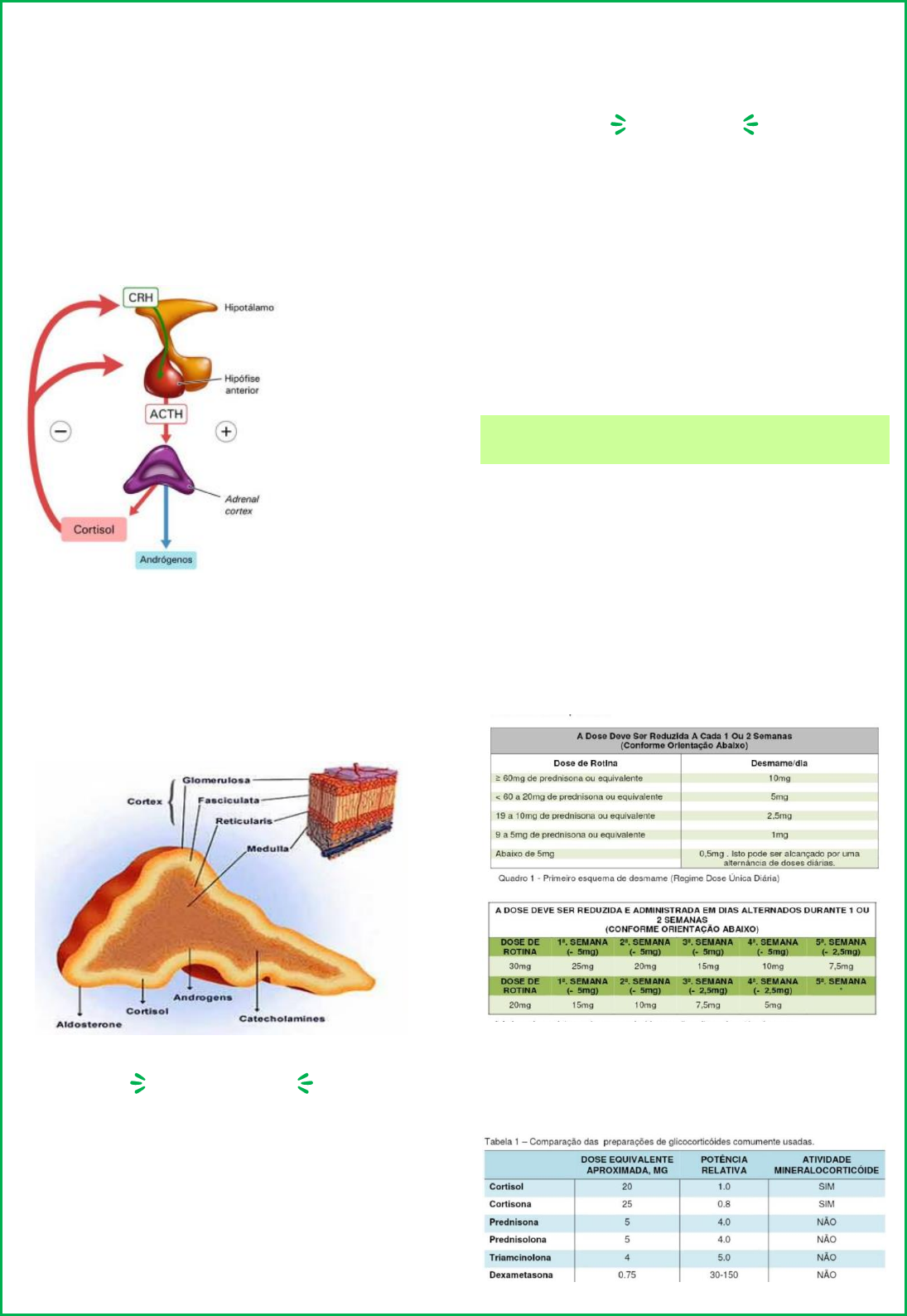 Síndrome de Cushing → Eixo da adrenal: hipotálamo libera o hormônio CRH → estimula a hipófise anterior a produzir o hormônio ACTH → estimula o córtex da adrenal a produzir o cortisol e os andrógenos. → Quando está em excesso, através de um feedback negativo, bloqueia a produção tanto do CRH e do ACTH → A glândula adrenal é constituída pela medula (10%) onde são produzidas as catecolaminas, e os outros 90% dessa é o córtex que se divide em três camadas: a camada glomerulosa que produz a aldosterona, a camada fasciculada que produz o cortisol e a camada reticular que produz os androgênios. Introdução → Exposição prolongada a quantidades excessivas de glicocorticoides livres circulantes → SC Exógena = administração terapêutica prolongada de glicocorticoides → SC Endógena = hiperprodução crônica de cortisol (hipofisária, adrenal ou ectópica) → Elevada morbimortalidade. Etiologia → Endógena: ACTH dependente: ocorre em 80% dos casos (problema está na hipófise) Doença de Cushing (80%) ACTH ectópico (20%) CRH ectópico ACTH independente (problema está na adrenal) Adenoma adrenal (60%) Carcinoma adrenal (40%) Hiperplasia de adrenal. Síndrome de Cushing exógena ou iatrogênica: → Causa mais comum de síndrome de Cushing → Doses diárias > 7,5mg de prednisona, 0,75mg de dexametasona ou 30mg de hidrocortisona por um longo período → Uso prolongado de preparações nasais, cremes e colírios contendo glicocorticoides. → Labs: ACTH e cortisol baixos (exceto nos casos do uso de hidrocortisona). → Tratamento: desmame lento do corticoide para evitar insuficiência adrenal → Redução gradual: diminuir para metade da dose e depois em dias alternados, e tentar tirar esse corticoide de forma lenta para que o eixo seja reestabelecido e não faça a insuficiência adrenal SC Endógena ACTH-DEPENDENTE Doença de Cushing: → Causa mais comum da SC endógena, seguida pelas patologias adrenais e síndrome do ACTH ectópico. → Geralmente microadenoma secretor de ACTH. → Carcinomas são extremamente raros. → Resulta em hiperplasia adrenal bilateral, mas também causa hiperplasia macronodular. → Predomínio no sexo feminino (M:H=5:1). → Início entre 20 e 40 anos. → Progressão lenta Síndrome do ACTH ectópico: → 10 a 15% dos casos de SC. → Mais comum em homens e após os 40 anos → Causa mais comum: carcinoma pulmonar de células pequenas. → Outras causas: tumores carcinoides, feocromocitomas, carcinoma medular da tireóide e tumores ovarianos. → Muito rara em crianças e adolescentes. Síndrome do CRH ectópico: → Bastante rara. → Maioria secundária a carcinoides brônquicos, carcinoma medular da tireoide e carcinoma prostático. → Secreção combinada ACTH e CRH é muito mais comum do que a secreção isolada de CRH. SC Endógena ACTH-INDEPENDENTE Distúrbios adrenais: → 20 a 30% dos casos de SC. → Adenoma produtor de cortisol (60%) = benigno, pequenos < 3cm e acomete mulheres de 30-40 anos → Carcinoma (40%) = maligno, marcante elevação de androgênios causando virilização (infância e idoso), grandes > 6cm e unilaterais → Geralmente são facilmente visualizadas por meio da tomografia computadorizada. Estado de Pseudo-Cushing: → Fenótipo clínico e/ou laboratorial similar ao da SC + hipercortisolismo leve ou moderado. → Depressão, alcoolismo crônico, obesidade, síndrome de abstinência alcoólica, anorexia e demais doenças psiquiátricas. → Hipercortisolismo sem causa bem definida. → Tratar ou eliminar o fator indutor do hipercortisolismo. Síndrome de Cushing subclínica: → Excesso de cortisol bioquímico, sem manifestações clássicas de hipercortisolismo. → 5 a 30% dos incidentalomas adrenais. → Prevalência em adultos: 0,2 a 2%. → Alta prevalência de obesidade, HAS e DM tipo 2, redução da densidade mineral óssea. → Evolução para a síndrome de Cushing clássica ocorre na minoria dos casos. Aspectos Clínicos → Ganho de peso (80-97% dos pacientes) → Letargia, fraqueza (56-90%) → Irregularidades menstruais, perda da libido, → Hirsutismo (64-84%), acne, calvície feminina → Hiperpigmentação da pele (dependente de ACTH) → Depressão, psicose → HAS (74-90%), DM → “Giba de búfalo” → aumento da gordura na região posterior do pescoço (34-67%), face arredondada (88-92%) → Osteopenia e osteoporose → Equimoses surgidas espontaneamente ou aos mínimos traumatismos (fragilidade capilar) → Miopatia proximal → Estrias violáceas > 1cm → Pletora facial (mancha avermelhada) → Hipercoagulabilidade e risco aumentado de complicações tromboembólicas → No hipercortisolismo leve: manifestações clínicas mínimas ou ausentes 25 anos, aumento de peso + obesidade abdominal + amenorreia há 5 meses + pletora facial + estrias violáceas → síndrome de Cushing secundária à automedicação crônica para rinite alérgica “Face de lua cheia” + “giba de búfalo” + obesidade abdominal → adenoma adrenal secretor de cortisol Estrias purpúricas estão presentes em até 2/3 dos casos. Equimoses Homem, ganho de peso, estrias purpúricas, hipertensão e fraqueza muscular proximal → SC por tumor carcinoide brônquico secretor de ACTH 22 anos, ganho de 10kg e irregularidade menstrual no último ano / sem aspectos fenotipicos de hipercortisolismo e elevação discreta de cortisol livre urinário → Doença de Cushing por macroadenoma hipofisário Em crianças: → Obesidade generalizada. → Diminuição da velocidade do crescimento. → Em cerca de 40% dos casos: virilização. Síndrome do ACTH ectópico (por carcinoma pulmonar de pesquenas células): → Geralmente aspectos cushingóides ausentes. → Predominam sintomas e sinais de malignidade associados a hipertensão, hipocalemia, fraqueza muscular intensa e hiperpigmentação. SC por uso crônico de Trok (dexametasona creme), para prevenção de assaduras Em quem pesquisar? → Excluir exp