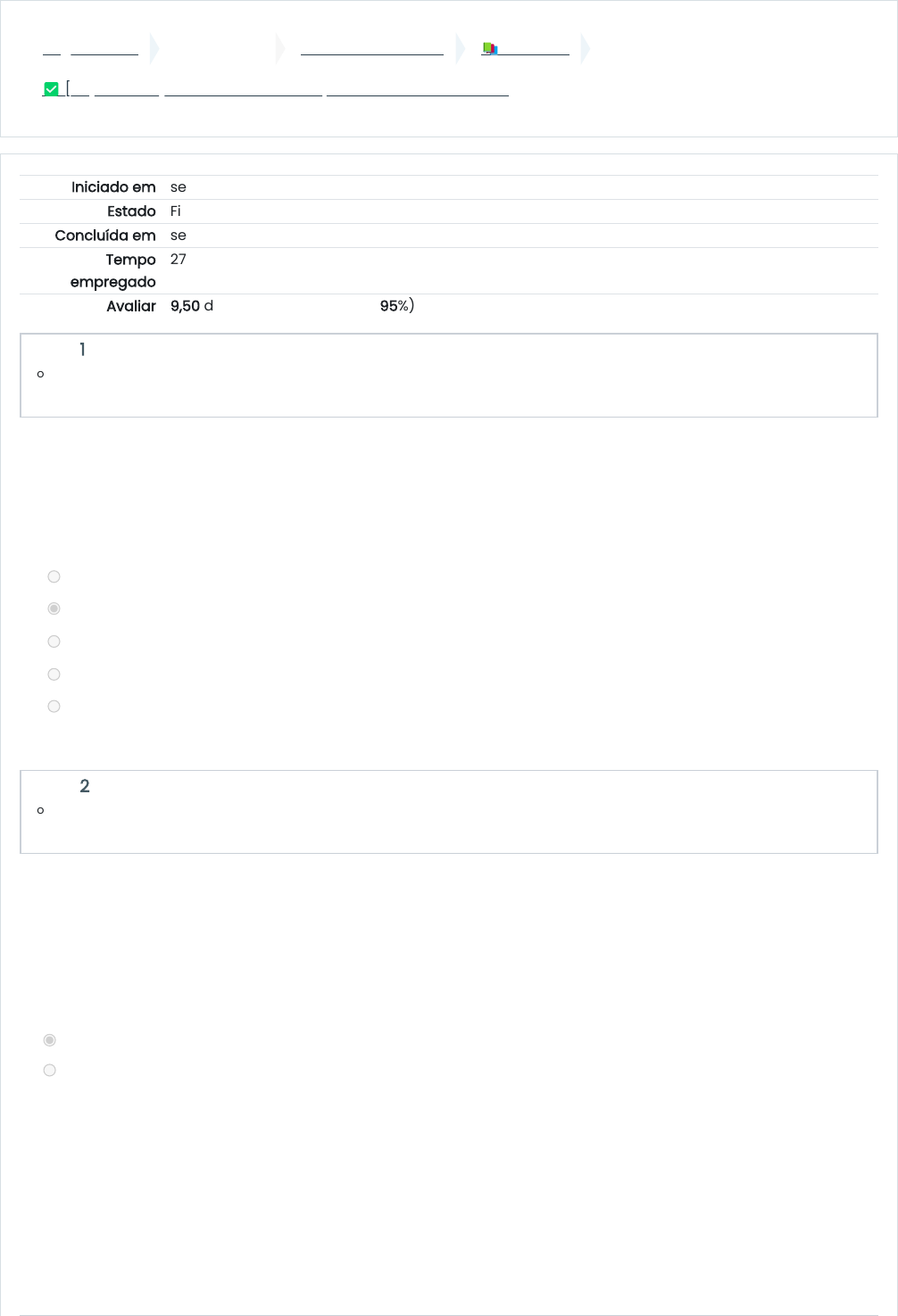 Página inicial Meus cursos 32010001586-2023-1 📚 Módulo 2 ✅ [A2] – Avaliação do Módulo 2 – Perspectivas teóricas da ética Iniciado em segunda, 24 abr 2023, 20:07 Estado Finalizada Concluída em segunda, 24 abr 2023, 20:35 Tempo empregado 27 minutos 17 segundos Avaliar 9,50 de um máximo de 10,00(95%) Questão 1 Correto Atingiu 1,00 de 1,00 Questão 2 Correto Atingiu 1,00 de 1,00 Segundo o que Teixeira (2014) pondera na “Introdução” de seu livro A Fundamentação Ética do Estado Socioambiental (leitura obrigatória da unidade 2), o Estado Democrático e Social precisa ser também um Estado socioambiental. Essa percepção resulta da constatação de que o Direito, tanto no âmbito nacional como no internacional, vem se afastando do: a. Teocentrismo contemporâneo b. Antropocentrismo clássico c. Antropocentrismo normativo d. Antropocentrismo cartesiano e. Teocentrismo clássico Conforme o que foi explanado na videoaula “Diversidades - Diversidade Étnico-racial” da unidade 2, a afirmação abaixo é verdadeira ou falsa? A ética precede toda e qualquer relação que se possa estabelecer com o outro, seja no âmbito prático ou teórico. Por isso, pode-se afirmar que a ética deve reger as relações étnico-raciais. Escolha uma opção: Verdadeiro Falso https://ava.ufms.br/ https://ava.ufms.br/course/view.php?id=44598 https://ava.ufms.br/course/view.php?id=44598#section-3 https://ava.ufms.br/mod/quiz/view.php?id=596210 Questão 3 Correto Atingiu 1,00 de 1,00 Questão 4 Correto Atingiu 1,00 de 1,00 Questão 5 Correto Atingiu 1,00 de 1,00 Conforme o que foi explanado na videoaula “3. Para que ética no serviço público?” da unidade 1, a afirmação abaixo é verdadeira ou falsa? Os servidores públicos e os funcionários das empresas precisam ser instruídos por princípios éticos. Escolha uma opção: Verdadeiro Falso Em conformidade com as lições que Teixeira (2014) registra na “Introdução” de seu livro A Fundamentação Ética do Estado Socioambiental (leitura obrigatória da unidade 2), responda: a afirmação abaixo é verdadeira ou falsa? O Estado Socioambiental, que se fundamenta na Ética Ambiental, rechaça o paradigma antropocentrista mitigado com uma abertura para o biocentrismo. Escolha uma opção: Verdadeiro Falso Na esteira do que Teixeira (2014) ensina na “Introdução” de seu livro A Fundamentação Ética do Estado Socioambiental (leitura obrigatória da unidade 2), complete os espaços utilizando palavras da lista de possibilidades (abaixo): A proposta de visa fundamentar a Modernidade ética, enunciada na perpetuação da vida: faz-se necessário restringir a capacidade humana de agir como uma destruidora do ecossistema. O recorte analítico utilizado foi a categorização formulada por na Filosofia da Natureza, capaz de captar a visão orgânica da vida, em razão de seu recorte pautar-se no fator unidade - o homem integrado ao todo -, tendo a preocupação de relacionar vida e natureza. Depois de fazer uma revisão das propostas dos dois estudiosos anteriores, passa a destacar a relevância de um tratamento jusfilosófico na geração do conhecimento ambiental. Hans Jonas Hegel Orci Teixeira Questão 6 Correto Atingiu 1,00 de 1,00 Questão 7 Correto Atingiu 1,00 de 1,00 Questão 8 Parcialmente correto Atingiu 0,50 de 1,00 Questão 9 Correto Atingiu 1,00 de 1,00 Com base nas explanações de Teixeira (2014), a afirmação abaixo é verdadeira ou falsa? Para que a observância à ética ambiental seja cada dia mais arraigada é necessário deixar de rever alguns aspectos da tradição ética do Ocidente. Escolha uma opção: Verdadeiro Falso Conforme o autor Teixeira (2014) assinala na “Introdução” de seu livro A Fundamentação Ética do Estado Socioambiental (leitura obrigatória da unidade 2), a ideia de que os recursos ambientais estão disponíveis em função dos seres humanos é uma concepção que, além de insustentável, pode fazer a humanidade caminhar rumo ao: a. antropocídio b. ecologicídio c. ecocídio d. sensossídio e. ambienticídio Sem dúvidas, a crítica do ponto decisivo sobre ética ambiental é o debate do antropocentrismo Conforme Teixeira (2014) ensina na “Introdução” de seu livro A Fundamentação Ética do Estado Socioambiental (leitura obrigatória da unidade 2), disponha os itens desorganizados em uma ordem que faça sentido: Nos moldes das proposições de Orci Teixeira (2014), a afirmação abaixo é verdadeira ou falsa? A prática da justiça socioambiental deve estar presente na atuação dos órgãos responsáveis pela ordem ambiental internacional. Escolha uma opção: Verdadeiro Falso Questão 10 Correto Atingiu 1,00 de 1,00 De acordo com o que Teixeira (2014) assinala na “Introdução” de seu livro A Fundamentação Ética do Estado Socioambiental (leitura obrigatória da unidade 2), arraste e solte sobre o texto as palavras a fim de colocar em ordem as impressões do referido teórico: É no pensamento grego recuperado por Hegel que se encontram pistas para reflexões atuais sobre limites físicos da natureza. Atividade anterior ◄ 📍 [Checkout de Presença] Módulo 2 – Perspectivas teóricas da ética Seguir para... Próxima atividade ✅ [PO] Prova Optativa ► Manter contato Suporte Técnico ao Usuário https://suporteagetic.ufms.br (67) 3345-7613 suporte.agead@ufms.br https://ava.ufms.br/mod/assign/view.php?id=596208&forceview=1 https://ava.ufms.br/mod/quiz/view.php?id=596211&forceview=1 https://suporteagetic.ufms.br/ tel:(67) 3345-7613 mailto:suporte.agead@ufms.br https://api.whatsapp.com/send?phone=556733457613