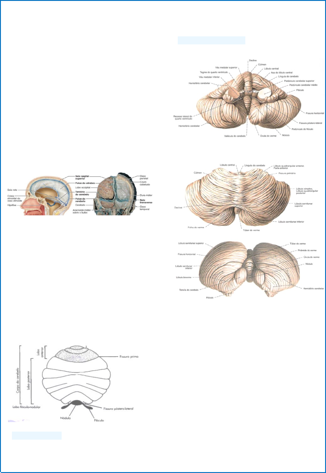 Anatomia do Cerebelo Anatomia Externa CARACTERÍSTICAS → Segunda maior estrutura encefálica, (10% da massa encefálica total) → Ocupa a região inferior e posterior da cavidade craniana → Localizado dorsalmente ao tronco encefálico e inferior ao lobo occipital do telencéfalo LOCALIZAÇÃO DO CEREBELO → Fossa posterior do crânio → Inferiormente ao telencéfalo → Dorsalmente ao tronco encefálico DIVISÃO ANATÔMICA CEREBELAR → Cerebelo • Verme → medial • Hemisférios cerebelares → laterais → Hemisférios cerebelares → corpo do cerebelo → lobo anterior + lobo posterior • Lobo anterior • Lobo posterior • Lobo flóculo-nodular (funcional) → Vista do cerebelo planificada • Fissura primaria: separa os lobos anterior e posterior • Fissura posterolateral: separa o nódulo (postura e equilíbrio) do lobo posterior → Os hemisférios são unidos pelo verme → Verme é localizado medialmente VERME DO CEREBELO → Língula → Fissura pré-central → Lóbulo central → Fissura pré-culminal → Cúlmen Fissura primaria → Declive → Fissura pós-clival → Folha do verme → Fissura horizontal → Túber → Fissura pré-piramidal → Pirâmide Fissura secundaria → Úvula → Fissura póstero-lateral → Nódulo HEMISFÉRIOS CEREBELARES → Asa do lóbulo central → Lóbulo quadrangular anterior → Fissura primaria → Lóbulo quadrangular posterior → Fissura pós-clival → Lóbulo semilunar superior → Fissura horizontal → Lóbulo semilunar inferior → Fissura lunográcil → Lóbulo grácil → Fissura pré-piramidal → Lóbulo biventre (fissura intrabiventre) → Fissura secundaria → Tonsila do cerebelo → Floculo Anatomia Interna A camada mais externa (córtex) é formada por substancia cinzenta e apresenta uma divisão em várias folhas Internamente, o cerebelo possui o corpo medular e dentro do corpo medular, os núcleos: denteado, emboliforme, gl Organização Interna Divisão Funcional Funções image7.png image8.png image9.png image10.png image1.png image2.png image3.png image4.png image5.png image6.png