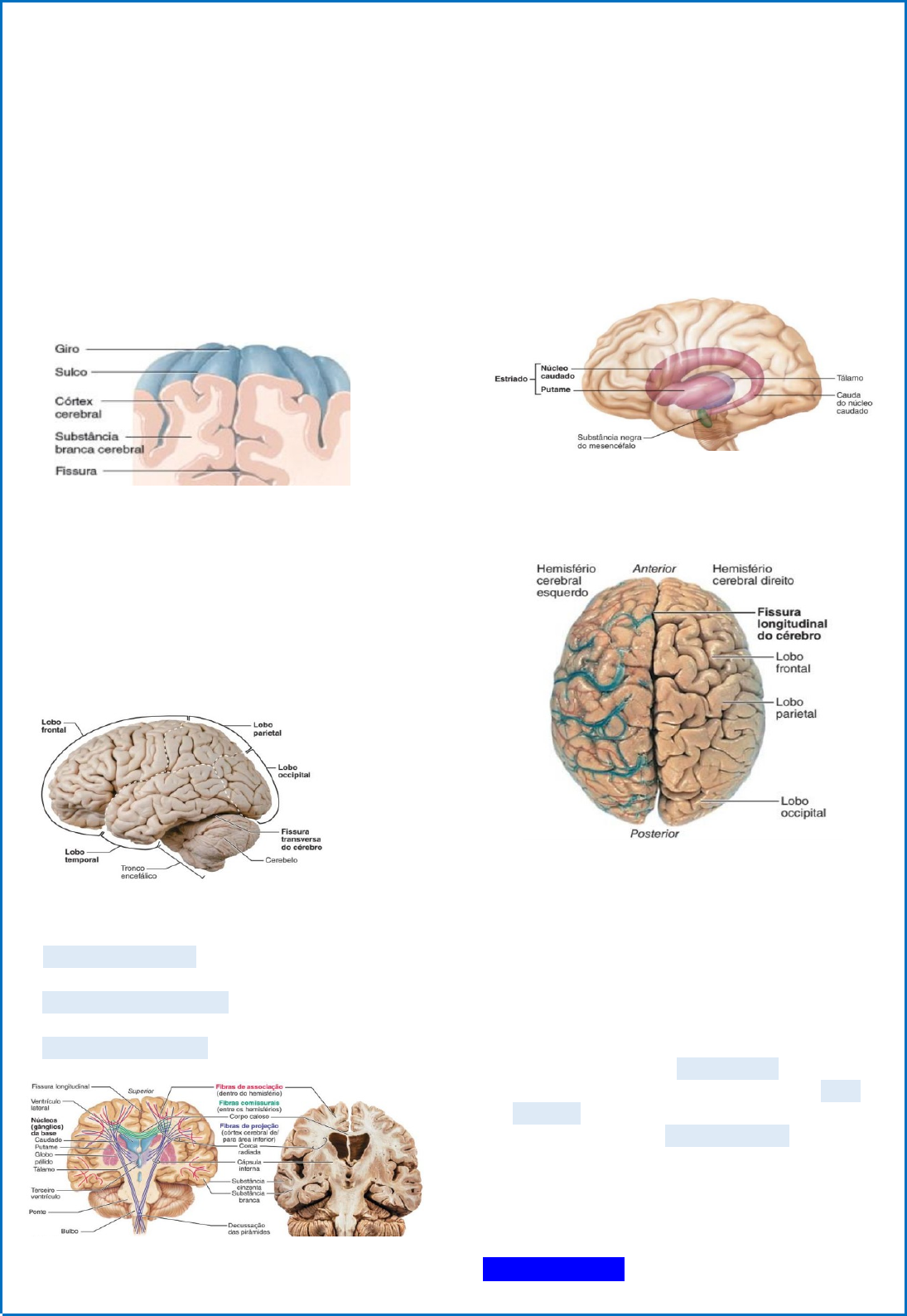 Anatomia do Telencéfalo Características • 80% da massa total do encéfalo • Cérebro → dois hemisférios cerebrais, esquerdo e direito, que apresentam funções assimétricas, estando relacionados com áreas diferentes. • Sede de várias funções sensoriais e motoras Composição CÓRTEX CEREBRAL → Região de substância cinzenta que forma a porção externa do encéfalo → 2 a 4 mm de espessura → Apresenta sulcos e giros → Os giros vão levar ao aumento da área total do córtex, sendo assim, os sulcos vão ser depressões localizadas entre os giros SUBSTÂNCIA BRANCA CEREBRAL → Formada por neurônios mielínicos; → Fibras comissurais - vão conectar regiões diferentes dos hemisférios cerebrais; → Fibras de associação - vão associar as diferentes regiões do córtex → Fibras de projeção - vão projetar e conectar regiões do córtex com a periferia SUBSTÂNCIA CINZENTA CEREBRAL PROFUNDA → Formada por neurônios amielínicos, principalmente, corpos celulares. → Localizada profundamente no interior do telencéfalo, sendo responsável, principalmente, por núcleos da base. → Os núcleos são responsáveis pelo processamento de várias funções, principalmente, da motora e da comportamental LOBOS CEREBRAIS · Lobo Frontal · Lobo Parietal · Lobo Occipital · Lobo Temporal · Lobo da Ínsula → Em uma vista lateral: são vistas as divisões dos lobos · Anteriormente, seguindo os ossos frontais do crânio: lobo frontal · Posteriormente ao lobo frontal: lobo parietal · Não vemos o lobo da ínsula (insular) pois ele está localizado profundamente no sulco lateral. Lobo Frontal LOCALIZAÇÃO • Parte anterior do cérebro • Inferior osso frontal → Fossa do crânio anterior • Sulco central → divisão com o lobo parietal • Contém o giro pré-central, a área motor primária → córtex motor primário, é o principal giro associado com a função motora corporal FUNÇÕES • Movimento voluntário (córtex motor primário) • Planejamento do movimento (córtex pré-motor) → Essas duas áreas tem uma associação interessante visto que o córtex pré-motor planeja o movimento e o córtex motor primário executa. • Movimento ocular (campo ocular frontal) • Produção da fala (área de Broca, associada a área de Wernicke, a qual está envolvida como o entendimento da fala) • Funções cognitivas executivas (área de associação anterior) • Resposta emocional (associação límbica) Lobo Parietal LOCALIZAÇÃO • Inferior ossos parietais • Sulco central → divisão com o lobo frontal • Sulco parietooccipital → divisão com o lobo occipital (mais difícil de ser observado) • Contém o giro pós-central → córtex somestésico primário ou área sensorial primária • Enquanto o córtex pré-motor vai realizar as funções motoras, o córtex sensorial primário vai fazer uma percepção sensorial, integrando várias percepções diferentes, encontradas pelo nosso corpo. FUNÇÕES • Sensibilidade somática geral (córtex e área de associação sensitiva somática) • Percepção espacial de objetos, sons, partes do corpo (área associação posterior) • Compreensão da fala (área de Wernicke) Lobo Occipital LOCALIZAÇÃO • Parte posterior do cérebro • Inferior osso occipital • Sulco parietooccipital → divisão com o lobo parietal • Maior área sensorial dedicada a visão, para conseguirmos entendermos os detalhes visuais que enxergamos. FUNÇÕES • Visão (córtex visual e áreas de associação) Lobo Temporal LOCALIZAÇÃO • Parte lateral dos hemisférios • Inferior osso temporal → Fossa do crânio média • Sulco lateral → divisão com os lobos frontal e parietal FUNÇÕES • Audição (córtex auditivo e área de associação) • Olfato (córtex olfatório) • Identificação de objetos (área de associação posterior) • Resposta emocional, memória (área de associação límbica) Lobo da Ínsula LOCALIZAÇÃO • 5º lobo telencefálico localizado profundamente no sulco lateral • Coberta por partes dos lobos frontal, parietal e temporal FUNÇÕES • Paladar (córtex gustatório) • Como temos o paladar, ela também será o centro do nojo e o reflexo do vômito. DEFINIÇÕES → Giros → Dobras do córtex cerebral → Sulcos → Fendas menos superficiais entre os giros → Fissuras → Fendas profundas entre os giros VISTA LATERAL DO TELENCÉFALO • Polo frontal: na região anterior, no lobo frontal • Polo temporal: na porção anterior, no lobo temporal • Polo occipital: na porção posterior, no lobo occipital • Incisura pré-occipital: separa o lobo temporal do lobo occipital VISTA MEDIAL DO TELENCÉFALO → Lobo límbico: não é um lobo anatômico, mas sim funcional que faz parte do sistema límbico, formado por 2 estruturas principais: • giro do cíngulo • giro para-hipocampal → O lobo límbico está relacionado com controle da memória e o controle emocional VISTA INFERIOR DO TELENCÉFALO • Lobo temporal, com polo temporal → verde • Lobo occipital, com polo occipital → amarelo • Lobo frontal, com polo frontal → rosa GIROS E SULCOS CEREBRAIS PRINCIPAIS SULCOS CEREBRAIS • Sulco central - separa o lobo frontal do lobo parietal • Sulco lateral - separa o lobo frontal do temporal e lobo parietal delobo temporal • Sulco perietooccipital – separa lobo parietal do lobo occipital→ Nessa imagem, conseguimos ver a projeção da insula e sua localização • A insula está localizada profundamente no sulco lateral • O lobo frontal, uma pequena parte do lobo parietal, e uma parte do lobo temporal recobrem a insula GIROS CEREBRAIS Sulco lateral: separa o lobo frontal do lobo temporal e lobo parietal de lobo temporal, vermelho , • Giro temporal superior • Giro temporal médio • Giro temporal inferior • Giro supramarginal • Giro angular Sulco central: separa o lobo frontal do lobo parietal, azul • Giro pré-central: anteriormente • Giro p