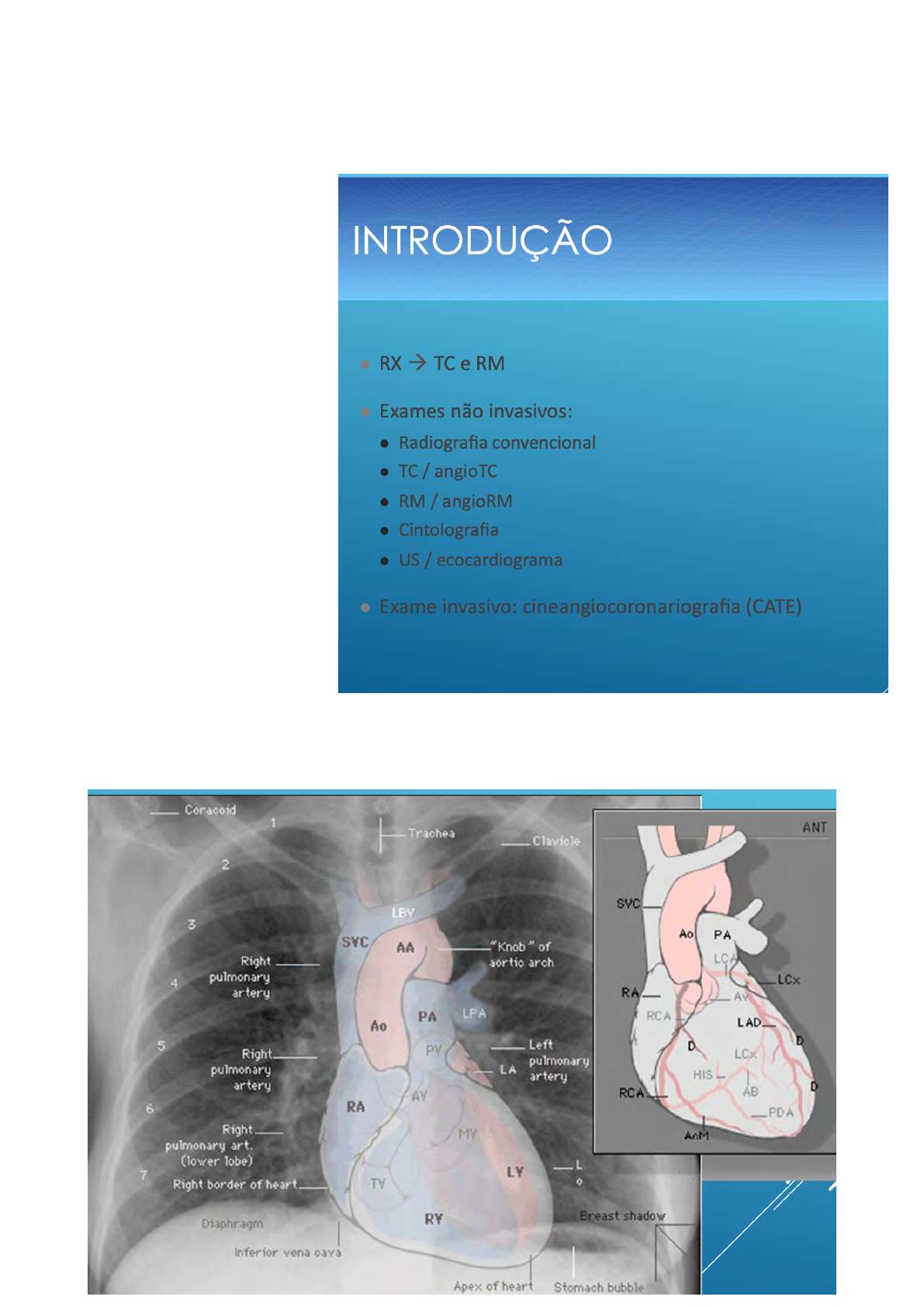 Sistema Cardiovascular Começamos com o raio X, que é o exame mais barato. Cineangio só é usada quando se vai fazer procedimento cirúrgico, fora isso é substituída pela Angio RM. Anatomia Cardiovascular 1 Não é possível ver o ventrículo direito no RX de tórax. 2 Em azul na imagem acima vemos a janela aorto-pulmonar. Válvulas Cardíacas • Em perfil: 1o Traçar linha da junção do esterno com o diafragma até a carina; 2o Outra linha, horizontal, nos limites da silhueta cardíaca. 3 4 • O mais importante é saber a localização da valva mitral, pois ela que costuma apresentar mais alterações. Aorta • No RX de perfil é mais fácil ver a crossa e aorta descendente do que a aorta ascendente. 5 • O hilo pulmonar direito é mais anterior do que o esquerdo. • Espaço retroesternal: seta vermelha; • Espaço retrocardíaco: seta azul. 6 • Em destaque na seta vermelha a Janela Aorto Pulmonar. Rotina Radiológica: • RX de perfil e PA. 7 • Em azul vemos o tronco da aorta, e em vermelho a janela aorto-pulmonar. Indice Cardio-Torácico • Soma os dois hemitórax. 8 • Tomar cuidado com o índice cardio-torácico em pacientes longelíneos. 9 • Existem corações mais horizontalizados, mais oblíquos ou em gota. Existem ângulos para determinar se existe alteração ou não. (Não precisa se preocupar em decorar esses ângulos). 10 Aumento das cavidades cardíacas Atrio esquerdo: • Aumenta inicialmente para trás; • Sinal mais precoce: deslocamento posterior do esôfago; • Aumento para o lado direito!sinal do duplo contorno. Ultrapassa o contorno so átrio D. • Aumento para a esquerda ! 4o arco cardíaco esquerdo; • Aumento para cima!alargamento do ângulo da carina (sinal da bailarina); • Causa mais comum: doença valvar mitral reumática. Outras causas: Doença cardíaca congênita!shunts intracardíacos e insuficiência do VE. 11 Ângulo da carina aberto, sinal do duplo contorno e sinal da bailarina. 12 13 Sinal do duplo contorno e aumento do ângulo da carina. Aumento do átrio esquerdo posteriormente. • Se o átrio esquerdo cresce para cima => sinal da bailarina; • Se for para o lado direito => sinal do duplo contorno; • Se for para posterior => o esôfago vai ser jogado para baixo; • Se for jogado inferiormente => não vamos conseguir ver pois vai ficar junto com o diafragma. Alterações: • PA: Duplo contorno na silhueta direita do coração (duplo contorno atrial); Deslocamento superior do brônquio fonte E (Sinal da bailarina); Abaulamento do arco médio do contorno cardíaco esquerdo (4o arco). • Perfil: Deslocamento posterior do esôfago contrastado. Ventrículo Esquerdo: • Maior segmento da borda cardíaca; • Mesmo em grandes sobrecargas, pode não apresentar modificações: - Volume normal; - Alterações do arco ventricular esquerdo. • Aumento para esquerda ! aumento do diâmetro transverso. • Aumento para baixo!deslocamento caudal do ápice cardíaco. • Aumento para trás!ocupação do espaço retrocardíaco. • Causas: 14 Desvio Latero-inferior do ápice cardíaco: 15 • Quanto maior o ângulo (no círculo azul), maior o aumento o aumento do coração. 16 • PA: Alongamento e arredondamento da borda ventricular esquerda e Deslocamento caudal da ponta do coração. • Perfil: Deslocamento posterior do contorno cardíaco posterior – distância da VCI > 1,8 cm. • Imagem abaixo explica o ângulo para ver o aumento do VE: 17 Ventrículo direito: • Perfil: diminuição do espaço hipertransparente retroesternal. Normalmente, o VD toca, no máximo, 1/3 do esterno. • Acentuação do aumento ! rotação do coração para esqueda ! elevação da ponta do coração (sinal do tamanco holandês). • Sinal indireto: dilatação do tronco da artéria pulmonar. • Causas: hipertensão pulmonar; tetralogia de Fallot (principal causa de aumento do VD); estenose pulmonar; DPOC e defeitos septais. • PA: Elevação da ponta do coração e Protrusão do tronco da artéria pulmonar. • Perfil: contorno cardíaco anterior encosta em mais de 1/3 inferior do esterno (obliteração do espaço retroesternal. • O aumento do VD é conhecido como sinal do tamanco holandês, pois a ponta do coração sobe. Ou ainda como sinal da bota. 18 19 Átrio Direito: • Avaliação mais difícil; • Mesmo muito dilatada pode ter pouca expressão radiográfica; • Aumento para a direita!expansão do contorno cardíaco direito, afastando a borda cardíaca da coluna; • Aumento para cima!eleva o ponto de intersecção com a veia cava superior; • Aumento para baixo ! altera o ângulo cardiofrênico (sinal da corda); • Causas: defeito do septo atrial, estenose e insuficiência tricúspides, insuficiência ventricular direita. 20 • Diminuição do espaço retroesternal; • Sinal do homem andando (aumento do ângulo da carina), isso indica aumento do átrio esquerdo; • Espaço retrocardíaco normal. Aumento do contorno cardíaco direito, maior convexidade. • Lembra sinal da moringa, mas não é derrame pericárdico. Hipertensão pulmonar primária • Tem aumento do VE e da artéria pulmonar. Circulação Pulmonar 21 • No Rx acima vemos: artéria pulmonar dilatada, Abaulamento no mediastino na topografia do tronco da artéria pulmonar, imagem sugestiva de aumento do tronco da artéria pulmonar e Arco aórtico está encoberto pelo tronco da a. Pulmonar. • O fluxo sanguíneo e o calibre dos vasos nas bases são maiores devido a gravidade. • Os vasos diminuem gradualmente do centro (hilos) para a periferia. 22 23 24 Edema Pulmonar • Primeiro há edema intertiscial, depois alveolar; • Edema Intersticial (PCP entre 12 e 18 mmHg / 18 e 25 mmHg): - Borramento ou espessamento das paredes vasculares!margens a indistintas e alagardas; - Borramento ou espessamento peribrônquico!borramento hilar; - Linhas B de Kerley ! horizontais, 1,5 – 2 cm, partes inferior e lateral do pulmão; - Septor interlobulares secundários espessados por