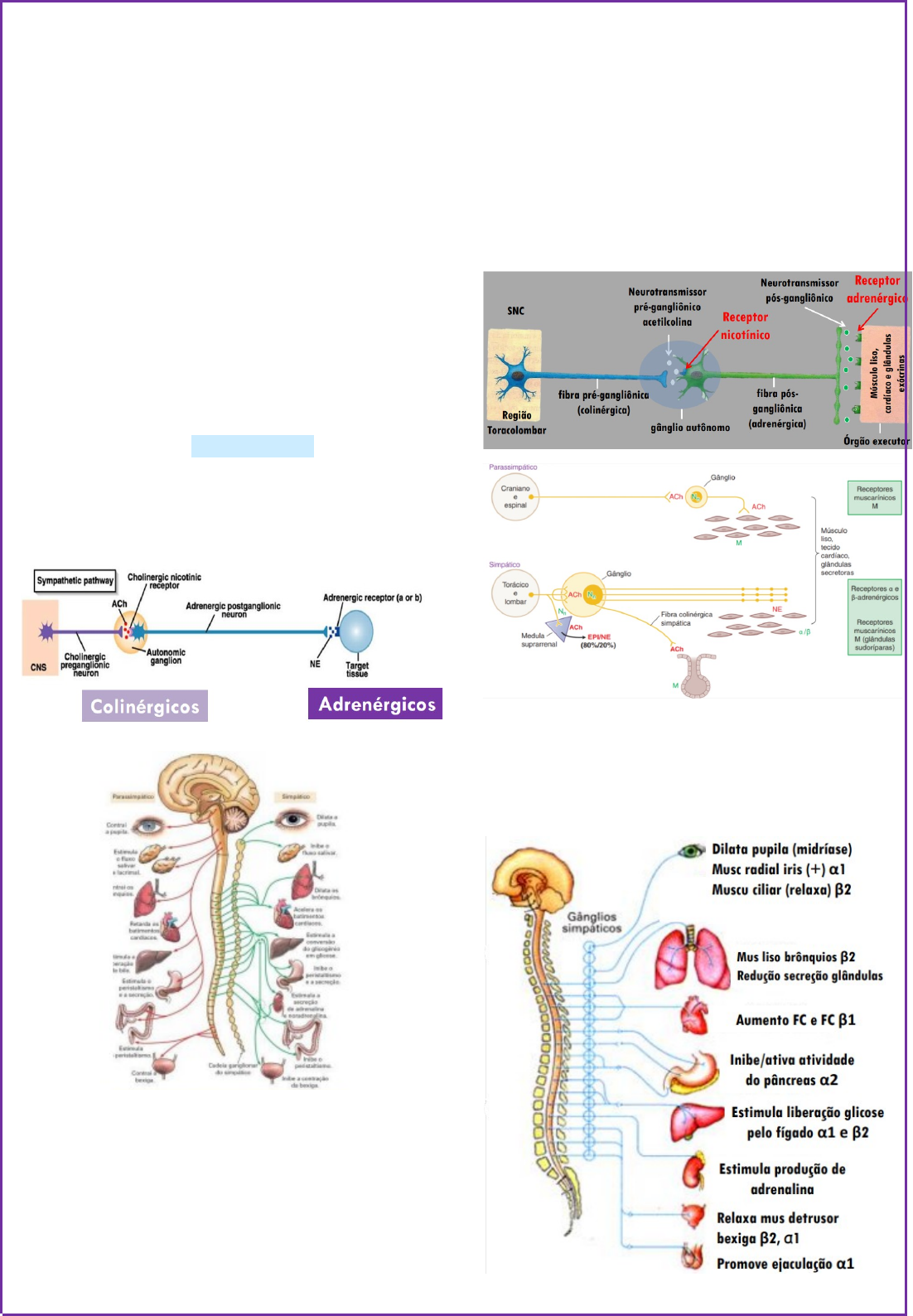 Farmacologia do Sistema Nervoso Autônomo Simpático → As funções do SNA Simpático são ativadas em situações de estresse, perigo, medo, ansiedade, frio e exercícios. → “Luta e fuga” NEURÔNIOS EFERENTES • Fibras pré-ganglionares originam na T1 até a L2 ou L3 (sistema toracolombar) • Gânglios (conjunto de corpos de neurônios da fibra pós-ganglionar) encontram-se na cadeia simpática - gânglios paravertebrais, gânglios pré-vertebrais e terminais → Envia a informação do SNC para o sistema periférico AÇÕES DO SNA SIMPÁTICO SÍNTESE, ARMAZENAMENTO E LIBERAÇÃO DE CATECOLAMINAS RECAPTAÇÃO DE CATECOLAMINAS• 75 - 90 % NA reciclada • TNA simporte: NA é recaptada para o citoplasma • TVMA: NA volta para vesículas • MAO: enzimas mitocondriais • MAO-A: NE, E, dopamina, serotonina • MAO-B: NE, E, dopamina, serotonina • COMT SÍNTESE, ARMAZENAMENTO E LIBERAÇÃO NORADRENÉRGICA MEDULA ADRENAL → Interior das glândulas adrenais, na superfície superior dos rins → Produz principalmente adrenalina (80%) e manda diretamente na corrente sanguínea → Células cromafins: neuroendócrinas pós-sinápticas RECEPTORES ADRENÉRGICOS SINAPSE ADRENÉRGICA TIPOS DE RECEPTORES ADRENÉRGICOS RECEPTORES ADRENÉRGICOS IIIIIIIIII TIPO α1 (Gq) RECEPTORES ADRENÉRGICOS IIIIIIII TIPO α2 (Gi/G0) • Desfosforilação de canais de cálcio (inativa canais de cálcio) • Ativação de canais de K+ RECEPTORES ADRENÉRGICOS IIIIIIII TIPO β (Gs) β1 β2 • Ativação PKA → inativa quinase de cadeia leve de miosina – relaxamento FÁRMACOS QUE ATUAM NO IIIIII SNA SIMPÁTICO SIMPATOMIMÉTICOS → Mimetizam os efeitos da noradrenalina/ adrenalina ligando-se diretamente nos receptores adrenérgicos • ADRENALINA (α1, α2, β1 e β2) • NORADRENALINA (α1, α2, β1) • ISOPROTERENOL (β1 e β2) 1. ADRENALINA (agonista não seletivo) APLICAÇÕES CLÍNICAS • Asma - tratamento de emergência (β2) • Choque anafilático (β2) • Parada cardíaca (β1) EFEITOS ADVERSOS • Taquicardia, arritmias • Elevação da PA, agitação, tremores • Hiperglicemia 2. NORADRENALINA (agonista não seletivo) APLICAÇÕES CLÍNICAS • Muito limitada (uso restrito hospitalar) • Administração IV no choque EFEITOS ADVERSOS • Taquicardia, hipertensão, hiperglicemia 3. ISOPRENALINA (agonista β-não seletivo) APLICAÇÕES CLÍNICAS • Não é muito utilizado na asma • Bloqueio cardíaco (em emergências ↑FC) EFEITOS ADVERSOS • Taquicardia, palpitações, rubor, cefaleia → Mimetizam os efeitos da noradrenalina/ adrenalina ligando-se diretamente nos receptores adrenérgicos • DOBUTAMINA (β1) • SALBUTAMOL (β2) • FENILEFRINA (α1) • CLONIDINA (α2) 4. DOBUTAMINA (agonista β1-seletivo) APLICAÇÕES CLÍNICAS • Bradicardia • Parada ou insuficiência cardíaca • Tratamento tem curta duração EFEITOS ADVERSOS • Altas [ ]: arritmias, IAM 5. SALBUTAMOL, TERBUTALINA E FENOTEROL (agonista β2) APLICAÇÕES CLÍNICAS • Asma (VO, inalação ou IV) • Inibição do parto prematuro (salbutamol) EFEITOS ADVERSOS • Taquicardia, arritmias e tremores 6. FENILEFRINA E NAFAZOLINA (agonista α1-seletivo) APLICAÇÕES CLÍNICAS • Descongestionante nasal EFEITOS ADVERSOS • ↓ oxigenação mucosa nasal 7. CLONIDINA (agonista α2-seletivo) APLICAÇÕES CLÍNICAS • Anti-hipertensivo → Potencializam a transmissão adrenérgica, aumentando a liberação de noradrenalina das vesículas e ativam receptores adrenérgicos • Efedrina • Pseudoefedrina 1. EFEDRINA (aumenta a liberação NA) APLICAÇÕES CLÍNICAS • Tratamento da asma • Descongestionante nasal EFEITOS ADVERSOS • Taquicardia, arritmias • Aumento da PA image7.png image8.png image9.png image10.png image11.png image12.png image13.png image14.png image15.png image16.png image17.png image18.png image19.png image20.png image21.png image22.png image23.png image24.png image25.png image26.png image27.png image28.png image29.png image30.png image31.png image32.png image1.png image2.png image3.png image4.png image5.png image6.png