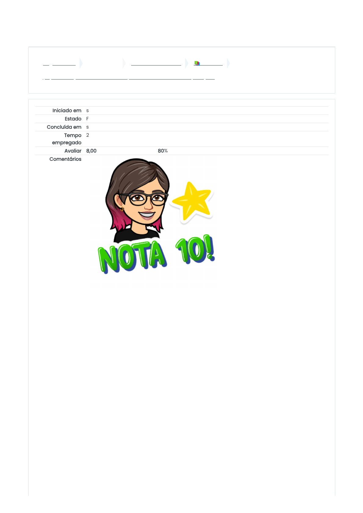 08/10/2022 15:53 (A1) – Avaliação do Módulo 1 - Conjuntos numéricos e suas operações: Revisão da tentativa https://ava.ufms.br/mod/quiz/review.php?attempt=509644&cmid=509551 1/9 Página inicial Meus cursos 32010001684-2022-2 📚 Módulo 1 (A1) – Avaliação do Módulo 1 - Conjuntos numéricos e suas operações Iniciado em sábado, 8 out 2022, 15:21 Estado Finalizada Concluída em sábado, 8 out 2022, 15:45 Tempo empregado 24 minutos 24 segundos Avaliar 8,00 de um máximo de 10,00(80%) Comentários https://ava.ufms.br/ https://ava.ufms.br/course/view.php?id=37186 https://ava.ufms.br/course/view.php?id=37186#section-2 https://ava.ufms.br/mod/quiz/view.php?id=509551 08/10/2022 15:53 (A1) – Avaliação do Módulo 1 - Conjuntos numéricos e suas operações: Revisão da tentativa https://ava.ufms.br/mod/quiz/review.php?attempt=509644&cmid=509551 2/9 Questão 1 Incorreto Atingiu 0,00 de 1,00 Questão 2 Correto Atingiu 1,00 de 1,00 Em uma sala de aula dos alunos são meninas. Entre as meninas, possuem cabelo castanho. Que fração dos alunos da sala que possui cabelo castanho? a. b. c. 2 3 3 4 1 3 1 2 3 2 Sua resposta está incorreta. Resposta correta: . Se em uma classe do total são meninas e nesse número possuem cabelo castanho, então devemos calcular o produto de duas frações. x = = Sendo assim, , ou seja, metade possuem cabelo castanho. A resposta correta é: 1 2 2 3 3 4 2 3 3 4 6 12 1 2 1 2 1 2 Expresse, utilizando a adição de números inteiros, cada situação que segue e dê o resultado. I) Em um jogo, Alice ganhou 12 pontos e perdeu 7. II) Em um torneio de futebol, um time tem 14 pontos ganhos e 20 pontos perdidos. III) Seu João depositou R$239,00 em sua conta corrente, que estava com um saldo devedor de R$540,00. A ordem correta dos resultados é: a. 19, 34, -R$301,00 b. 5, - 6 e - R$301,00 c. 5, 6 e - R$301,00 d. 19, 34, R$540,00 e. 5, 6 e - R$301,20 Sua resposta está correta. I) +12-7 = 5; II) +14-20= -6; III) +R$239,00 - R$540,00 = -R$301,00 5, -6 e -R$301,00 A resposta correta é: 5, - 6 e - R$301,00 08/10/2022 15:53 (A1) – Avaliação do Módulo 1 - Conjuntos numéricos e suas operações: Revisão da tentativa https://ava.ufms.br/mod/quiz/review.php?attempt=509644&cmid=509551 3/9 Questão 3 Correto Atingiu 1,00 de 1,00 Questão 4 Correto Atingiu 1,00 de 1,00 Um camelô fez quatro vendas: na primeira teve prejuízo de R$4,00, na segunda teve prejuízo de R$11,00, na terceira teve lucro de R$13,00 e na última teve lucro de R$5,00. Pode-se calcular o saldo resultante desses quatro negócios. Analise e assinale qual das alternativas é a correta. a. – 4 – 11 – 13 + 5 = -23 b. – 4 – (–11) + 13 + 5 = 25 c. – 4 + (–11) + 13 + 5 = 3 d. 4 – 11 + 13 + 5 = 11 Sua resposta está correta. – 4 + (–11) + 13 + 5 = 3 A resposta correta é: – 4 + (–11) + 13 + 5 = 3 Em um jogo, a pontuação de Carolina foi a seguinte: 1ª rodada: perdeu 80 pontos 2ª rodada: ganhou 475 pontos 3ª rodada: ganhou 290 pontos 4ª rodada: perdeu 115 pontos Qual é o total de pontos de Carolina? a. 435 b. 570 c. 845 d. 960 e. 575 Sua resposta está correta. -80 + 475 + 290 - 115 = 570 A resposta correta é: 570 08/10/2022 15:53 (A1) – Avaliação do Módulo 1 - Conjuntos numéricos e suas operações: Revisão da tentativa https://ava.ufms.br/mod/quiz/review.php?attempt=509644&cmid=509551 4/9 Questão 5 Correto Atingiu 1,00 de 1,00 Questão 6 Correto Atingiu 1,00 de 1,00 Seja A = 120, B = 160, x = mmc (A,B) e y = mdc (A,B), então o valor de x + y é igual a: a. 520 b. 540 c. 460 d. 480 e. 500 Sua resposta está correta. Para encontrar o valor da soma de x com y, é necessário primeiro encontrar esses valores. Desta forma, vamos fatorar os números em fatores primos e depois calcular o mmc e o mdc entre os números dados. Agora que já conhecemos o valor de x (mmc) e de y (mdc), podemos encontrar a soma: x + y = 480 + 40 = 520 Alternativa: 520 A resposta correta é: 520 Em certo dia na cidade de Ketchikan, no Alaska, a temperatura pela manhã foi de 4°C, chegando a -3°C durante a tarde. Quantos graus aumentaram ou diminuíram nesse dia? a. Aumentou 1°C b. Aumentaram 7°C c. Diminuíram 7°C d. Diminuiu 1°C Sua resposta está correta. 4 - (-3) = 4 + 3 = 7 Diminuíram 7°C A resposta correta é: Diminuíram 7°C 08/10/2022 15:53 (A1) – Avaliação do Módulo 1 - Conjuntos numéricos e suas operações: Revisão da tentativa https://ava.ufms.br/mod/quiz/review.php?attempt=509644&cmid=509551 5/9 Questão 7 Correto Atingiu 1,00 de 1,00 Roberta depositou em sua conta bancária a quantia de R$ 200,00. Ao conferir o saldo de sua conta notou que possuía um valor negativo de menos R$ 50,00. Quanto Roberta devia ao banco? a. R$ 250,00 b. R$ 150,00 c. R$ 155,00 d. R$ 450,00 e. R$ 350,00 Sua resposta está correta. Ao depositar R$ 200,00 e continuar devendo R$ 50,00, podemos chegar à conclusão de que Roberta devia ao banco R$ 250,00. Nos bancos os saldos devedores são simbolizados pelo sinal (–): – 250 + 200 = – 50 A resposta correta é: R$ 250,00 08/10/2022 15:53 (A1) – Avaliação do Módulo 1 - Conjuntos numéricos e suas operações: Revisão da tentativa https://ava.ufms.br/mod/quiz/review.php?attempt=509644&cmid=509551 6/9 Questão 8 Correto Atingiu 1,00 de 1,00 Paulo e Lucas inventaram um jogo de dados: eles jogavam dois dados, um vermelho e outro azul. O dado vermelho era contado como negativo e o azul como positivo. Na 1ª rodada Paulo tirou o número 5 com o dado vermelho e o número 4 com o dado azul. Lucas tirou o número 4 com o dado vermelho e o número 3 com o dado azul. Como ficou a pontuação dos meninos nessa primeira rodada? a. Paulo está ganhando com um ponto b. Os dois estão empatados com - 1 ponto c. Lucas está ganhando com 1 ponto d. Os dois estão empatados com 0 pontos Sua resposta está correta. Paulo Na 1ª rodada Paulo tirou o número 5 com o dado vermelho: -5 e o número 4 com o dado azul: +4 Assim, -5 + 4 = -1. Lucas Lucas tir