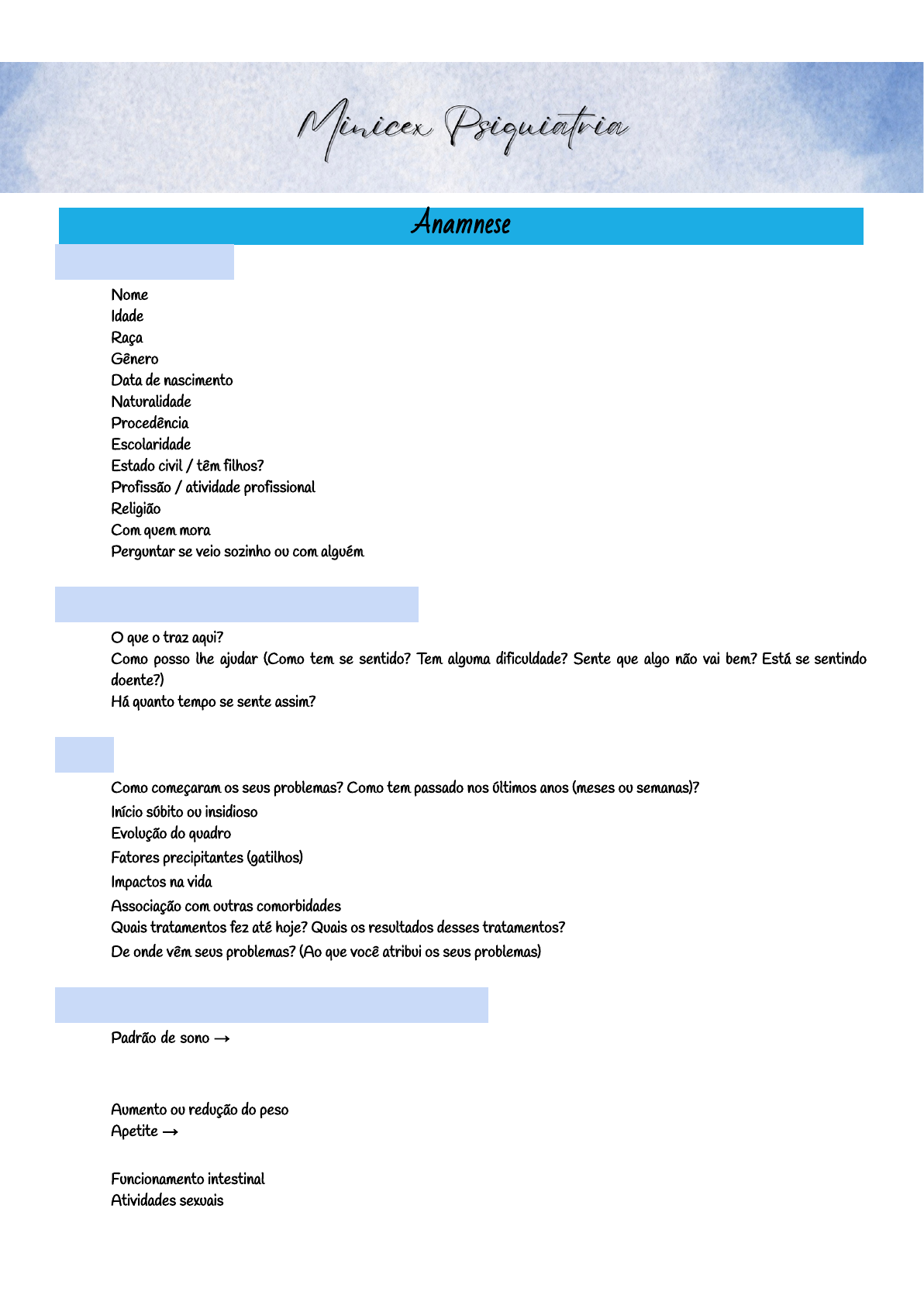 Sandy Vanessa Med 08 - UFPE-CAA Anamnese Identificação ● Nome ● Idade ● Raça ● Gênero ● Data de nascimento ● Naturalidade ● Procedência ● Escolaridade ● Estado civil / têm filhos? ● Profissão / atividade profissional ● Religião ● Com quem mora ● Perguntar se veio sozinho ou com alguém Queixa principal e duração ● O que o traz aqui? ● Como posso lhe ajudar (Como tem se sentido? Tem alguma dificuldade? Sente que algo não vai bem? Está se sentindo doente?) ● Há quanto tempo se sente assim? HDA ● Como começaram os seus problemas? Como tem passado nos últimos anos (meses ou semanas)? ● Início súbito ou insidioso ● Evolução do quadro ● Fatores precipitantes (gatilhos) ● Impactos na vida ● Associação com outras comorbidades ● Quais tratamentos fez até hoje? Quais os resultados desses tratamentos? ● De onde vêm seus problemas? (Ao que você atribui os seus problemas) Interrogatório sintomatológico ● Padrão de sono → que horas dorme, se demora para pegar no sono, se dorme a noite inteira ou fica acordando, se acorda restaurado, se sente sono durante o dia - se sim, quantificar se precisa dormir, se é um sono que atrapalha as atividades diárias) ● Aumento ou redução do peso ● Apetite → aumento ou redução / quantas refeições por dia / se tem preferência por algum tipo específico de alimento, se tem algum alimento que ele precisa comer todos os dias ou caso contrário fica incomodado) ● Funcionamento intestinal ● Atividades sexuais→ se realiza ou não e se tem alguma queixa - Dispareunia ? Sangramento pós-coito? 1 Sandy Vanessa Med 08 - UFPE-CAA ● Queixas sistêmicas ○ Prestar atenção às queixas neurológicas→ síncope, cefaleias, crises epilépticas, etc… Antecedentes pessoais ● Infância/puberdade/adolescência → condições do nascimento, condições de saúde, desenvolvimento motor, da linguagem e o controle esfincteriano, vida escolar, relacionamentos ● Vida sexual e métodos contraceptivos ● História laboral→ se estiver desempregado, perguntar sobre o último emprego) ● Histórico médico e exames → se tiver doenças, colocar em ordem cronológica de aparecimento; internações, cirurgias, doenças, convulsões, tratamentos ● Gestações ● Alergias Antecedentes familiares ● Histórico médico-familiar ○ Pode organizar colocando→HAS: Mãe (+); Pai (+) // Diabetes: Mãe (-); Pai (+) ○ Lembrar de câncer e doenças psiquiátricas perguntar sobre se já teve caso na família, mãe, pai, avós, irmãos, tios, primos ● Relação paciente-família ● Histórico psiquiátrico→ transtornos psiquiátricos, quadros demenciais, uso de substâncias ● Perdas recentes Hábitos de vida: ● Álcool ● Tabagismo ○ Se sim, calcular a carga tabágica ● Drogas ilícitas ● Hobbies ● Exercício físico→ realiza? Com que frequência? ● Medicamentos em uso→ Condições socioeconômicas ● Situação familiar, moradia ● Habitação ● Vida conjugal ● Relacionamento familiar ● Saneamento básico ● Redes de apoio ● Trabalho + relações Exame Psíquico Avaliação geral: ● Como o paciente veio à consulta? ● Tem acompanhante? O acompanhante quis entrar? ● Como ele entrou na sala? Indiferente / Calado / Nervoso 2 Sandy Vanessa Med 08 - UFPE-CAA ● Como está o autocuidado? ● Vestes adequadas? ● Cabelos arrumados? Alinhados ou em desalinho ● Adornos e maquiagens ● Dentes preservados? ● Higiene preservada? ● Atitude geral→ desconfiado, colaborativo, calmo, hostil, indiferente, desinibido, agressivo, inseguro, sedutor ● Mímica facial ● Fala com espontaneidade ou apenas quando perguntado? ● Solilóquio (paciente falando sozinho)→ quando você vê é um sinal e quando a família conta é um sintoma ● Proxêmica → note o espaço que o paciente estabelece entre si e as outras pessoas, bem como sua ocupação do espaço, posicionamento na sala, distância de conversação estabelecida com interlocutores. ● Movimentos do corpo: ○ Gestos relacionados à fala→ gestos que acompanham a linguagem verbal - “gestos ilustradores”. ○ Gestos independentes da fala → repare e anote se emite os “gestos adaptativos”, como os de autotoque ou de manuseamento de objetos, que podem revelar o estado de tensão e ansiedade. ○ Postura → repare na postura, que indica o nível de atenção ou envolvimento na interação com outras pessoas, o grau de empatia que desenvolve na entrevista; se revela postura tensa, rígida, associada à raiva, postura curvada associada à tristeza ou de outro tipo. ○ Comportamento tátil → note o modo, a frequência e a intensidade com que o paciente toca nos outros, o modo como dá seu aperto de mão (firme, forte, delicado, muito fraco e “largado”, apertado em demasia, etc.). ○ Expressões faciais→ procure descrever com particular atenção o rosto e as expressões faciais principais. ○ Comportamento ocular → repare na direção, quando e por quanto tempo o paciente olha na interação com as pessoas, o tempo e o modo como fixa seu olhar nos interlocutores. ● Paralinguagem→ descreva as principais qualidades vocais e vocalizações do paciente, repare a maneira como faz seu relato, como desenvolve sua narrativa. Consciência /Orientação Consciência→ grau de vigília do paciente e capacidade de estar desperto e atento ao que ocorre, perceber e conhecer os objetos ● Alterações quantitativas: ○ Lúcido/vigil→ normal 3 Sandy Vanessa Med 08 - UFPE-CAA ○ Obnubilado → Turvação da consciência ou sonolência patológica leve (lentidão da compreensão, confusão mental leve com atenção reduzida, sonolento, letárgico, dificuldade para se movimentar; não consegue caminhar; falta de resposta aos estímulos internos, como luzes, barulhos, vozes, lentidão na fala ou não consegue responder perguntas) ○ Torporoso → evidentemente sonolento, responde a estímulos a