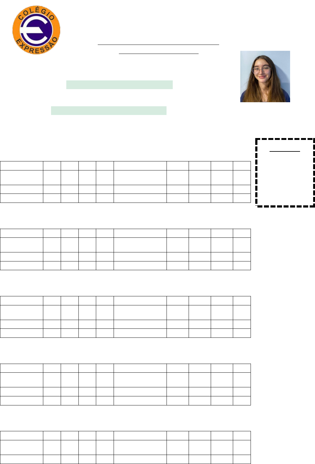 19 CURSO E COLÉGIO EXPRESSÃO Educação Infantil, Ensino Fundamental e Médio AVALIAÇÃO QUALITATIVA Ensino Fundamental II Ano Letivo: 2022 SÉRIE: 8º Ano “A” Nome do aluno: ANNA BEATRIZ LOPES CICHY Data de Nascimento: 09/05/2009 Nome do Mãe: ANNA CAROLINA LOPES CICHY Nome do Pai: DENILSON MONTANARI CICHY ( Legenda E – Excelente B – Bom R – Regular PM – P recisa Melhorar )Observação do (a) Professor (a): ARTE / PROF. :___________________ Bimestre 1º 2º 3º 4º Bimestre 1º 2º 3º 4º Pontualidade Comportamento Participação Tarefa de casa Atenção Freqüência CIÊNCIAS / PROF. :___________________ Bimestre 1º 2º 3º 4º Bimestre 1º 2º 3º 4º Pontualidade Comportamento Participação Tarefa de casa Atenção Freqüência EDUC.FÍSICA/ PROF. :___________________ Bimestre 1º 2º 3º 4º Bimestre 1º 2º 3º 4º Pontualidade Comportamento Participação Tarefa de casa Atenção Freqüência GEOGRAFIA / PROF. :___________________ Bimestre 1º 2º 3º 4º Bimestre 1º 2º 3º 4º Pontualidade Comportamento Participação Tarefa de casa Atenção Freqüência HISTÓRIA / PROF. :___________________ Bimestre 1º 2º 3º 4º Bimestre 1º 2º 3º 4º Pontualidade Comportamento Participação Tarefa de casa Atenção Freqüência CURSO E COLÉGIO EXPRESSÃO Educação Infantil, Ensino Fundamental e Médio AVALIAÇÃO QUALITATIVA Ensino Fundamental II Ano Letivo: 2022 SÉRIE: 8º Ano “A” Nome do aluno: ARTHUR HERGESELL MENDES DOS SANTOS Data de Nascimento: 18/03/2009 Nome do Mãe: FRANCISLENE HERGESELL DOS SANTOS Nome do Pai: VANDERSON AP CASTELARI DOS SANTOS ( Legenda E – Excelente B – Bom R – Regular PM – P recisa Melhorar )Observação do (a) Professor (a): ARTE / PROF. :___________________ Bimestre 1º 2º 3º 4º Bimestre 1º 2º 3º 4º Pontualidade Comportamento Participação Tarefa de casa Atenção Freqüência CIÊNCIAS / PROF. :___________________ Bimestre 1º 2º 3º 4º Bimestre 1º 2º 3º 4º Pontualidade Comportamento Participação Tarefa de casa Atenção Freqüência EDUC.FÍSICA/ PROF. :___________________ Bimestre 1º 2º 3º 4º Bimestre 1º 2º 3º 4º Pontualidade Comportamento Participação Tarefa de casa Atenção Freqüência GEOGRAFIA / PROF. :___________________ Bimestre 1º 2º 3º 4º Bimestre 1º 2º 3º 4º Pontualidade Comportamento Participação Tarefa de casa Atenção Freqüência HISTÓRIA / PROF. :___________________ Bimestre 1º 2º 3º 4º Bimestre 1º 2º 3º 4º Pontualidade Comportamento Participação Tarefa de casa Atenção Freqüência CURSO E COLÉGIO EXPRESSÃO Educação Infantil, Ensino Fundamental e Médio AVALIAÇÃO QUALITATIVA Ensino Fundamental II Ano Letivo: 2022 SÉRIE: 8º Ano “A” Nome do aluno: ARTHUR LEONEL KEREK Data de Nascimento: 22/10/2009 Nome do Mãe: FLAVIA LEONEL Nome do Pai: EVALDO HENRIQUE KEREK ( Legenda E – Excelente B – Bom R – Regular PM – P recisa Melhorar )Observação do (a) Professor (a): ARTE / PROF. :___________________ Bimestre 1º 2º 3º 4º Bimestre 1º 2º 3º 4º Pontualidade Comportamento Participação Tarefa de casa Atenção Freqüência CIÊNCIAS / PROF. :___________________ Bimestre 1º 2º 3º 4º Bimestre 1º 2º 3º 4º Pontualidade Comportamento Participação Tarefa de casa Atenção Freqüência EDUC.FÍSICA/ PROF. :___________________ Bimestre 1º 2º 3º 4º Bimestre 1º 2º 3º 4º Pontualidade Comportamento Participação Tarefa de casa Atenção Freqüência GEOGRAFIA / PROF. :___________________ Bimestre 1º 2º 3º 4º Bimestre 1º 2º 3º 4º Pontualidade Comportamento Participação Tarefa de casa Atenção Freqüência HISTÓRIA / PROF. :___________________ Bimestre 1º 2º 3º 4º Bimestre 1º 2º 3º 4º Pontualidade Comportamento Participação Tarefa de casa Atenção Freqüência CURSO E COLÉGIO EXPRESSÃO Educação Infantil, Ensino Fundamental e Médio AVALIAÇÃO QUALITATIVA Ensino Fundamental II Ano Letivo: 2022 SÉRIE: 8º Ano “A” Nome do aluno: DANILO BERLANDA Data de Nascimento: 26/02/2009 Nome do Mãe: THALITA ALMEIDA SILVA Nome do Pai: JEYSON BERLANDA ( Legenda E – Excelente B – Bom R – Regular PM – P recisa Melhorar )Observação do (a) Professor (a): ARTE / PROF. :___________________ Bimestre 1º 2º 3º 4º Bimestre 1º 2º 3º 4º Pontualidade Comportamento Participação Tarefa de casa Atenção Freqüência CIÊNCIAS / PROF. :___________________ Bimestre 1º 2º 3º 4º Bimestre 1º 2º 3º 4º Pontualidade Comportamento Participação Tarefa de casa Atenção Freqüência EDUC.FÍSICA/ PROF. :___________________ Bimestre 1º 2º 3º 4º Bimestre 1º 2º 3º 4º Pontualidade Comportamento Participação Tarefa de casa Atenção Freqüência GEOGRAFIA / PROF. :___________________ Bimestre 1º 2º 3º 4º Bimestre 1º 2º 3º 4º Pontualidade Comportamento Participação Tarefa de casa Atenção Freqüência HISTÓRIA / PROF. :___________________ Bimestre 1º 2º 3º 4º Bimestre 1º 2º 3º 4º Pontualidade Comportamento Participação Tarefa de casa Atenção Freqüência CURSO E COLÉGIO EXPRESSÃO Educação Infantil, Ensino Fundamental e Médio AVALIAÇÃO QUALITATIVA Ensino Fundamental II Ano Letivo: 2022 SÉRIE: 8º Ano “A” Nome do aluno: FLAVIA WILHELM Data de Nascimento: 19/01/2900 Nome do Mãe: DAIANE CRISITNA SAUERESSIG Nome do Pai: FABIO ADILSON WILHELM ( Legenda E – Excelente B – Bom R – Regular PM – P recisa Melhorar )Observação do (a) Professor (a): ARTE / PROF. :___________________ Bimestre 1º 2º 3º 4º Bimestre 1º 2º 3º 4º Pontualidade Comportamento Participação Tarefa de casa Atenção Freqüência CIÊNCIAS / PROF. :___________________ Bimestre 1º 2º 3º 4º Bimestre 1º 2º 3º 4º Pontualidade Comportamento Participação Tarefa de casa Atenção Freqüência EDUC.FÍSICA/ PROF. :___________________ Bimestre 1º 2º 3º 4º Bimestre 1º 2º 3º 4º Pontualidade Comportamento Participação Tarefa de casa Atenção Freqüência GEOGRAFIA / PROF. :______________