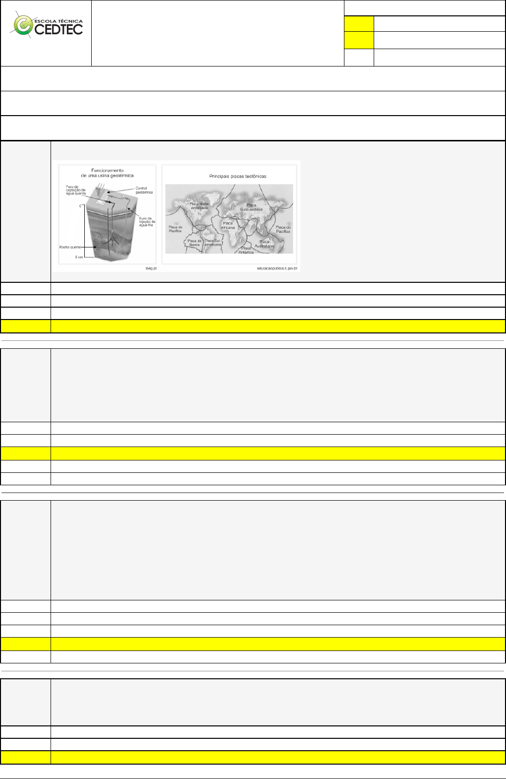 Pincel Atômico - 16/04/2024 12:55:49 1/2 LUCAS DE SOUZA DOS SANTOS Exercício Caminho do Conhecimento - Etapa 10 (1195) Atividade finalizada em 12/11/2023 14:54:06 (1302519 / 1) LEGENDA Resposta correta na questão # Resposta correta - Questão Anulada X Resposta selecionada pelo Aluno Disciplina: ENERGIAS RENOVÁVEIS [838672] - Avaliação com 4 questões, com o peso total de 6,50 pontos [capítulos - 115] Turma: Curso Técnico: Automação Industrial - Grupo: EAD - 05/23 - EAD AUT [88401] Aluno(a): 91457450 - LUCAS DE SOUZA DOS SANTOS - Respondeu 4 questões corretas, obtendo um total de 6,50 pontos como nota [350263_1524 19] Questão 001 As usinas geotérmicas são uma forma alternativa de geração de energia elétrica por utilizarem as elevadas temperaturas do próprio subsolo em algumas regiões. Considere as informações do esquema e do mapa a seguir: O país cuja localização espacial proporciona condições ideais para amplo aproveitamento da energia geotérmica é: Uruguai Austrália Nigéria X Islândia [350265_1524 26] Questão 002 A energia geotérmica tem sua origem no núcleo derretido da Terra, onde as temperaturas atingem 4.000 ºC. Essa energia é primeiramente produzida pela decomposição de materiais radiativos dentro do planeta. Em fontes geotérmicas, a água, aprisionada em um reservatório subterrâneo, é aquecida pelas rochas ao redor e fica submetida a altas pressões, podendo atingir temperaturas de até 370 ºC sem entrar em ebulição. Ao ser liberada na superfície, à pressão ambiente, ela se vaporiza e se resfria, formando fontes ou gêiseres. O vapor de poços geotérmicos é separado da água e é utilizado no funcionamento de turbinas para gerar eletricidade. A água quente pode ser utilizada para aquecimento direto ou em usinas de dessalinização. Roger A. Hinrichs e Merlin Kleinbach. Energia e meio ambiente. Ed. ABDR (com adaptações). Depreende-se das informações acima que as usinas geotérmicas Podem aproveitar a energia química transformada em térmica no processo de dessalinização. Utilizam a mesma fonte primária de energia que as usinas nucleares, sendo, portanto, semelhantes os riscos decorrentes de ambas. X Assemelham-se às usinas nucleares no que diz respeito à conversão de energia térmica em cinética e, depois, em elétrica. Funcionam com base na conversão de energia potencial gravitacional em energia térmica. Transformam inicialmente a energia solar em energia cinética e, depois, em energia térmica. [350264_1524 25] Questão 003 A energia elétrica é a principal fonte de energia do mundo e uma das formas de energia que a humanidade mais utiliza na atualidade. Sobre isso, assinale as alternativas abaixo com (V) verdadeiro ou (F) falso. ( ) As hidrelétricas produzem energia a partir das águas dos rios, logo são consideradas fontes de energia renovável. ( ) As fontes de energia produzidas pelas termoelétricas não são renováveis, pois grande parte utiliza combustível fóssil e a sua queima libera grande quantidade de (CO2) dióxido de carbono para a atmosfera. ( ) A energia elétrica geotérmica causa grande impacto ambiental, de forma que sua produção é restrita, porém possui um alto rendimento e versatilidade. ( ) A energia eólica é produzida a partir de hélices presas em um pilar que giram com a força dos ventos, transformando em energia elétrica. ( ) A energia das marés ou energia maremotriz, é uma forma de geração de eletricidade por meio do movimento das marés. A sequência correta de cima para baixo é: F, V, F, V,F V, V, V, V, V. V, F, V, F, V. X V, V, F, V, V F, F, V, F, V. [350264_1524 23] Questão 004 "O Google anunciou nesta terça-feira (19/08) que vai investir mais de 10 milhões de dólares em tecnologia geotérmica avançada. A entidade filantrópica da empresa, a Google.org, afirmou que o investimento será destinado aos chamados Sistemas Geotérmicos Melhorados." http://info.abril.com.br/aberto/infonews/082008/19082008-21.shl. Entre as vantagens do uso de energia geotérmica, pode-se incluir: A facilidade de transmissão da energia para regiões distantes de onde é produzida, barateando os custos finais de distribuição. O baixo custo da produção, por ser uma fonte energética que não exige grandes investimentos na infraestrutura de captação. X A baixa emissão, praticamente nula, de gases causadores do aquecimento global, tornando-a uma fonte de energia mais limpa. Pincel Atômico - 16/04/2024 12:55:49 2/2 Os modestos investimentos necessários para a pesquisa e exploração dos campos geotérmicos, que usa a mesma tecnologia da exploração petrolífera. A expansão do calor produzido nos campos geotérmicos que garantem a diminuição da temperatura no subsolo, facilitando a produção elétrica.
