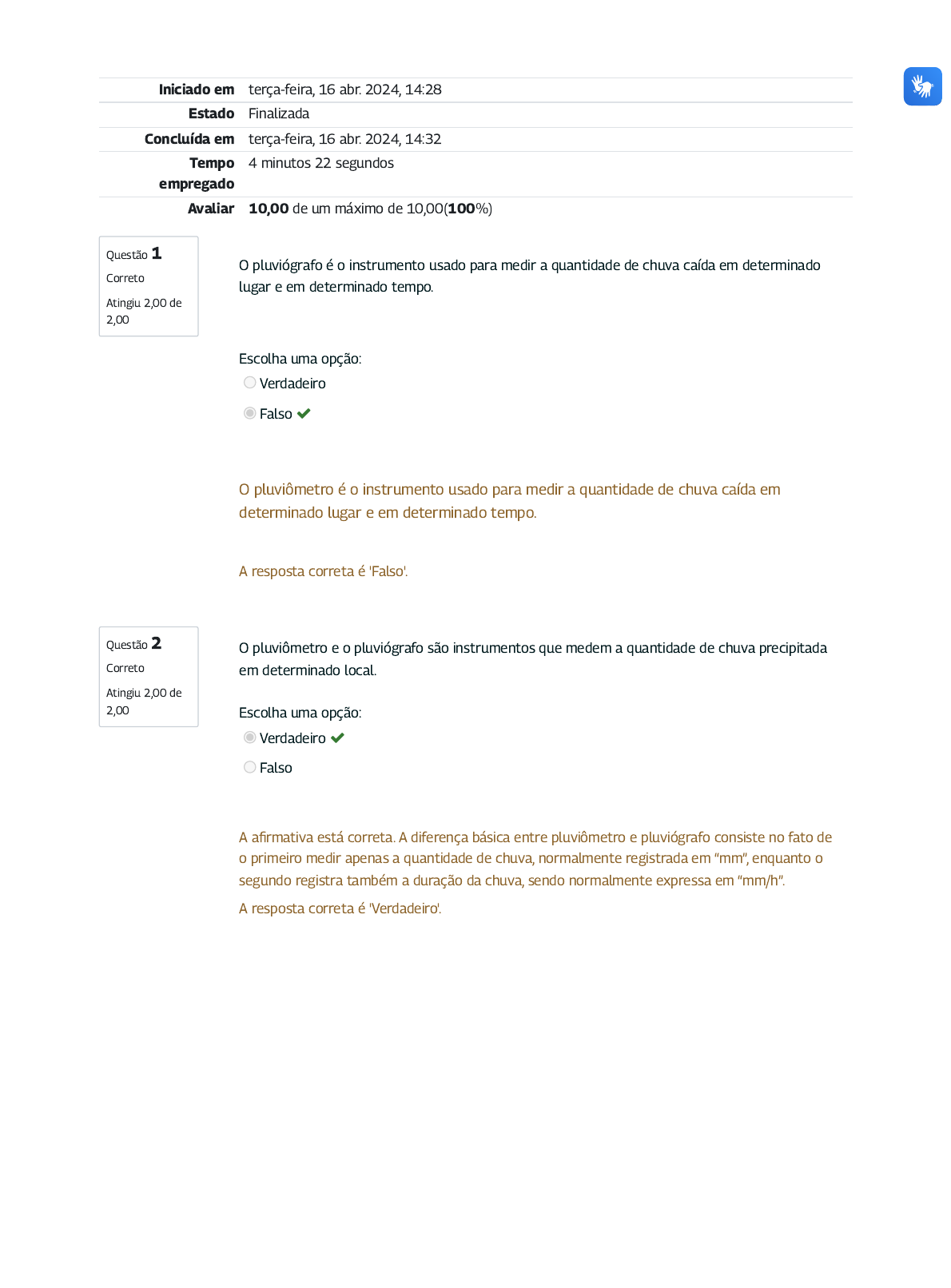 Questão 1 Correto Atingiu 2,00 de 2,00 Questão 2 Correto Atingiu 2,00 de 2,00 Iniciado em terça-feira, 16 abr. 2024, 14:28 Estado Finalizada Concluída em terça-feira, 16 abr. 2024, 14:32 Tempo empregado 4 minutos 22 segundos Avaliar 10,00 de um máximo de 10,00(100%) O pluviógrafo é o instrumento usado para medir a quantidade de chuva caída em determinado lugar e em determinado tempo. Escolha uma opção: Verdadeiro Falso O pluviômetro é o instrumento usado para medir a quantidade de chuva caída em determinado lugar e em determinado tempo. A resposta correta é 'Falso'. O pluviômetro e o pluviógrafo são instrumentos que medem a quantidade de chuva precipitada em determinado local. Escolha uma opção: Verdadeiro Falso A a�rmativa está correta. A diferença básica entre pluviômetro e pluviógrafo consiste no fato de o primeiro medir apenas a quantidade de chuva, normalmente registrada em “mm”, enquanto o segundo registra também a duração da chuva, sendo normalmente expressa em “mm/h”. A resposta correta é 'Verdadeiro'. Questão 3 Correto Atingiu 2,00 de 2,00 Questão 4 Correto Atingiu 2,00 de 2,00 Os dados de chuva obtidos por meio da metodologia proposta pelo Eng. Otto Pfafstetter podem ser utilizados em qualquer estudo hidrológico voltado para elaboração de projetos de infraestrutura rodoviária. Escolha uma opção: Verdadeiro Falso Deve-se dar preferência aos dados obtidos de estações pluviométricas/pluviográ�cas mais próximas e atualizadas o possível da região do projeto. Quando estes dados não estiverem disponíveis nas proximidades do local da obra, deve-se recorrer a dados bibliográ�cos, entre os quais destaca-se o livro "Chuvas Intensas do Brasil”, do Engº. Otto Pfafstetter. A resposta correta é 'Falso'. A delimitação de bacias hidrográ�cas pode ser feita tanto de modo manual como por meio de programas computacionais. A delimitação de cada bacia hidrográ�ca é feita numa carta topográ�ca, seguindo as linhas das cristas das elevações circundantes da seção do curso d’água que foi interceptado pelo traçado da rodovia ou ferrovia. Escolha uma opção: Verdadeiro Falso A delimitação de bacias hidrográ�cas pode ser feita tanto de forma manual, valendo-se de cartas topográ�cas impressas ou digitais, bem como por meio de programas computacionais. A resposta correta é 'Verdadeiro'. Questão 5 Correto Atingiu 2,00 de 2,00 O tempo de retorno é o tempo necessário para uma gota d´água caminhar super�cialmente do ponto mais distante da bacia de contribuição até sua exutória. Escolha uma opção: Verdadeiro Falso O tempo de concentração é o tempo necessário para uma gota d´água caminhar super�cialmente do ponto mais distante da bacia de contribuição até sua exutória. Também pode ser de�nido como o tempo de percurso em que o de�úvio leva para atingir o curso principal desde os pontos mais longínquos da bacia de contribuição até o local onde se deseja de�nir a descarga, ou ainda, o intervalo de tempo entre o início da precipitação e o instante em que todos os pontos da bacia estão contribuindo para a vazão. A resposta correta é 'Falso'.