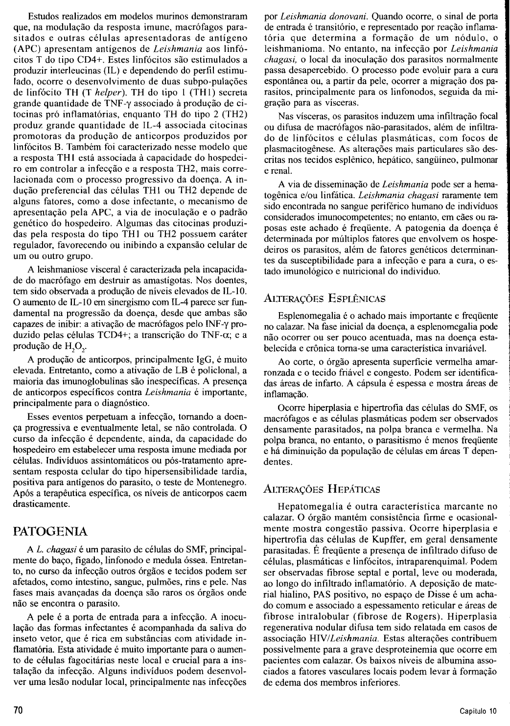 Estudos realizados em modelos murinos demonstraram que, na modulação da resposta imune, macrófagos para- sitados e outras células apresentadoras de antígeno (APC) apresentam antígenos de Leishmania aos linfó- citos T do tipo CD4+. Estes linfócitos são estimulados a produzir interleucinas (IL) e dependendo do perfil estimu- lado, ocorre o desenvolvimento de duas subpo-pulações de linfócito TH (T helper). TH do tipo 1 (TH1) secreta grande quantidade de TNF-y associado a produção de ci- tocinas pró inflamatórias, enquanto TH do tipo 2 (TH2) produz grande quantidade de IL-4 associada citocinas promotoras da produção de anticorpos produzidos por linfócitos B. Também foi caracterizado nesse modelo que a resposta THI está associada a capacidade do hospedei- ro em controlar a infecção e a resposta TH2, mais corre- lacionada com o processo progressivo da doença. A in- dução preferencial das células THI ou TH2 depende de alguns fatores, como a dose infectante, o mecanismo de apresentação pela APC, a via de inoculação e o padrão genético do hospedeiro. Algumas das citocinas produzi- das pela resposta do tipo THl ou TH2 possuem caráter regulador, favorecendo ou inibindo a expansão celular de um ou outro gmpo. A leishmaniose visceral é caracterizada pela incapacida- de do macrófago em destruir as amastígotas. Nos doentes, tem sido observada a produção de níveis elevados de IL-10. O aumento de IL- 1 O em sinergismo com IL-4 parece ser hn- damental na progressão da doença, desde que ambas são capazes de inibir: a ativação de macrófagos pelo INF-y pro- duzido pelas células TCD4+; a transcrição do TNF-a; e a produção de H,O,. A produção de anticorpos, principalmente IgG, é muito elevada. Entretanto, como a ativação de LB é policlonal, a maioria das imunoglobulinas são inespecíficas. A presença de anticorpos específicos contra Leishmania é importante, principalmente para o diagnóstico. Esses eventos perpetuam a infecção, tomando a doen- ça progressiva e eventualmente letal, se não controlada. O curso da infecção é dependente, ainda, da capacidade do hospedeiro em estabelecer uma resposta imune mediada por células. Indivíduos assintomáticos ou pós-tratamento apre- sentam resposta celular do tipo hipersensibilidade tardia, positiva para antigenos do parasito, o teste de Montenegro. Após a terapêutica específica, os níveis de anticorpos caem drasticamente. PATOGENIA A L. chagasi é um parasito de células do SMF, principal- mente do baço, fígado, linfonodo e medula óssea. Entretan- to, no curso da infecção outros órgãos e tecidos podem ser afetados, como intestino, sangue, pulmões, rins e pele. Nas fases mais avançadas da doença são raros os órgãos onde não se encontra o parasito. A pele é a porta de entrada para a infecção. A inocu- lação das formas infectantes é acompanhada da saliva do inseto vetor, que é rica em substâncias com atividade in- flamatória. Esta atividade é muito importante para o aumen- to de células fagocitárias neste local e crucial para a ins- talação da infecção. Alguns indivíduos podem desenvol- ver uma lesão nodular local, principalmente nas infecções por Leishmania donovani. Quando ocorre, o sinal de porta de entrada é transitório, e representado por reação inflarna- tória que determina a formação de um nódulo, o leishmanioma. No entanto, na infecção por Leishmania chagasi, o local da inoculação dos parasitos normalmente passa desapercebido. O processo pode evoluir para a cura espontânea ou, a partir da pele, ocorrer a migração dos pa- rasitos, principalmente para os linfonodos, seguida da mi- gração para as vísceras. Nas vísceras, os parasitos induzem uma infiltração focal ou dihsa de macrófagos não-parasitados, além de infiltra- do de linfócitos e células plasmáticas, com focos de plasmacitogênese. As alterações mais particulares são des- critas nos tecidos esplênico, hepático, sanguíneo, pulmonar e renal. A via de disseminação de Leishmania pode ser a hema- togênica elou linfática. Leishmania chagasi raramente tem sido encontrada no sangue periférico humano de indivíduos considerados imunocompetentes; no entanto, em cães ou ra- posas este achado é frequente. A patogenia da doença é determinada por múltiplos fatores que envolvem os hospe- deiros os parasitos, além de fatores genéticos determinan- tes da susceptibilidade para a infecção e para a cura, o es- tado imunológico e nutricional do indivíduo. Esplenomegalia é o achado mais importante e freqüente 1 no calazar. Na fase inicial da doença, a esplenomegalia pode j não ocorrer ou ser pouco acentuada, mas na doença esta- 1 belecida e crônica toma-se uma característica invariável. Ao corte, o órgão apresenta superfície vermelha amar- i ronzada e o tecido friável e congesto. Podem ser identifica- das áreas de infarto. A cápsula é espessa e mostra áreas de inflamação. Ocorre hiperplasia e hipertrofia das células do SMF, os macrófagos e as células plasmáticas podem ser observados densamente parasitados, na polpa branca e vermelha. Na polpa branca, no entanto, o parasitismo é menos frequente e há diminuição da população de células em áreas T depen- dentes. Hepatomegalia é outra característica marcante no calazar. O órgão mantém consistência firme e ocasional- mente mostra congestão passiva. Ocorre hiperplasia e hipertrofia das células de Kupffer, em geral densamente parasitadas. É frequente a presença de infiltrado difuso de células, plasmáticas e linfócitos, intraparenquimal. Podem ser observadas fibrose septal e portal, leve ou moderada, ao longo do infiltrado inflamatório. A deposição de mate- rial hialino, PAS positivo, no espaço de Disse é um acha- do comum e associado a espessamento reticular e áreas de fibrose intralobular (fibrose de Rogers). Hiperplasia regenerativa nodular dihsa tem sido relatada em casos de associa