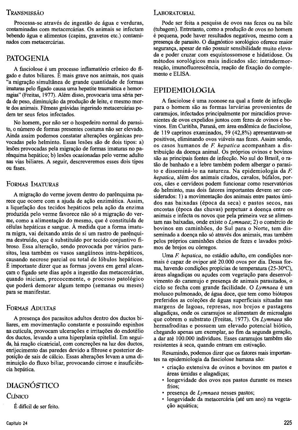 Processa-se através de ingestão de água e verduras, contaminadas com metacercárias. Os animais se infectam bebendo água e alimentos (capins, gravetos etc.) contami- nados com metacercárias. PATOGENIA A fasciolose é um processo inflamatório crônico do fi- gado e dutos biliares. E mais grave nos animais, nos quais "a migração simultânea de grande quantidade de formas imaturas pelo figado causa uma hepatite traumática e hemor- ragias" (Freitas, 1977). Além disso, provocaria uma séria per- da de peso, diminuição da produção de leite, e mesmo mor- te dos animais. Fêmeas grávidas ingerindo metacercárias po- dem ter seus fetos infectados. No homem, por não ser o hospedeiro normal do parasi- to, o número de formas presentes costuma não ser elevado. Ainda assim podemos constatar alterações orgânicas pro- vocadas pelo helminto. Essas lesões são de dois tipos: a) lesões provocadas pela migração de formas imaturas no pa- rênquima hepático; b) lesões ocasionadas pelo verme adulto nas vias biliares. A seguir, descreveremos esses dois tipos ou fases. A migração do verme jovem dentro do parênquima pa- rece que ocorre com a ajuda de ação enzimática. Assim, a liquefação dos tecidos hepáticos pela ação da enzima produzida pelo verme favorece não só a migração do ver- me, como a alimentação do mesmo, que é constituída de células hepáticas e sangue. A medida que a forma imatu- ra migra, vai deixando atrás de si um rastro de parênqui- ma destruído, que é substituído por tecido conjuntivo fi- broso. Essa alteração, sendo provocada por vários para- sitos, lesa também os vasos sanguíneos intra-hepáticos, causando necrose parcial ou total de lóbulos hepáticos. É importante dizer que as formas jovens em geral alcan- çam o figado sete dias após a ingestão das metacercárias, quando iniciam, precocemente, o processo patológico que poderá demorar algum tempo (semanas ou meses) para se manifestar. A presença dos parasitos adultos dentro dos ductos bi- liares, em movimentação constante e possuindo espinhos na cutícula, provocam ulcerações e imtações do endotélio dos ductos, levando a uma hiperplasia epitelial. Em segui- da, há reação cicatricial, com concreções na luz dos ductos, enrijecimento das paredes devido a fibrose e posterior de- posição de sais de cálcio. Essas alterações levam a uma di- minuição do fluxo biliar, provocando cirrose e insuficiên- cia hepatica. É dificil de ser feito. Pode ser feita a pesquisa de ovos nas fezes ou na bile (tubagem). Entretanto, como a produção de ovos no homem é pequena, pode haver resultados negativos, mesmo com a presença de parasito. O diagnóstico sorológico oferece maior segurança, apesar de não possuir sensibilidade muito eleva- da-e ~ o d e r cruzar com esauistossomose e hidatidose. Os métodos sorológicos mais indicados são: intradermor- reação, imunofluorescência, reação de fixação do comple- mento e ELISA. EPIDEMIOLOGIA A fasciolose é uma zoonose na qual a fonte de infecção para o homem são as formas larvárias provenientes de caramujos, infectados principalmente por miracidios prove- nientes de ovos expelidos juntos com fezes de ovinos e bo- vinos. Em Curitiba, Paraná, em área endêrnica de fasciolose, de 119 caprinos examinados, 59 (42,8%) apresentavam-se positivos, eliminando ovos viáveis nas fezes. Assim sendo, os casos humanos de E hepatica acompanham a dis- tribuição da doença animal. Os próprios ovinos e bovinos são as principais fontes de infecção. No sul do Brasil, o ra- tão de banhado e a lebre também podem albergar o parasi- to e disseminá-lo na natureza. Na epidemiologia da E hepatica, além dos animais citados, cavalos, búfalos, por- cos, cães e cervídeos podem funcionar como reservatórios do helminto, mas dois fatores importantes devem ser con- siderados: 1) a movimentação dos animais entre pastos úmi- dos nas baixadas (época da seca) e pastos secos, nas encostas (época das chuvas) perpetuar a doença entre os animais e infecta os novos que pela primeira vez se alimen- tam nas baixadas, onde existe o Lymnaea; 2) o comércio de bovinos em caminhões, do Sul para o Norte, tem dis- seminado a doença não só através dos animais, mas também pelos próprios caminhões cheios de fezes e lavados próxi- mos de brejos ou córregos. Uma E hepatica, no estádio adulto, em condições nor- mais é capaz de ovipor até 20.000 ovos por dia. Dessa for- ma, havendo condições propícias de temperatura (25-30"C), áreas alagadiças ou açudes com vegetação para desenvol- vimento do caramujo e presença de animais parasitados, o ciclo se fecha com grande facilidade. O Lymnaea é um molusco pulmonado, de água doce, que tem como biótopos preferidos as coleções de águas superficiais situadas nas margens de lagoas, represas, nos brejos e pastagens alagadiças, onde os caramujos se alimentam de microalgas que cobrem o substrato (Freitas, 1977). Os Lymnaea são hermafroditas e possuem um elevado potencial biótico, chegando apenas um exemplar, ao fim da segunda geração, a dar até 100.000 indivíduos. Esses caramujos também são resistentes a seca, quando entram em estivação. Resumindo, podemos dizer que os fatores mais importan- tes na epidemiologia da fasciolose humana são: criação extensiva de ovinos e bovinos em pastos e áreas úmidas e alagadiças; longevidade dos ovos nos pastos durante os meses frios; presença de Lymnaea nesses pastos; longevidade da metacercária (até um ano) na vegeta- ção aquática; Capitulo 24 225 presença do parasito nos animais; presença de roedores e outros reservatórios nessas regiões, disseminando o parasito pelas áreas alagadiças, ainda indenes de E;: hepatica; plantação de agrião em regiões parasitadas; hábito de pessoas comerem agrião ou beberem água proveniente de córregos ou minas em regiões onde o parasito é encontrado em animais domésticos ou silvestres. No fo
