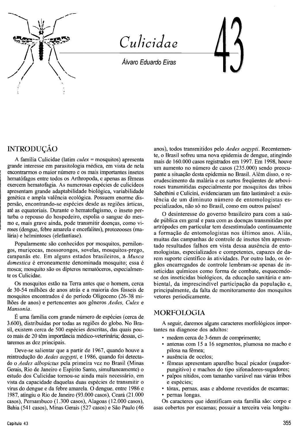 Álvaro Eduardo Eiras A família Culicidae (latim culex = mosquitos) apresenta grande interesse em parasitologia médica, em vista de nela encontrarmos o maior número e os mais importantes insetos hematófagos entre todos os Arthropoda, e apenas as fêmeas exercem hematofagia. As numerosas espécies de culicídeos apresentam grande adaptabilidade biológica, variabilidade genética e ampla valência ecológica. Possuem enorme dis- persão, encontrando-se espécies desde as regiões árticas, até as equatoriais. Durante o hematofagismo, o inseto per- turba o repouso do hospedeiro, espolia o sangue do mes- mo e, mais grave ainda, pode transmitir doenças, como vi- roses (dengue, febre amarela e encefalites), protozooses (ma- lária) e helmintoses (elefantíase). Popularmente são conhecidos por mosquitos, pernilon- gos, muriçocas, mossorongos, sovelas, mosquitos-prego, carapanãs etc. Em alguns estados brasileiros, a Musca domestica é erroneamente denominada mosquito; essa é mosca; mosquito são os dípteros nematóceros, especialmen- te os Culicidae. Os mosquitos estão na Terra antes que o homem, cerca de 30-54 milhões de anos atrás e a maioria dos fósseis de mosquitos encontrados é do período Oligoceno (26-38 mi- lhões de anos) e pertencentes aos gêneros Aedes, Culex e Mansonia. É uma família com grande número de espécies (cerca de 3.600), distribuídas por todas as regiões do globo. No Bra- sil, existem cerca de 500 espécies descritas, das quais pou- co mais de 20 têm importância médico-veterinária; dessas, ci- taremos as dez principais. Deve-se salientar que a partir de 1967, quando houve a reintrodução do Aedes aegypti, e 1986, quando foi detecta- do o Aedes albopictus pela primeira vez no Brasil (Minas Gerais, Rio de Janeiro e Espírito Santo, simultaneamente) o estudo dos Culicidae tomou-se ainda mais necessário, em vista da capacidade daquelas duas espécies de transmitir o vinis do dengue e da febre amarela. O dengue, entre 1986 e 1987, atingiu o Rio de Janeiro (93.000 casos), Ceará (2 1 .O00 casos), Pemambuco (1.300 casos), Alagoas (12.000 casos), Bahia (541 casos), Minas Gerais (527 casos) e São Paulo (46 anos), todos transmitidos pelo Aedes aegypti. Recentemen- te, o Brasil sofreu uma nova epidemia de dengue, atingindo mais de 160.000 casos regisirados em 1997. Em 1998, houve um aumento no número de casos (235.000) sendo preocu- pante a situação desta epidemia no Brasil. Além disso, o re- crudescimento da malária e os surtos frequentes de arbovi- roses transmitidas especialmente por mosquitos das tribos Sabethini e Culicini, evidenciaram um fato lastimável: a exis- tência de um diminuto número de entomologistas es- pecializado~, não só no Brasil, como em outros países! O desinteresse do governo brasileiro para com a saú- de pública em geral e para com as doenças transmitidas por artrópodes em particular tem desestimulado continuamente a formação de entomologistas nos últimos anos. Aliás, muitas das campanhas de controle de insetos têm apresen- tado resultados falhos em vista dessa ausência de ento- mologistas, especializados e competentes, capazes de da- rem suporte científico as atividades. Por outro lado, os ór- gãos encarregados de controle lembram-se apenas de in- seticidas químicos como forma de combate, esquecendo- se dos inseticidas biológicos, da educação sanitária e am- biental, da imprescindível participação da população e, principalmente, da falta de monitoramento dos mosquitos vetores periodicamente. MORFOLOGIA A seguir, daremos alguns caracteres morfológicos impor- tantes na diagnose dos adultos: medem cerca de 3-6mm de comprimento; antenas com 15 a 16 segmentos, plumosa no macho e pilosa na fêmea; ausência de ocelos; fêmeas apresentam aparelho bucal picador (sugador- pungitivo) e machos do tipo sifonadores-sugadores; palpos nítidos, com tamanho variável nas várias tribos e espécies; tórax, pernas, asas e abdome revestidos de escamas; pernas longas. Os caracteres que identificam esta família são: corpo e asas cobertos por escamas; possuir a terceira veia longitu- Capitulo 43 dinal (R4 + 5) reta e colocada entre duas veias forquilhadas. unidos, formando "jangada" sobre a água. Ex.: Culex Escamas de tonalidades uniformes ou diferentes, formando quinquefasciatus (Figs. 43.3 e 43.5). manchas, são importantes na diagnose específica. Nas Figs. 43.1 a 43.4 encontram-se os detalhes para identi- ficação dos sexos e das subfamílias Anophelinae e Culicinae. BIOLOGIA Os mosquitos também são holometábolos, isto é, passam pelas fases de ovo, larva (quatro estágios = LI, L2, L3 e LA), pupa e adulto (Fig. 43.6). O número de ovos é bastante variável para cada es- pécie, mas usualmente uma fêmea ovipõe de 100 a 300 ovos por postura. Esta é sempre feita após o repasto sanguíneo, variando de duas a oito posturas por fêmea. O Culex quinquefasciatus coloca, em média, 120 ovos por vez. A oviposição pode ser feita de maneiras variáveis. isolados sobre a água. Ex.: Anopheles sp (Fig. 43.3); isolados e fora d'água, na parede do recipiente. Ex.: Aedes aegvpti (Fig. 43.3); Os ovos, após um período médio de dois a quatro dias, em temperatura média de 26"C, dão origem as larvas. Estas movimentam-se ativamente e se alimentam cons- tantemente de plâncton. A respiração usual das larvas é direta, através dos espiráculos respiratórios situados no último segmento abdominal e, indireta, através do tegu- mento, quando estão submersas. Algumas espécies pos- suem larvas predadoras (achegando ao canibalismo), como so gêneros Toxorhynchites, Psorophora, Sabethes e Culex (Lutzia). Após um período variável de 10-20 dias, a larva de quarto estágio transforma-se em pupa. Esta não se alimenta, mas respira e movimenta-se ativamente. Permanece nesta fase por um período de um a três dias, dando então liberdade ao adulto. Esse emerge pelo cefalotórax da pupa, através de uma fenda em "T". O 