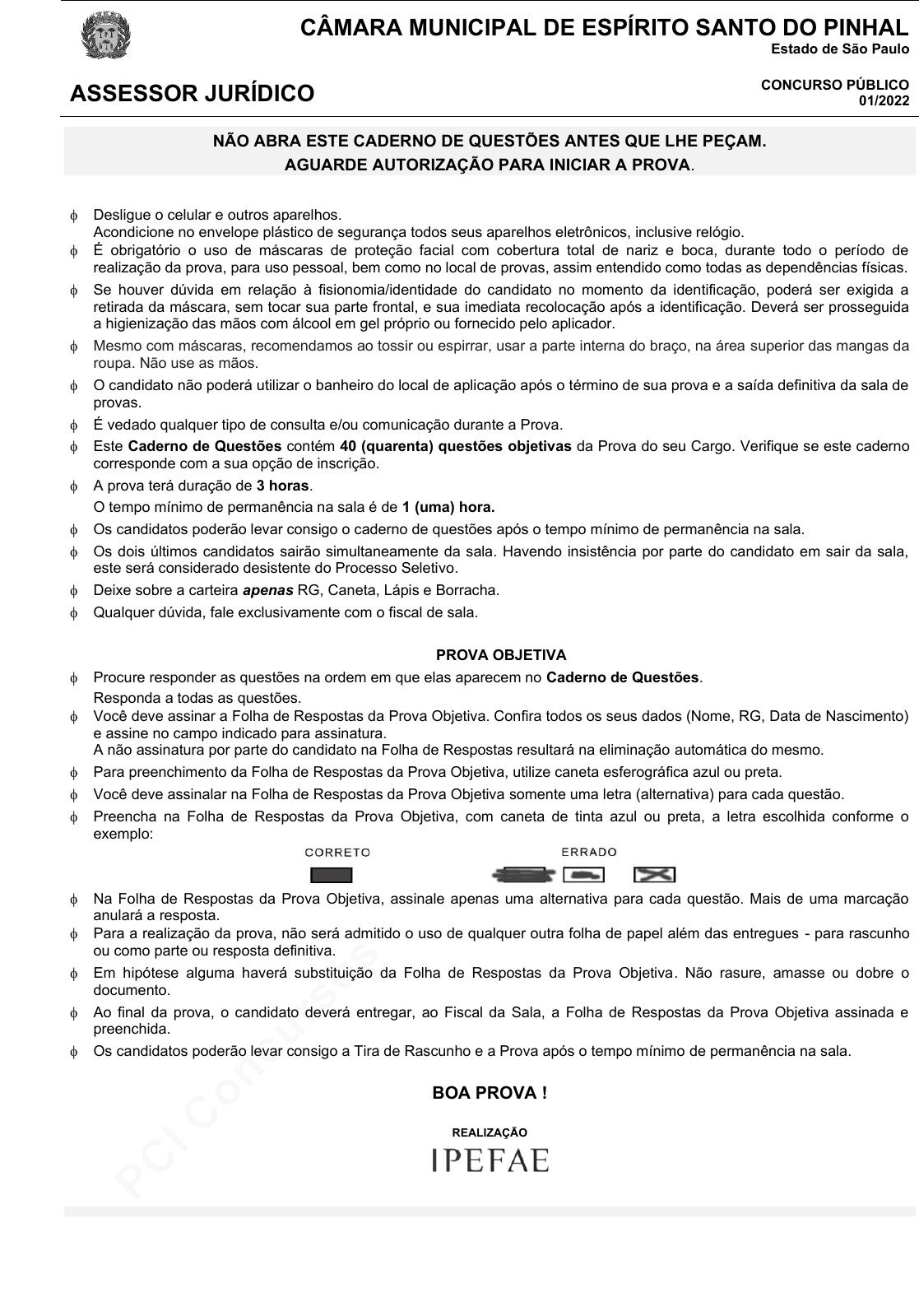 pcimarkpci MjgwNDowZDQxOmU2ZGQ6YzcwMDo1OWM4OjFhY2Q6OWVhMjo1NDZk:VHVlLCAxNiBBcHIgMjAyNCAwOToxNDowNCAtMDMwMA== www.pciconcursos.com.br CÂMARA MUNICIPAL DE ESPÍRITO SANTO DO PINHAL Estado de São Paulo ASSESSOR JURÍDICO CONCURSO PÚBLICO 01/2022 NÃO ABRA ESTE CADERNO DE QUESTÕES ANTES QUE LHE PEÇAM. AGUARDE AUTORIZAÇÃO PARA INICIAR A PROVA. Desligue o celular e outros aparelhos. Acondicione no envelope plástico de segurança todos seus aparelhos eletrônicos, inclusive relógio. É obrigatório o uso de máscaras de proteção facial com cobertura total de nariz e boca, durante todo o período de realização da prova, para uso pessoal, bem como no local de provas, assim entendido como todas as dependências físicas. Se houver dúvida em relação à fisionomia/identidade do candidato no momento da identificação, poderá ser exigida a retirada da máscara, sem tocar sua parte frontal, e sua imediata recolocação após a identificação. Deverá ser prosseguida a higienização das mãos com álcool em gel próprio ou fornecido pelo aplicador. Mesmo com máscaras, recomendamos ao tossir ou espirrar, usar a parte interna do braço, na área superior das mangas da roupa. Não use as mãos. O candidato não poderá utilizar o banheiro do local de aplicação após o término de sua prova e a saída definitiva da sala de provas. É vedado qualquer tipo de consulta e/ou comunicação durante a Prova. Este Caderno de Questões contém 40 (quarenta) questões objetivas da Prova do seu Cargo. Verifique se este caderno corresponde com a sua opção de inscrição. A prova terá duração de 3 horas. O tempo mínimo de permanência na sala é de 1 (uma) hora. Os candidatos poderão levar consigo o caderno de questões após o tempo mínimo de permanência na sala. Os dois últimos candidatos sairão simultaneamente da sala. Havendo insistência por parte do candidato em sair da sala, este será considerado desistente do Processo Seletivo. Deixe sobre a carteira apenas RG, Caneta, Lápis e Borracha. Qualquer dúvida, fale exclusivamente com o fiscal de sala. PROVA OBJETIVA Procure responder as questões na ordem em que elas aparecem no Caderno de Questões. Responda a todas as questões. Você deve assinar a Folha de Respostas da Prova Objetiva. Confira todos os seus dados (Nome, RG, Data de Nascimento) e assine no campo indicado para assinatura. A não assinatura por parte do candidato na Folha de Respostas resultará na eliminação automática do mesmo. Para preenchimento da Folha de Respostas da Prova Objetiva, utilize caneta esferográfica azul ou preta. Você deve assinalar na Folha de Respostas da Prova Objetiva somente uma letra (alternativa) para cada questão. Preencha na Folha de Respostas da Prova Objetiva, com caneta de tinta azul ou preta, a letra escolhida conforme o exemplo: Na Folha de Respostas da Prova Objetiva, assinale apenas uma alternativa para cada questão. Mais de uma marcação anulará a resposta. Para a realização da prova, não será admitido o uso de qualquer outra folha de papel além das entregues - para rascunho ou como parte ou resposta definitiva. Em hipótese alguma haverá substituição da Folha de Respostas da Prova Objetiva. Não rasure, amasse ou dobre o documento. Ao final da prova, o candidato deverá entregar, ao Fiscal da Sala, a Folha de Respostas da Prova Objetiva assinada e preenchida. Os candidatos poderão levar consigo a Tira de Rascunho e a Prova após o tempo mínimo de permanência na sala. BOA PROVA ! REALIZAÇÃO pcimarkpci MjgwNDowZDQxOmU2ZGQ6YzcwMDo1OWM4OjFhY2Q6OWVhMjo1NDZk:VHVlLCAxNiBBcHIgMjAyNCAwOToxNDowNCAtMDMwMA== www.pciconcursos.com.br ASSESSOR JURÍDICO CÂMARA MUNICIPAL DE ESPÍRITO SANTO DO PINHAL CESC01022 IPEFAECESC010220805 1 / 10 ʭ CONHECIMENTOS GERAIS LÍNGUA PORTUGUESA ¿ ? Texto para as questões de 01 a 03. A velha e necessária discussão sobre voto facultativo X voto obrigatório Nessa semana, o presidente do Tribunal Superior Eleitoral e também ministro da Suprema Corte Federal, Luís Roberto Barroso, deu uma entrevista para o jornal Folha de São Paulo afirmando, dentre outras coisas, que o Brasil estava em um momento de transição entre o voto facultativo, que seria o modelo ideal, e o voto obrigatório, ou ainda nas palavras dele: “Acho que o voto hoje no Brasil é praticamente facultativo porque as consequências de não votar são pequenas. Por isso, um comparecimento de mais de 70% durante a pandemia merece ser celebrado. Acho que a gente começa a fazer uma transição. O modelo ideal é o voto facultativo e em algum lugar do futuro não muito distante ele deve ser”. Nesse contexto, o post de hoje do Observatório discute os argumentos que permeiam o debate acerca do voto facultativo e do voto obrigatório, bem como essa discussão se relaciona com a democracia e a desigualdade política. (...)Há argumentos normativos e argumentos empíricos para ambos os lados. Primeiramente, sob o ângulo de quem defende o voto facultativo, o principal argumento é o normativo: se o voto é um direito, eu não posso ser obrigado a votar. Um direito que eu sou obrigado a exercer, deixa de ser um direito. Quanto ao argumento empírico, apesar de tender bastante ao elitismo, defende que se o voto fosse facultativo apenas as pessoas mais “conscientes”, “engajadas”, “preparadas”, ou o termo que se preferir, votariam, o que faria o voto perderia em quantidade, mas ganharia em qualidade. (Texto publicado em 11 de dezembro de 2020, disponível em: http://observatoriodesigualdades.fjp.mg.gov.br/?p=1451) 01 De acordo com o texto, pode-se afirmar que o então presidente do Tribunal Superior Eleitoral, Luís Roberto Barroso, defende a tese do voto facultativo pois: (A) O ato de anular o voto, votar em branco ou ausentar- se representa um número irrelevante de consequências. (B) A liberdade de escolha entre votar e não votar constitui uma norma que deve, portanto, ser obedecida por todos. (C) São necessári
