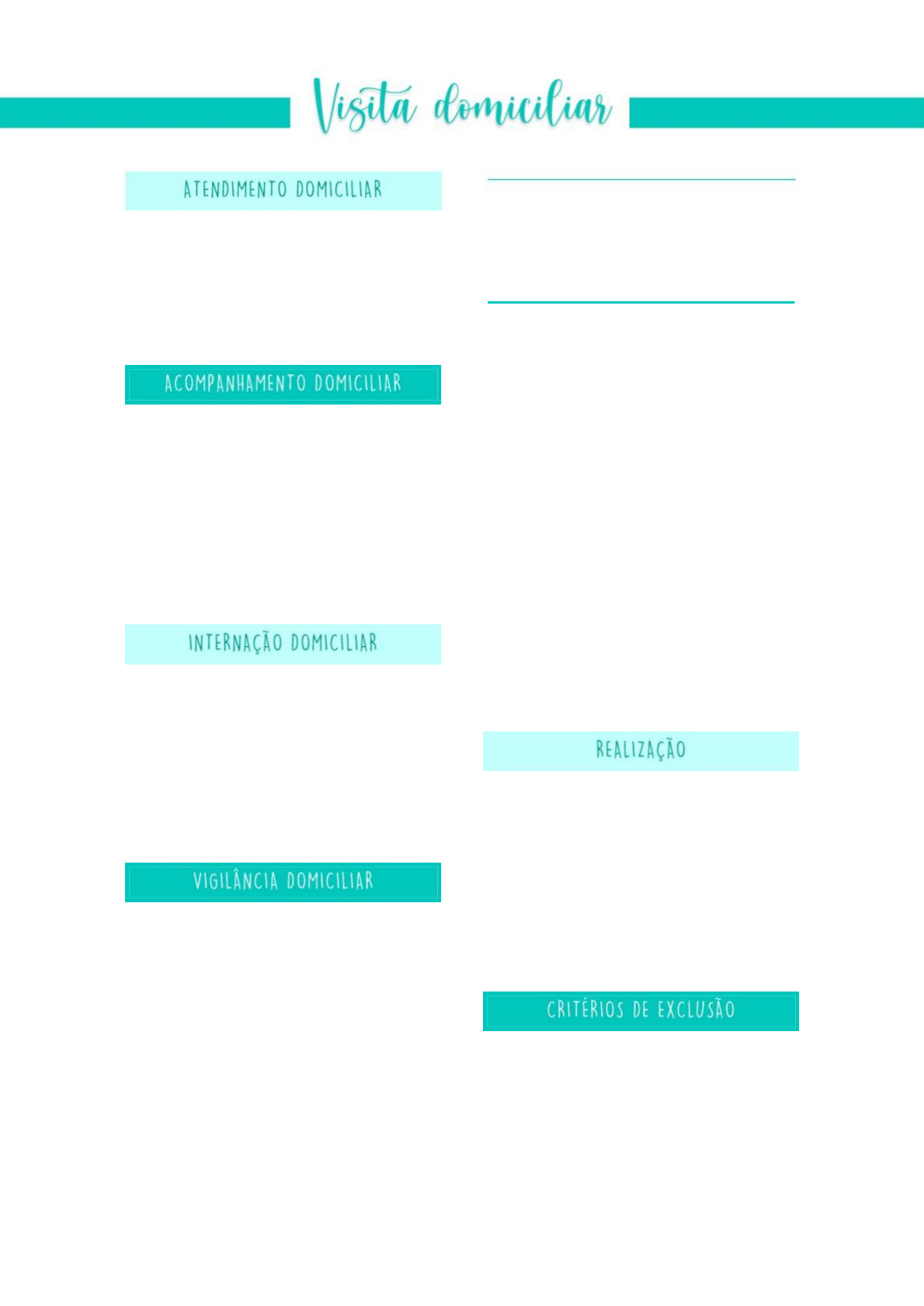 OBJETIVOS Geral: vigilância, assistência e ➢ É o cuidado prestado no domicílio para pessoas com problemas agudos e, que promoção domicílio da saúde no em função disso, estejam temporariamente impossibilitadas de comparecerem à Unidade Básica de Saúde (UBS) FORMAS DE VISITA • Visita fim: objetivos específicos de atuação • Visita meio: busca ativa, promoção saúde e prevenção de Pacientes que precisam de contato frequente e programável com profissionais da equipe de saúde. Ex: portadores de doenças crônicas com dependência física, pacientes em fase terminal, idosos com dificuldade de locomoção ou sozinhos, egressos do hospital em condições incapacitantes, portadores de doença mental Complexidade • • Não é específico A demanda pode ser gerada pelo sistema de saúde • • Cuidados assistenciais e sociais Articulação entre os níveis de atenção • • Integração com outros recursos da assistência Participação do cuidador Pacientes com problemas agudos ou egressos de hospitalização, que exijam uma atenção mais intensa, mas que possam ser mantidos em casa desde que disponham de equipamentos, • • ACS (Agentes Comunitários de Saúde) medicamentos diário pela equipe da UBS. A família assume uma parcela dos cuidados. e acompanhamento Profissional da equipe de saúde: médico, dentista, auxiliar ou técnico de cirurgião dentista, enfermeiro, auxiliar ou técnico de enfermagem, nutricionista, Comparecimento de um integrante da equipe até o domicílio para realizar ações de promoção, prevenção, educação e busca ativa da população de sua área de responsabilidade farmacêutico, psicológico, assistente social, outro • • Ações preventivas Busca ativa dos programas de prioridades • • Não aceitação da família Se a dificuldade de locomoção for sanada • • Abordagem diagnóstico e tratamento Acompanhamento de egressos hospitalares familiar para • • Mudança Óbito VISITA DOMICILIAR | @med_rabiscos Dificuldades Responde aos 4 princípios básicos da Atenção Primária e aos 3 princípios doutrinários do SUS. • • Perfil profissional adequado Não há remuneração diferenciada • Princípios da APS: acessibilidade, integralidade, longitudinalidade, coordenação • Difícil acesso aos domicílios e condições climáticas por vezes desfavoráveis • Princípios doutrinários do SUS: universalidade, equidade na assistência, integralidade da assistência • • Violência urbana Cultura hospitalocêntrica • • Objetivo claro da visita Fazer anamnese com o solicitante sobre o motivo da solicitação • • • Avaliar previamente o prontuário Levar material e medicações apropriados Levar formulários próprios para registro de atendimento Fazer análise crítica Avaliar grau de urgência Anotar endereço e pontos de referência • • • – A: autonomia B: base/risco social C: cuidador D: doença x restrição de locomoção E: especialidades, interconsultas VISITA DOMICILIAR | @med_rabiscos image1.png image2.png image3.png image4.png image5.png image6.png image7.png image8.png image9.png image10.png image11.png image12.png image13.png image14.png