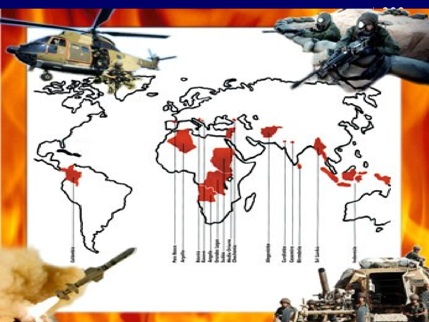 Divisão Política da África Característica gerais dos Conflitos na África Na África do Norte ou África Saariana além dos conflitos étnicos há a influência crescente do fundamentalismo islâmico e mais recentemente a chamada “primavera árabe”. Na África Central e Austral ou África Subsaariana os conflitos essencialmente étnicos e religiosos e têm relação com o processo de artificialização de fronteiras decorrente da descolonização de 1950 – 80. A fome e a diminuição progressiva das terras agricultáveis e dos recursos hídricos também são fatores de conflito pois põe grupos étnicos rivais na disputa por recursos naturais para sua sobrevivência. As origens dos conflitos na África Os conflitos na África eclodem no durante o imperialismo europeu. Embora não tenha deixado de ocupar o continente desde o escravismo, séculos antes, os europeus só adentraram definitivamente no continente após a descoberta de ouro e diamantes no fim do século 19. A conseqüência do neocolonialismo foi a Partilha da África, a divisão dos territórios africanos entre as principais potências européias durante a Conferência de Berlim. Nessa época e até o fim da segunda guerra mundial a África era composta apenas por dois países independentes: Libéria e Etiópia e por diversas etnias diferentes na língua, na religião e nos costumes. A confecção artificial de 53 países( hoje 54 com o Sudão do Sul) juntou diversos grupos etnoculturais, muitos deles rivais, que foram forçados a coexistir sobre a mesma fronteira. Tal fato acentuou os conflitos tribais no continente, situação que se perpetua até hoje. Com a Guerra Fria, emergiram nas políticas nacionais ditadores, patrocinados ou pelos EUA ou pela URSS, que pouco contribuíram para apaziguar as tensões na região. Ao invés disso mantiveram as fronteiras herdadas do período colonial. Tal iniciativa contribuiu para a eclosão de novos conflitos, guerras civis e movimentos separatistas que mataram milhões de pessoas, feriram outras tantas e formaram o maior número de refugiados do mundo. Ainda hoje, 15 países africanos estão mergulhados em guerras civis. Angola, banhada de petróleo e diamantes, acaba de finalizar uma guerra que durou 30 anos. O saldo foi de 1 milhão e meio de mortos, centenas de milhares de refugiados e uma terra regada com 14 milhões de minas terrestres, mais artefatos enterrados do que habitantes. Ao final da guerra, cerca de 3 milhões de pessoas correm o risco de morrer de fome. Na Ruanda, a disputa pelo poder político entre os grupos étnicos tutsis e hutus matou mais de 1 milhão de pessoas. O conflito, já encerrado, contabilizou ainda um número de 2 milhões de refugiados. A Nigéria, décimo produtor de petróleo do mundo, vive dias tensos por causa de seus 250 grupos étnicos e dos conflitos religiosos. Localização de Ruanda Mapa de Ruanda “Ruanda assim como o Burundi eram colônias da Alemanha até o começo do século XX. Depois da derrota da Alemanha na Primeira Guerra Mundial, o protetorado foi entregue à Bélgica, por mandato da Liga das Nações. O domínio belga foi muito mais direto e duro que o dos alemães e, utilizando a Igreja Católica, manipulou a classe alta dos tutsi para reprimir o resto da população - majoritariamente hutus e demais tutsis - incluindo a cobrança de impostos e o trabalho forçado, criando um fosso social maior do que o que já existia.Depois da IIGuerra Mundial, Ruanda tornou-se novamente um protetorado, pelas ONU, tendo a Bélgica como autoridade administrativa. Os primeiros confrontos entre hutus e tutsis aconteceram na década de 60. Mas foi em 1990 que a tensão atingiu seu ápice, quando os hutus voltam ao poder depois de décadas de domínio da minoria privilegiada Tutsi com o início de uma guerra civil que culminou em genocídio de um milhão de pessoas quatro anos mais tarde. O estopim que provocou o massacre foi em 6 de Abril de 1994, quando o presidente Huti de Ruanda Juvénal Habyarimana e Cyprien Ntaryamira, presidente do Burundi, foram assassinados quando o seu avião foi atingido por fogo quando ao aterrisar em Kigali. Durante os três meses seguintes, os militares e milícianos ligados ao antigo regime mataram cerca de 800.000 tutsis e hutus oposicionistas, naquilo que ficou conhecido como o Genocídio de Ruanda Os hutus — 90% da população —, promovra o quase extermínio da minoria tutsi — 9% dos habitantes —, que, contra todos os prognósticos, conquistou o poder. Mas os hutus moderados também foram cruelmente perseguidos porque não concordavam com seus líderes.Homens, mulheres e crianças foram exterminados a machadadas e esquartejados. Uma das cenas que mais horrorizaram o mundo foi a de centenas de corpos boiando pelo rio Kagera, localizado na fronteira entre Ruanda e Tanzânia. Os três meses de massacre provocaram o êxodo de 2,3 milhões de pessoas aos países vizinhos. Gorilas de Ruanda Refugiados em rotas de migração Campo de Refugiados em Ruanda Refugiados de Ruanda Massacre em Ruanda Massacre em Ruanda Resgate da ONU em Ruanda Timor Leste O Timor Leste é um dos países mais jovens e pobres do mundo. Foi ex-colônia portuguesa até 1975. A ascensão de um governo socialista no Timor Leste provocou a invasão do país pela Indonésia, governada pelo general Suharto, ditador de direita. Os timorenses iniciaram, então, uma guerrilha comandada por João Alexandre (Xanana) Gusmão, líder da Fretilin. Xanana Gusmão chegou a ser preso em 1992 e condenado à prisão perpétua. O governo Suharto iniciou uma forte e violenta repressão que resultou em mais de 200 mil timorenses mortos.Começava aí o conflito entre as milícias indonésias e o povo timorense que se arrastou até o ano 2000. Na época do conflito a população de 800 mil habitantes, 200 mil foram mortos. As forças de paz da ONU organizam um governo provisório liderado pelo brasileiro Sérgio Vieira de Melo até as eleições de 2003 