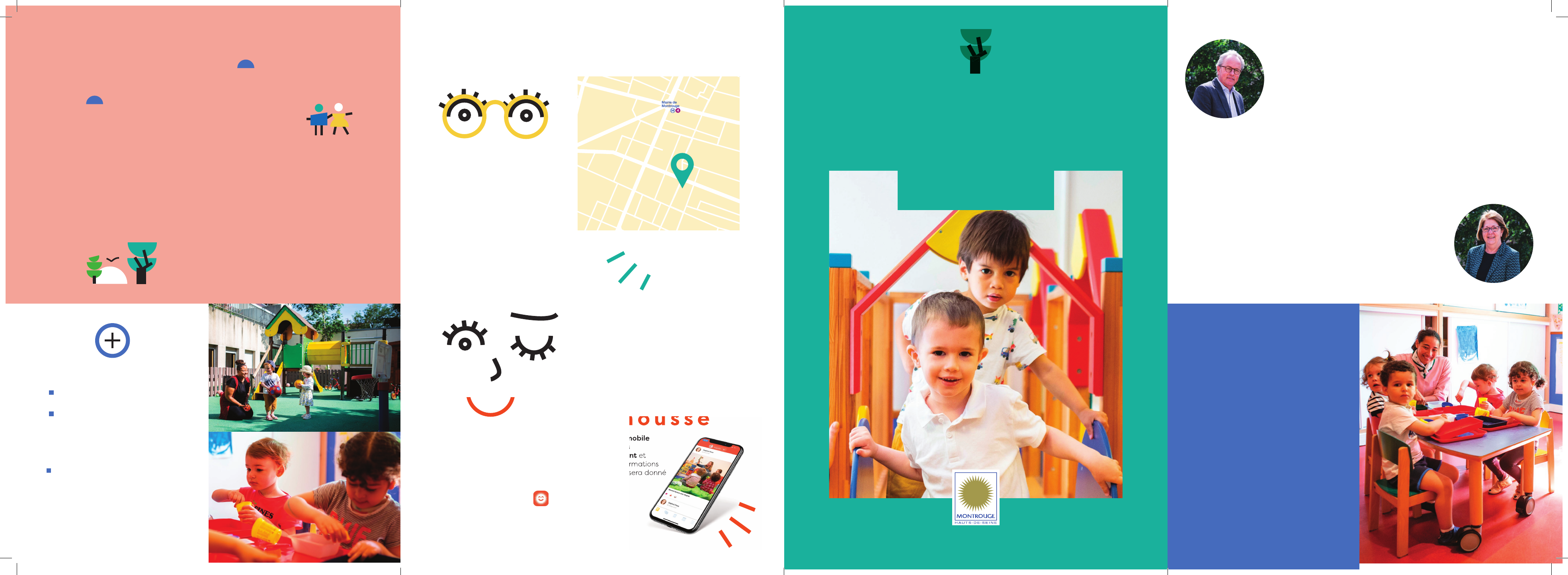 Boulevard Périphérique Boulevard Périphérique Boulevard Périphérique Rue Gabriel Péri Boulevard Gabriel Péri Av Pierre Bro sso lette Boulevard Gabriel Péri Av. Jean Jaurès Av. Je an Ja urès Av. Je an Ja urès Ru e M au ric e Ar no ux Rue Gabriel Péri Ru e M au ric e Ar no ux Av. Marx Dormoy Av. Marx Dormoy Av. Marx Dormoy Av. A ristide Briand Av. Aristide Briand Av. A ristide Briand Av. Verdier Av. Verdier Av. Léon Gambetta Av . d e la R ép ub liq ue Av . d e la R ép ub liq ue Av. de la paix Av . d e la M ar ne Rue Perier Rue Carvès Rue d’Estiennes d’Orves Rue Louis Rolland Av . H en ri Gi no ux Av . H en ri Gi no ux Ru e de la V an ne PLACE CRESP PLACE DE LA LIBÉRATION PLACE JEAN JAURÉS AQUAPOL Accueil des enfants de 7h30 à 9h30 Départ à partir de 16h30 (sauf circonstances exceptionnelles) C ô t é p r a t i q u e M is e e n m o ts / m is e e n im a g e s : w w w .re ve la tr ic e s- id e n ti te .c o m 105, avenue Henri Ginoux 92120 Montrouge 01 46 12 72 68 M is e e n m o ts / m is e e n im a g e s : w w w .re ve la tr ic e s- id e n ti te .c o m - © Is to ck - P h o to g ra p h e s : V irg in ie D e G a lz a in - A n to in e F a vi e r - J o h n ny Y im À quoi ressemble le jardin d'enfants de mon enfant ? Comment s’y organisent ses activités ? En quoi consiste la dynamique pédagogique ? Et la directrice, comment envisage-t-elle sa mission ? Ce livret vous donne un aperçu des aventures formidables que votre enfant va vivre ici ! 1 j a r d i n 3 8 e n f a n t s * âgés de 2 à 3 ans 1 0 p r o fe s s i o n n e l s d e l a P e t i t e E n f a n c e 3 2 0 m 2 de superfi cie en quelques chiff res 105, avenue Henri Ginoux H E N R I G I N O U X l e j a r d i n d ' e n f a n t s DÉCOUVREZ Le jardin d’enfants Henri Ginoux 2 a g e n t s t e c h n i q u e s 1 m é d e c i n 1 p syc h o l o g u e& régulièrement présents pour faire briller les locaux et régaler les enfants 1 h o m m e d e c o u r pour prendre soin des espaces extérieurs M a F r i m o u s s e Grâce à cette application mobile sécurisée, suivez en images les aventures de votre enfant et recevez de nombreuses informations utiles. Un code unique vous sera donné en début d'année. Histoire d'enrichir le lien entre vous, les professionnels et votre enfant, la Ville de Montrouge a créé M a F r i m o u s s e Grâce à cette application mobile sécurisée, suivez en images les aventures de votre enfant et recevez de nombreuses informations utiles. Un code unique vous sera donné « Convaincus du rôle essentiel et positif de la famille dans la ville, nous menons une politique ambitieuse pour les tout-petits et veillons à lui donner les moyens nécessaires pour réussir. Chacune des 15 structures de notre territoire est unique, mais toutes appliquent à leurs équipes et aux parents la même démarche bienveillante que celle vis-à-vis des enfants : donner à chacun sa place au sein du collectif. » Étienne Lengereau Maire de Montrouge « À Montrouge, nous savons combien les 1000 premiers jours de la vie d’un en- fant sont déterminants. C’est pourquoi, lorsque vous nous confi ez le vôtre, c’est pour nous à la fois une fi erté et une res- ponsabilité. Son bien-être et son éveil sont au centre de toutes nos attentions. Dans le cadre de mes délégations, je suis attentive aux avancées des neuro- sciences et aux initiatives pédagogiques innovantes concernant la Petite enfance. Nos directrices s’en imprègnent aussi. Et pour ouvrir à chaque tout-petit une belle route sur sa vie, nos équipes riva- lisent de professionnalisme et de créati- vité. Elles sont aussi un relais pour vous écouter et vous accompagner dans votre rôle de parent. » Claude Favra 1ère Maire-adjointe à la Famille, à la Parentalité, à la Petite Enfance et au Bien vieillir *C a p a ci té d ’a cc ue il p ré vu e p a r l ’a g ré m en t in cl ua nt + 1 0 % d e p la ce s su p p lé m en ta ire s co nf or m ém en t a ux d is p os it io ns ré g le m en ta ire s. Nos « petits » plus Un carré réservé au jardinage pour planter, voir pousser, goûter... Des espaces distincts pour pratiquer les diff érentes activités. Côté restauration Des menus adaptés à l’âge des enfants sont mis en oeuvre sur place. Ces repas élaborés par un prestataire sont choisis par la Mairie et sa diététicienne dans le cadre de la commission du Bien-manger. LES MOTS DE LA DIRECTRICE SYLVAINE VAUJOUR : « Au jardin d’enfants Ginoux, l’écoute et le respect mutuel orientent notre travail au quotidien. Les tout-petits, les famille et l’équipe : chacun en bénéficie, avec comme principal objectif le bien-être des enfants.. » Notre dynamique pédagogique NOUS PORTONS UNE GRANDE ATTENTION À LA VERBALISATION SOUS TOUTES SES FACETTES. QU’IL S’AGISSE DE LA MISE EN MOTS DES ACTIVITÉS CRÉATIVES ET MOTRICES, DES RÈGLES DE LA VIE COLLECTIVE OU ENCORE DES JEUX. POSER DES MOTS SUR CE QU’IL RESSENT EST ESSENTIEL, CAR À CET ÂGE TOUT EST ÉMOTION. Les moments festifs partagés Saisons et temps forts du calendrier donnent un sens aux activités : décorer le sapin, fabriquer les couronnes des reines et des rois, développer ses sens pendant la semaine du goût, etc. Ouverts sur l’extérieur, nous recevons régulièrement la visite de l’associa- tion « Lire et faire lire » et accueillons chaque année une compagnie de spectacle vivant. Et puis nous sortons en petits groupes à la piscine ou à la Médiathèque. Quant aux familles, elles sont invitées aux réjouissances de fin d’année et de juin et à partager leurs talents artistiques. Sans oublier les temps d’échanges avec professionnels lors du forum en début d’année et du petit-déjeuner des parents. CE QUI NOUS TIENT À COEUR L E S M O M E N T S D E C O N V I V I A L I T É E T D ’ É C H A N G E S E N T R E L E S F A M I L L E S E T L’ É Q U I P E " L E G I N O U X M A G " P O U R P A R T A G E R D E S I N F O R M A T I O N S D A N