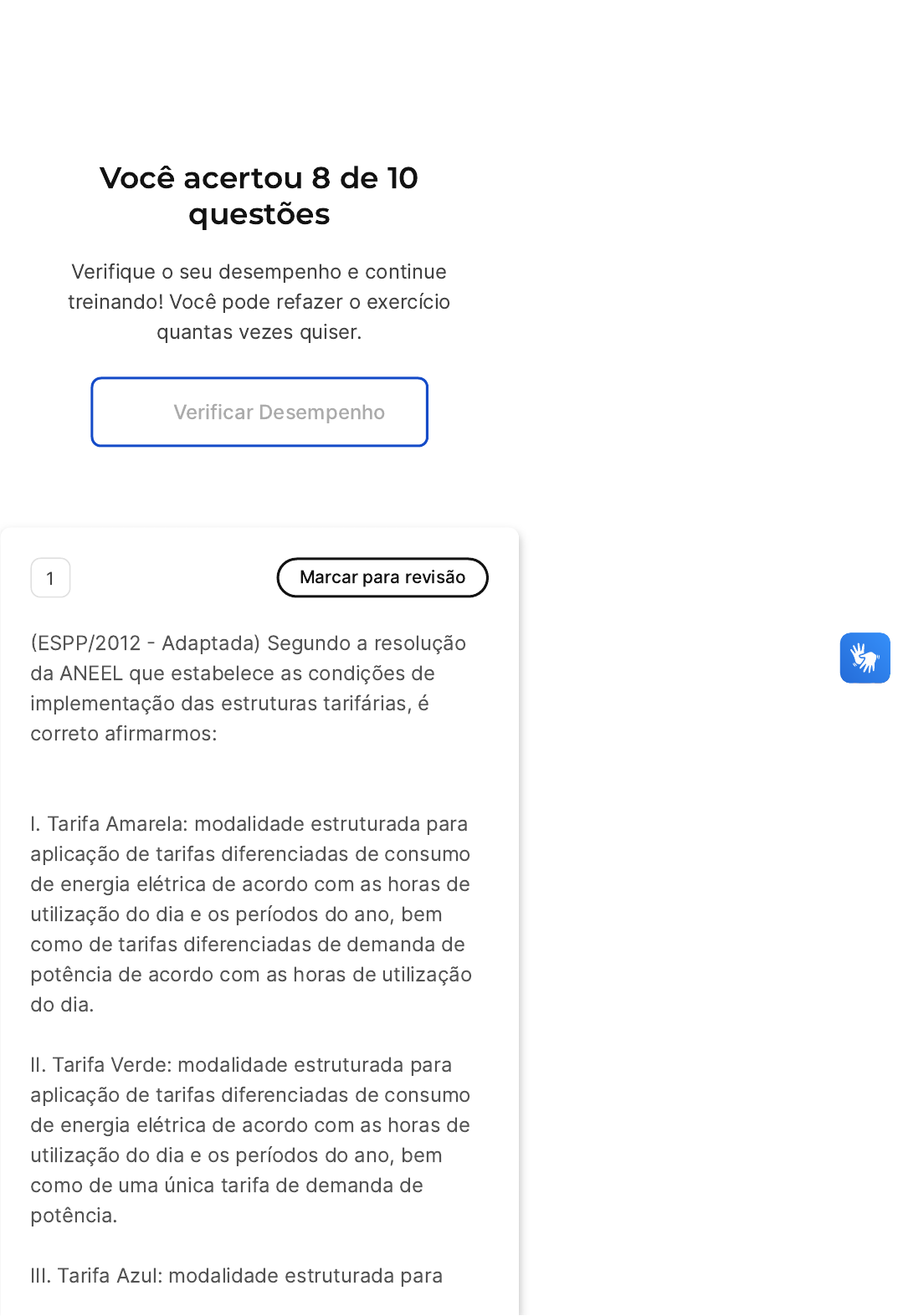 16/04/2024, 22:05 estacio.saladeavaliacoes.com.br/exercicio/660cb002139d33d914a89de5/gabarito/ https://estacio.saladeavaliacoes.com.br/exercicio/660cb002139d33d914a89de5/gabarito/ 1/17 Você acertou 8 de 10 questões Verifique o seu desempenho e continue treinando! Você pode refazer o exercício quantas vezes quiser. Verificar Desempenho 1 Marcar para revisão �ESPP/2012 � Adaptada) Segundo a resolução da ANEEL que estabelece as condições de implementação das estruturas tarifárias, é correto afirmarmos: I. Tarifa Amarela: modalidade estruturada para aplicação de tarifas diferenciadas de consumo de energia elétrica de acordo com as horas de utilização do dia e os períodos do ano, bem como de tarifas diferenciadas de demanda de potência de acordo com as horas de utilização do dia. II. Tarifa Verde: modalidade estruturada para aplicação de tarifas diferenciadas de consumo de energia elétrica de acordo com as horas de utilização do dia e os períodos do ano, bem como de uma única tarifa de demanda de potência. III. Tarifa Azul: modalidade estruturada para 16/04/2024, 22:05 estacio.saladeavaliacoes.com.br/exercicio/660cb002139d33d914a89de5/gabarito/ https://estacio.saladeavaliacoes.com.br/exercicio/660cb002139d33d914a89de5/gabarito/ 2/17 A B C D E composição de tarifas diferenciadas para indústrias que empregam fontes de energia renováveis. Das afirmações acima, I e II estão corretas. Das afirmações acima, apenas a I está correta. Das afirmações acima, I e III estão corretas. Das afirmações acima, apenas a III está correta. Das afirmações acima, apenas a II está correta. Resposta incorreta Opa! A alternativa correta é a letra E. Confira o gabarito comentado! Gabarito Comentado As tarifas azul e verde podem ser aplicadas aos consumidores do grupo A, não possuindo qualquer relação com a proveniência do recurso (renovável ou não). A tarifa amarela não existe. 2 Marcar para revisão �CESGRANRIO/2010 � Adaptada) A Câmara de Comercialização de Energia Elétrica �CCEE� 16/04/2024, 22:05 estacio.saladeavaliacoes.com.br/exercicio/660cb002139d33d914a89de5/gabarito/ https://estacio.saladeavaliacoes.com.br/exercicio/660cb002139d33d914a89de5/gabarito/ 3/17 A B C D E atua nas operações de compra e venda de energia, assumindo importante papel no Setor Elétrico. Dentre as atribuições dessa instituição, pode-se afirmar: I. Opera o sistema interligado e tem como responsabilidade despachar as unidades geradoras para que a potência comercializada chegue até os pontos de consumo. II. É função da CCEE promover registros de dados da geração e consumo dos agentes envolvidos na comercialização de energia. III. Garantir condições favoráveis para negociação da energia elétrica entre os agentes do sistema. I e II corretas. I e III corretas. II e III corretas. Somente III correta. Somente I correta. Resposta correta Parabéns, você selecionou a alternativa correta. Confira o gabarito comentado! Gabarito Comentado A Câmara de Comercialização de Energia Elétrica �CCEE� tem como uma de suas principais funções administrar o cenário de comercialização de energia, garantindo aos agentes condições favoráveis para a 16/04/2024, 22:05 estacio.saladeavaliacoes.com.br/exercicio/660cb002139d33d914a89de5/gabarito/ https://estacio.saladeavaliacoes.com.br/exercicio/660cb002139d33d914a89de5/gabarito/ 4/17 negociação, o que corresponde à afirmação III. Além disso, a CCEE é responsável por promover registros de dados da geração e consumo dos agentes envolvidos na comercialização de energia, conforme a afirmação II. No entanto, a afirmação I não é correta, pois as funções de coordenação e operação do sistema interligado são delegadas ao Operador Nacional do Sistema Elétrico �ONS�, e não à CCEE. Portanto, as afirmações II e III estão corretas, o que corresponde à alternativa C. 3 Marcar para revisão �IF�TO/2016� De acordo com a Resolução Normativa da ANEEL, a modalidade tarifária é o conjunto de tarifas aplicáveis às componentes de consumo de energia elétrica e demanda de potência ativas. Diante disto, analise as afirmações abaixo: I � A modalidade tarifária horária branca é aplicada às unidades consumidoras do grupo B, exceto para o subgrupo B4 e para as subclasses Baixa Renda do subgrupo B1, caracterizada por tarifas diferenciadas de consumo de energia elétrica, de acordo com as horas de utilização do dia. II � A modalidade tarifária horária verde é aplicada às unidades consumidoras do grupo A, caracterizada por tarifas diferenciadas de demanda de potência, de acordo com as horas de utilização do dia, assim como de uma única tarifa de consumo de energia elétrica. III � A modalidade tarifária convencional binômia é aplicada às unidades consumidoras do grupo A, caracterizada por tarifas de consumo de energia elétrica e demanda de potência, 16/04/2024, 22:05 estacio.saladeavaliacoes.com.br/exercicio/660cb002139d33d914a89de5/gabarito/ https://estacio.saladeavaliacoes.com.br/exercicio/660cb002139d33d914a89de5/gabarito/ 5/17 A B C D E independentemente das horas de utilização do dia. IV � A modalidade tarifária convencional monômia é aplicada às unidades consumidoras do grupo B, caracterizada por tarifas de consumo de energia elétrica, independentemente das horas de utilização do dia. V � A modalidade tarifária horária azul é aplicada às unidades consumidoras do grupo A, caracterizada por tarifas diferenciadas de consumo de energia elétrica e de demanda de potência, de acordo com as horas de utilização do dia. Agora, após a análise, assinale a opção que apresenta todas as alternativas corretas: I, III, IV e V, apenas. I, III e V, apenas. II, III e V, apenas. II, III, IV e V, apenas. I, II e V, apenas. Resposta correta Parabéns, você selecionou a alternativa correta. Confira o gabarito comentado! Gabarito Comentado A alternativa corret