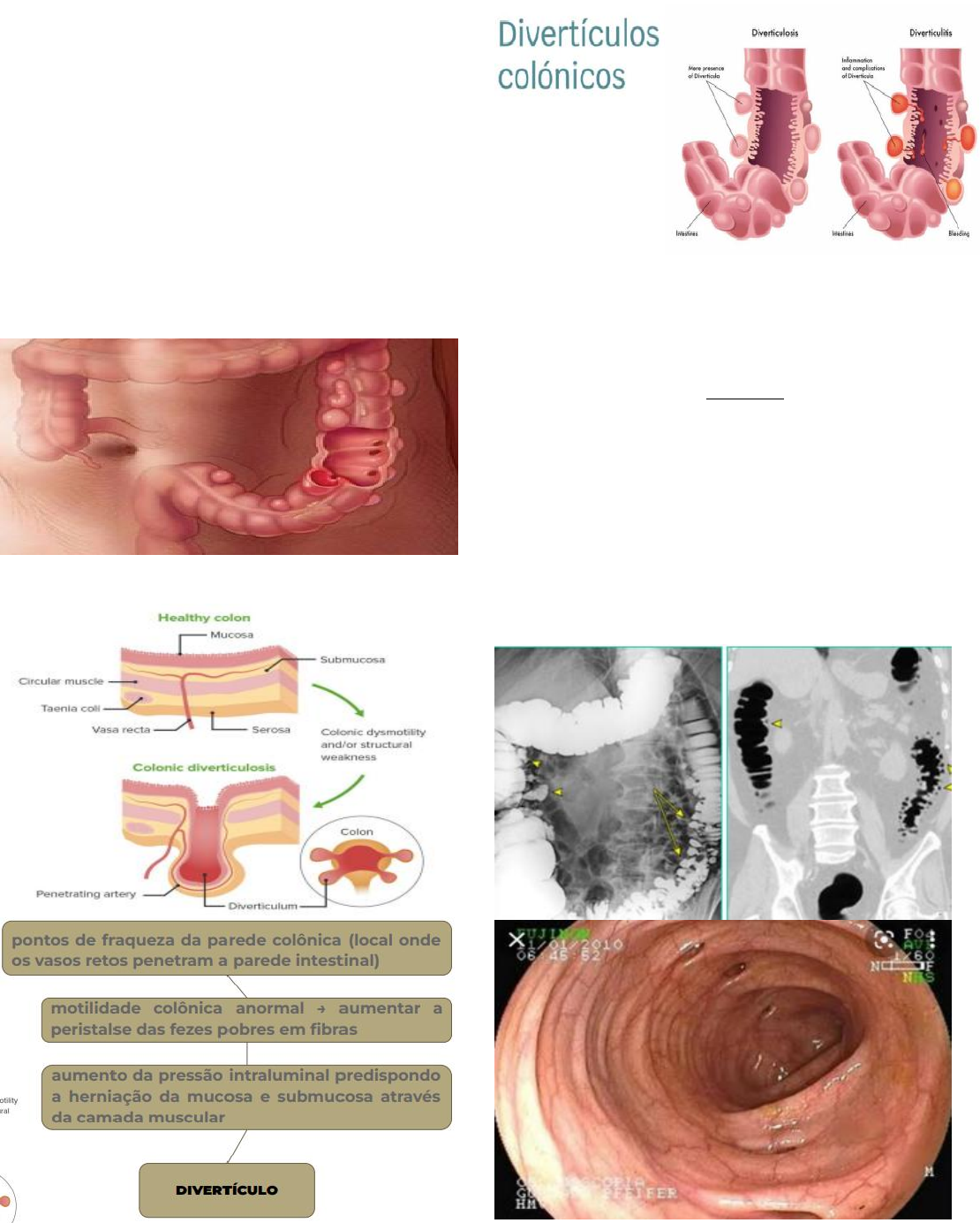 DOENÇA DIVERTICULAR DOS CÓLONS DEFINIÇÃO: Protusões saculares -> camadas mucosa e muscular da mucosa (divertículo falso ou pseudodivertículos). São mais comuns no cólon sigmóide, mas podem ser encontrados em todo o cólon. Diverticulose: presença de divertículos sintomático ou assintomático. Doença diverticular: sinais e sintomas e se divide em não complicada e complicada. Complicada: infecção, perfuração, fístula, obstrução e sangramento. Não complicada: dor abdominal persistente na ausência de colite ou diverticulite macroscopicamente evidente. Diverticulite aguda: perfuração microscópica ou macroscópica dos divertículos devido a inflamação diverticular e necrose fecal. FISIOPATOLOGIA Com o envelhecimento, há menor produção e deposição de colágeno na parede colônica, levando ao seu enfraquecimento e consequente protusão de suas camadas. FATORES DE RISCO O principal fator de risco é a idade! Prevalência de 60% em maiores de 60 anos e <5% em menores de 30 anos. Dietas pobres em fibras e ricas em carboidratos. Predominantemente ocidental. Não há preferência de sexo, acometendo igualmente homens e mulheres. DIAGNÓSTICO De doença diverticular dos cólons, não diverticulite. Os exames de imagem são: Colonoscopia. Enema opaco. TC de abdome total. TRATAMENTO Não necessitam de tratamento e seguimento regular. Objetivo: diminuir os sintomas e prevenir complicações. Dieta rica em fibras não absorvíveis, antiespasmódicos para controle de dor e probióticos. Consumo de fibras alimentares não absorvíveis - reter água leva a formação de fezes mais volumosas com maior poder de retenção hídrica, melhorando a velocidade do trânsito intestinal e reduzindo a formação de áreas de alta pressão intraluminal. DIVERTICULITE EPIDEMIOLOGIA Qualquer parte do cólon, sendo mais frequente no sigmóide. Aproximadamente 4% dos pacientes com diverticulose desenvolvem diverticulite. Principal complicação é o abscesso. ETIOLOGIA QUADRO CLÍNICO Variável e depende da gravidade do processo inflamatório subjacente. Dor abdominal em fossa ilíaca esquerda (queixa mais comum), náuseas e vômitos, febre, urgência urinária e disúria devido a irritação da bexiga pela inflamação no cólon sigmóide. Casos graves: hipotensão e choque/sepse -> perfuração e peritonite. DIAGNÓSTICO Diagnóstico de diverticulite aguda é clinico através da história e exames físico. Exames laboratoriais -> aumento de provas inflamatórias (PCR), leucocitose e piúria estéril. Exame de imagem é importante na diferenciação da forma simples da complicada. Escolha: TC de abdome total com contraste endovenoso. Espessamento da parede intestinal, aumento na densidade da gordura pericolônica e presença de divertículos. Complicações: abscessos, obstrução intestinal e fístula. USG de abdome total: operador dependente e não pode excluir outras causas de dor abdominal, então na prática, é pouco utilizado na suspeita de diverticulite aguda. RNM abdome total: vantagem de evitar a exposição à radiação e é capaz de excluir outras causas de dor abdominal, no entanto, é um exame menor disponível, mais demorado e de maior custo. Colonoscopia não tem papel no diagnóstico da diverticulite aguda! Tanto a colonoscopia quanto o enema opaco não devem ser realizados pelo risco de perfuração ou exacerbação da inflamação existente. Quando fazer a colonoscopia? Após 6 a 8 semanas da resolução completa dos sintomas - > exclusão de malignidade subjacente. TRATAMENTO Antibioticoterapia EV, hidratação endovenosa e analgesia. ATB -> gram-negativos e anaeróbios. EV até que a inflamação seja estabilizada (resolução da dor e da sensibilidade abdominal) -> 3 - 5dias. VO (clavulin ou ciprofloxacino + metronidazol) para completar o curso de 10 - 14 dias. Após 2 - 3 dias de tratamento, sem melhora ou deterioração clínica -> novo exame de imagem para procurar novas complicações que possam exigir intervenção adicional. Precisa de TC para controle de cura? Não. HINCHEY I - tratamento conservador (ATB) + vigilância rigorosa (pode evoluir para estágio II ou III). HINCHEY II - tamanho do abscesso determina a abordagem inicial. Abscessos < 4cm: tratamento clínico (ATB). Sem melhora ou piora após 3 dias de tratamento -> drenagem percutânea ou até mesmo cirurgia. Abscessos > 4cm: drenagem percutânea guiada por exame de imagem. É esperada melhora clínica em 24 - 48 horas. Caso o paciente não apresente melhora - > avaliar cirurgia. HINCHEY III E IV - extremamente graves, altos índices de morbimortalidade -> cirurgia de urgência. Retossigmoidectomia a Hartamann, com ressecção intestinal com colostomia terminal e sepultamento do coto retal. Ambulatorial -> analgesia, antibioticoterapia oral de amplo espectro (cobertura para gram negativos e anaeróbios) por 7 - 10 dias e dieta líquida/leve. Reavaliados 2 - 3 dias até completa resolução dos sintomas. Estudos de imagem repetidos não são indicados a menos que o paciente não melhore com tratamento clínico. Colonoscopia em 6 a 8 semanas, para exclusão de malignidade. COMPLICAÇÕES TARDIAS Tardias: Estenose. Fístula colovesical -> pneumatúria, fecalúria e disúria. OBS: QUEM TEM DDC NÃO PODE COMER SEMENTES? É MENTIRA. QUESTÃO 1 (FMABC - 2021) - Homem, 66 anos de idade, procurou atendimento por queixa de dor abdominal há 5 dias, em flanco esquerdo e fossa ilÍaca esquerda, associada a náuseas e febre. Nega sintomas urinários. Sem outras queixas ou antecedentes pessoais prévios. Ao exame clínico, regular estado geral, desidratado 2+/4+. Frequência cardíaca = 115bpm. PA 90x60mmHg. Dor a palpação difusa do abdome, com descompressão brusca positiva. Realizou TC que evidenciou múltiplos divertículos no cólon sigmoide, com sinais de processo inflamatório local, assim como grande quantidade de líquido livre na cavidade. Em relação ao caso, assinale a correta. a. Trata-se de um caso 