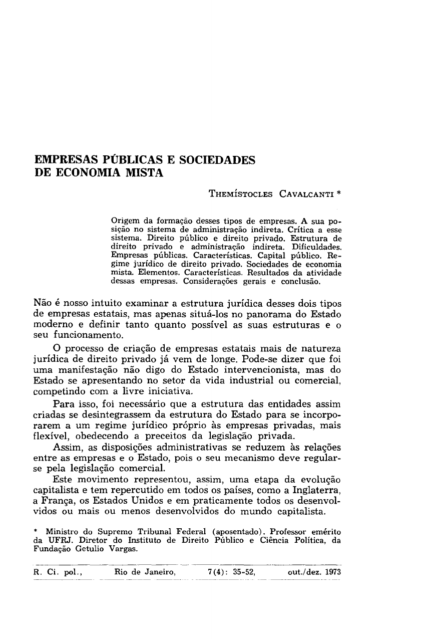 EMPRESAS PÚBLICAS E SOCIEDADES DE ECONOMIA MISTA THEMÍSTOCLES CAVALCANTI * Origem da formação desses tipos de empresas. A sua po sição no sistema de administração indireta. Crítica a esse sistema. Direito público e direito privado. Estrutura de direito privado e administração indireta. Dificuldades. Empresas públicas. Características. Capital público. Re gime jurídico de direito privado. Sociedades de economia mista. Elementos. Características. Resultados da atividade dessas empresas. Considerações gerais e conclusão. Não é nosso intuito examinar a estrutura jurídica desses dois tipos de empresas estatais, mas apenas situá-los no panorama do Estado moderno e definir tanto quanto possível as suas estruturas e o seu funcionamento. O processo de criação de empresas estatais mais de natureza jurídica de direito privado já vem de longe. Pode-se dizer que foi uma manifestação não digo do Estado intervencionista, mas do Estado se apresentando no setor da vida industrial ou comercial, competindo com a livre iniciativa. Para isso, foi necessário que a estrutura das entidades assim criadas se desintegrassem da estrutura do Estado para se incorpo rarem a um regime jurídico próprio às empresas privadas, mais flexível, obedecendo a preceitos da legislação privada. Assim, as disposições administrativas se reduzem às relações entre as empresas e o Estado, pois o seu mecanismo deve regular se pela legislação comercial. Este movimento representou, assim, uma etapa da evolução capitalista e tem repercutido em todos os países, como a Inglaterra, a França, os Estados Unidos e em praticamente todos os desenvol vidos ou mais ou menos desenvolvidos do mundo capitalista. * Ministro do Supremo Tribunal Federal (aposentado). Professor emérito da UFRJ. Diretor do Instituto de Direito Público e Ciência Política, da Fundação Getulio Vargas. R. Ci. pol., Rio de Janeiro, 7 (4): 35-52, out./ dez. 1973 Assim, não somente os setores de base, como a eletricidade, os transportes, as comunicações têm merecido esse tratamento. Entre nós, os setores siderúrgicos, do petróleo, do abastecimento, da navegação e tantos outros encontraram nesse tipo de empresa a sua solução. Foi elaborada uma rica doutrina em torno do pro blema. Tudo isso se deve à transformação da economia moderna é à necessidade, como já disse, de descentralizar os serviços, não so mente dentro da administração, mas também através uma inte gração maior com o sistema de economia própria. O problema apresenta-se de uma forma semelhante nos Esta dos capitalistas. O Estado precisa por vezes assumir encargos vizinhos à atividade das empresas privadas, adotando por vezes a sua estrutura e o seu regime jurídico, sem lhes perder o contato. A necessidade do Estado assumiu, por vezes, encargos indus triais ou comerciais, organizando empresas. Para atender melhor a essas finalidades, pela sua estrutura, pelo seu regime jurídico, criou esse problema que tomou em cada país formas e modalida des diferentes. Em alguns países foram criadas empresas estatais de partici pação exclusiva do Estado, organizações de uma única pessoa - o Estado - enquanto que em outros, ao lado dessas entidades públicas sob a forma de empresa, foram também criadas socieda des chamadas "mistas" de diversos sócios, com a participação do Estado e dos particulares. Razões de ordem econômica motivaram essa participação, como a escassez de recursos públicos, o objetivo de atrair pou panças privadas, a conveniência de interessar o público em inves timentos do Estado. 1 Na França, por exemplo, ao lado dos établissements publics de caractere industriel et commercial, que são empresas do Estado, existem sociedades de economia mista.:? O mesmo ocorre na Itália onde, ao lado de "organizazione economici publici", encontram-se as societá per azioni. 3 Já nos Estados Unidos e na Inglaterra prevalece o tipo de Public Cooperation ou Business Cooperation que são empresas do Estado. São entidades do Estado mas que se regem por prin cípios de direitos privados. A administração obedece às normas adotadas pela gerência privada e o regime jurídico do seu pessoal segue o mesmo sistema. 4 1 Ver Hanson. Public entreprise and economic development ::: Delion, A. L'Etat eles enterprises publiques. :l Albergo, Salvatore. Le partecipazione statali. I Friedman. Public corporations. 36 R.C.P. 4'73 A empresa é operada, entretanto, pelo próprio governo. Na opinião do Prof. Dimmock, as razões que levaram a criação dessas entidades foram as seguintes: a) foram criadas para tempo de guerra, quando o interesse pri vado deve subordinar-se às necessidades de planejamento, opera ção e controle centrais; b) para fins de emergência, em período de depressão; c) a longo prazo, para objetivos ligados a interesse nacional, co mo quando certo governo conservador da Grã-Bretanha estabele ceu em 1926 uma rede de eletricidade de âmbito nacional porque energia barata significa conquistas de mercados; d) por temor de certos monopólios privados; e) considerações de lucro - ou se estatiza a empresa quando deixa de dar lucro, ou o governo a encampa quando o lucro é tão grande que irrita o consumidor; f) porque o vulto do serviço não permitiria a sua exploração por capital privado ou o risco que representava o investimento, apresentando a iniciativa privada.;; Essas public corporations são autônomas, os seus funcionários não são funcionários públicos, escapam em sua maioria ao contro le dos órgãos do Estado. A tendência no direito estrangeiro é considerar essas empre sas como públicas, embora obedeçam a um regime administrativo e comercial mais próximo das empresas privadas. Nos países anglo-saxões, a diferença entre o público e o pri vado não é nítida. Pode-se dizer que ali só existe o direito privado que regula todos os tipos de relações jurídicas. Na Itália, o caráter econômico desses emp