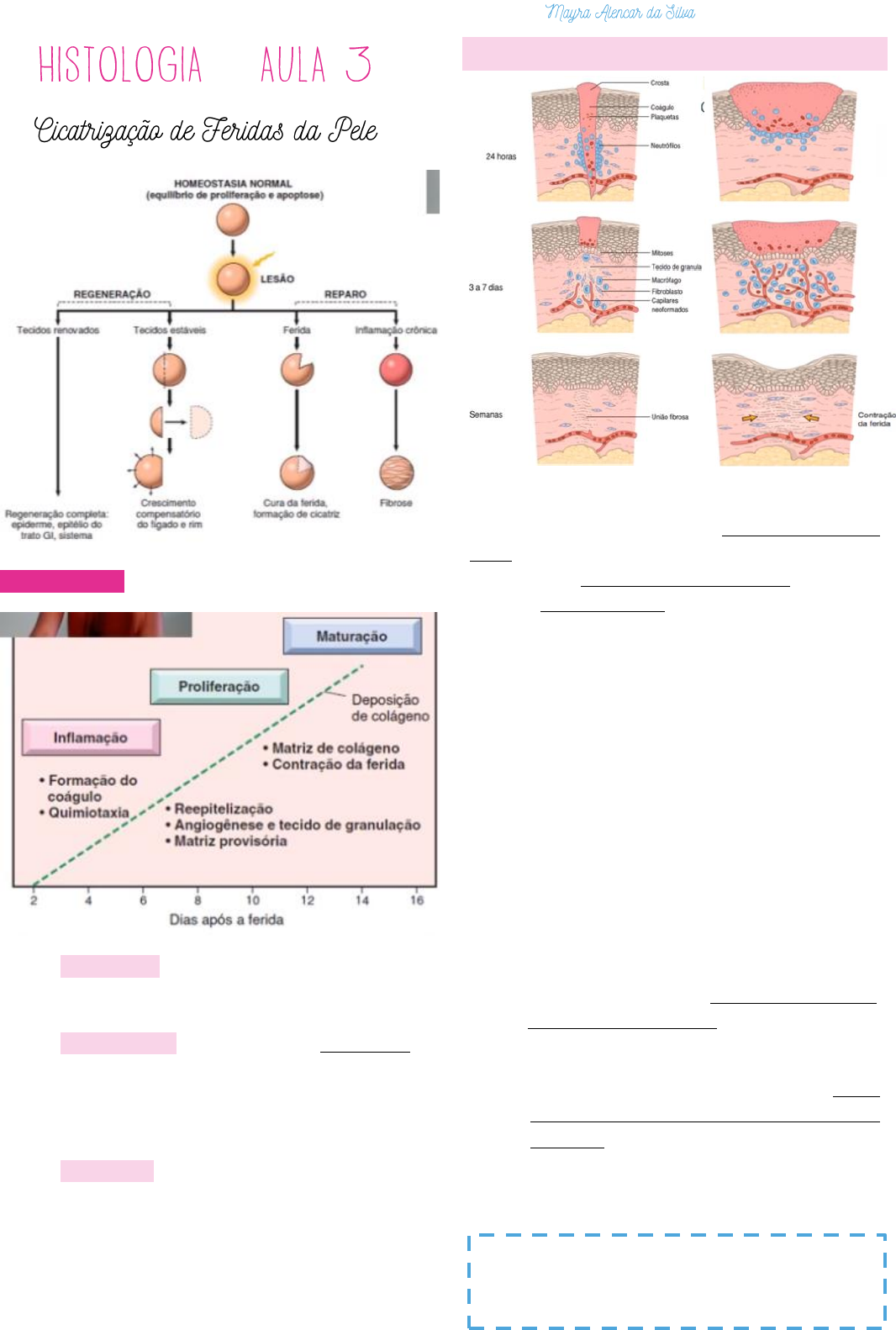 P2/UC6 – MEDICINA UNIT AL – CICATRIZAÇÃO: deposição de tecido conjuntivo. • INFLAMAÇÃO : formação do coágulo, quimiotaxia, faz a limpeza da região para preparar para o reparo tecidual. • PROLIFERAÇÃO : há muita angiogênese (convocação de células que irão formar novos vasos) para a promoção do metabolismo para que as células se multipliquem e consigam depositar colágeno. • MATURAÇÃO : o colágeno não tão resistente será substituído por um colágeno mais resistente (chamado também de remodelação). FASES DO PROCESSO DE CICATRIZAÇÃO DE FERIDAS 1ª INTENÇÃO: cicatrização pela união das bordas da ferida, como por exemplo por uma sutura. Por causa da união, há uma otimização da reepitelização, então essa ferida irá cicatrizar melhor. ✓ 24 horas: coágulo aparente com o objetivo de conter a hemorragia. Há um processo inflamatório que irá fazer a limpeza da região e eventualmente. ✓ 3 a 7 dias: os neutrófilos serão substituídos pelos macrófagos que irão convocar os fibroblastos (células que depositam colágeno). ✓ Semanas: há a deposição de colágeno para ter a reparação da região. Ao mesmo tempo, acontece a reepitelização, que é a regeneração do epitélio que irá se proliferar até fechar a ferida. 2ª INTENÇÃO: quando há uma borda na qual não se pode fazer a união por sutura (como nas úlceras). Por isso, há maior deposição de colágeno e a reepitelização é menor, então a cicatrização é mais visível. ✓ Acontece os mesmos eventos, mas como a área é muito grande acaba tendo menos reepitelização e mais deposição do tecido conjuntivo. ✓ Já que o epitélio é meio “transparente”, então o tecido conjuntivo fica bem marcado, pois isso é possível ver a cicatriz. Quanto mais juntas as bordas da ferida estiverem, melhor a cicatrização. Quanto maior a área, menos reepitelização e mais deposição de tecido conjuntivo. P2/UC6 – MEDICINA UNIT AL COÁGULO - objetivo de conter a hemorragia. PROCESSO/INFILTRADO INFLAMATÓRIO AGUDO – neutrófilos da resposta inflamatória aguda serão substituídos pelos macrófagos, os quais convocam os fibroblastos (células que depositam colágeno). ANGIOGÊNESE - É o processo de desenvolvimento de novos vasos a partir de vasos preexistentes, primariamente vênulas. É essencial para a cura nos locais de lesão, para o desenvolvimento de circulações colaterais em locais de isquemia e para permitir o aumento de tumores e sua disseminação. Consiste nas seguintes etapas: • Vasodilatação em resposta ao NO e aumento da permeabilidade induzida pelo VEGF (fator de crescimento endotelial); • Separação dos pericítos da superfície abluminal; • Migração de células endoteliais em direção à área da lesão; • Proliferação de células endoteliais logo atrás da frente principal de células migratórias; • Remodelação em tubos capilares; • Recrutamento de células periendoteliais (pericitos em pequenos capilares e células musculares lisas para vasos maiores) para formar o vaso maduro; • Supressão da proliferação e migração endotelial e deposição de membrana basal. FIBROPLASIA – Essas células da camada de fibroplasia irão se proliferar e para isso é preciso energia porque também precisam depositar colágeno. P2/UC6 – MEDICINA UNIT AL CICATRIZAÇÃO DA ÚLCERA PÉPTICA A cicatrização da úlcera péptica é diferente porque o ambiente é hostil (ácido), propiciando o surgimento da úlcera várias vezes. No corpo do estômago, a úlcera tem aspecto mais estrelado. FATORES DE CRESCIMENTO