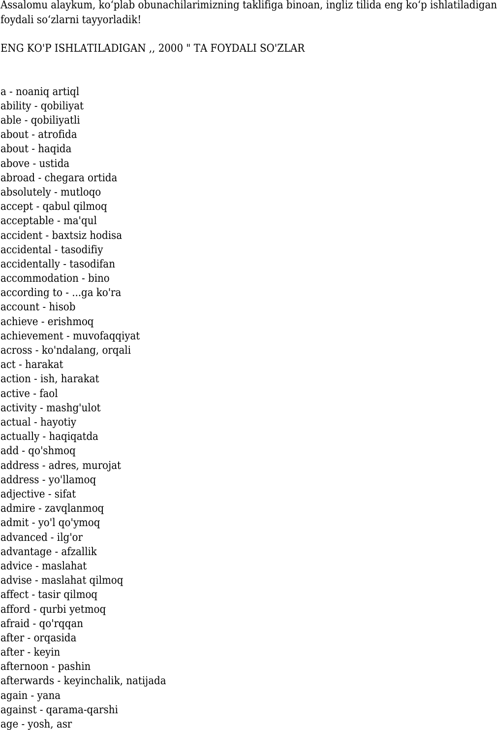 Assalomu alaykum, koʻplab obunachilarimizning taklifiga binoan, ingliz tilida eng koʻp ishlatiladigan foydali soʻzlarni tayyorladik! ENG KO'P ISHLATILADIGAN ,, 2000 " TA FOYDALI SO'ZLAR a - noaniq artiql ability - qobiliyat able - qobiliyatli about - atrofida about - haqida above - ustida abroad - chegara ortida absolutely - mutloqo accept - qabul qilmoq acceptable - ma'qul accident - baxtsiz hodisa accidental - tasodifiy accidentally - tasodifan accommodation - bino according to - ...ga ko'ra account - hisob achieve - erishmoq achievement - muvofaqqiyat across - ko'ndalang, orqali act - harakat action - ish, harakat active - faol activity - mashg'ulot actual - hayotiy actually - haqiqatda add - qo'shmoq address - adres, murojat address - yo'llamoq adjective - sifat admire - zavqlanmoq admit - yo'l qo'ymoq advanced - ilg'or advantage - afzallik advice - maslahat advise - maslahat qilmoq affect - tasir qilmoq afford - qurbi yetmoq afraid - qo'rqqan after - orqasida after - keyin afternoon - pashin afterwards - keyinchalik, natijada again - yana against - qarama-qarshi age - yosh, asr ago - avval agree - rozi bo'lmoq agreement - rozilik ahead - oldinga, da aim - maqsad aim - harakat qilmoq Bizning Rasmiy kanalimizga qoʻshiling! @IELTS_ingiliz_tili air - havo alive - jonli all - hamma allow - ruxsat bermoq almost - deyarli alone - yolg'iz along - bo'ylab along - shu yo'nalishda already - allaqachon also - ...ham although - ammo always - doimo among - orasida amount - miqdor and - va angry - badjahl announce - ma'lum qilmoq another - boshqa answer - javob answer - javob bermoq anxious - havotirlangan any - har, har bir any - bir oz anybody - kimdir, hechkim anyone - kimdir, hechkim anything - nimadir, hechnima anyway = anyhow - qanday bo'lmasin anywhere - qayerdadir apart - chetda, bo'lak apologize = apologise - kechirim so'ramoq apparently - ko'rinib turibdi appeal - murojat appear - paydo bo'lmoq appearance - tashqi ko'rinish apply - iltimos bn murojat qilmoq approval - maqullash, tasdiqlash approve - maqullamoq, tasdiqlamoq area - maydon argue - baxslashmoq argument - sabab, argument arm - qo'l (yelkadan panjagacha) around - atrofda arrange - tartibga keltirmoq arrangement - bino arrival - kelish (at, in; from) arrive - kelmoq art san'at artificial - suniy as - xuddi ashamed - uyatchan ask - so'ramoq at - da attach - mahkamlamoq attempt - urinish attempt - urinmoq attention - diqqat attitude - munosabat attract - jalb qilmoq attractive - jozibador authority - boshqaruv, obro autumn - kuz available - yaroqli average - o'rtacha avoid - o'zini chetga olmoq awake - uyg'oq aware - xabardor away - chetda back - orqa back - orqaga back - qo'llamoq backwards - orqaga bad - yomon badly - yomon bag - sumka balance - muvozanat ball - kaptok band - arkestr, lenta bang - zarba bang - zarba bermoq bank - bank, soxil bar - bar base - asos base - asoslamoq basic - asos basically - asosli basis - asos bath - vanna battery akumulator be - bo'lmoq bear - chidamoq beat - urmoq beautiful - chiroyli because - chunki become - bo'lmoq before - avval before - oldida before - ...dan avval begin - boshla moq beginning - boshi behave - uzini tutmoq behaviour - hulq behind - orqadan behind - orqa... belief - ishonch believe - ishonmoq belong - mos kelmoq below - ostida bend - bukmoq, bukilmoq beneath - ostida benefit - foyda beside - yonida best - eng yaxshisi bet - juft bet - juft tutmoq better - yaxshi between - orasida beyond - ortida big - katta bill - hisob bin - yashik birth - tug'lish birthday - tug'ilgan kun bit - bo'lakcha bite - tishlash bite - tishlamoq black - qora black - qora rang blame - ayb, tan'a blame - ayblamoq blind - ko'zi ojiz block - blok block - bloklamoq blow - esmoq, puflamoq blue - moviy board taxta, doska boat - qayiq body - tana boil - qayna (t)moq book - kitob book - kitobga kiritmoq border - chegara bored - zerikkan boring - zerikarli born - tug'ilgan borrow - qarz olmoq both - ikkalasi bother - havotirlamoq bottom - tub bottom - ostki bound - boylangan brain - miya branch - shoxa brave - jasur bread - non break - sindirmoq break down - bo'laklarga bo'lmoq break in - sindirib kirmoq breakfast - ertalabki nonushta breath - nafash olish breathe - nafash olmoq bridge - ko'prik brief - kalta bright - yorqin bring - olib kelmoq bring back - qaytarib olib kelmoq bring down - tushirmoq (bahoni) bring forward - olib chiqmoq(taklif) bring up - olib chiqmoq broad - keng broken - siniq, buzuq brother - aka brown - qorichnoviy brush - shetka brush - shetka bilan tozalamoq, taramoq build - qurmoq building - imorat bunch - bog' burn - yonmoq burst - portlamoq bury - dafn etmoq bus - avtobus bush - buta business - ish busy - band but - lekin butter - yog' buy - sotib olmoq by - yonida by - yaqin bye - "kurishguncha" call - telefon qo'ng'irog'i call - chaqirmoq call at - to'xtamoq (qayerdadir), kirmoq call back - qayta qo'ng'iroq qilmoq call off - bekor qilmoq, kechiktirmoq call out - chaqirmoq call up - chaqirmoq (telefonga) calm - jim calmly - sokin can - qila olmoq cap - shapka capital - poytaxt car - avtomobil card - kartochka care - g'amhorlik care - g'amhorlik qilmoq (for, of, about) careful - etiborli careless - befarq carry - tashimoq case - jild catch - ushlamoq cause - sabab cause - sabab bo'lmoq centimetre - santimetor central - markaziy centre - markaz century - asr certain - mutloq certainly - albatta challenge - (qiyin) muammo chance - imkoniyat change - o'zgarish change - o'zgarmoq character - xarakter characteristic - xislat charge - baxo charge - baxolamoq chase - ta'qib qilmoq chat - suhbatlashmoq cheap - arzon cheat - aldamoq check - tekshiruv check - tekshirmoq cheek - yanoq cheque - chek chief - asosiy child - bola children - bolalar chin - iyak choice - saylash choose - saylamoq church - cherkov cinema - kinoteatr circle - aylana circumstance - ahvol city - shaxar claim - talab claim - talab qilmoq class - sinf, guruh classroom - sinfxona clean - toza clean - tozalamoq clear -