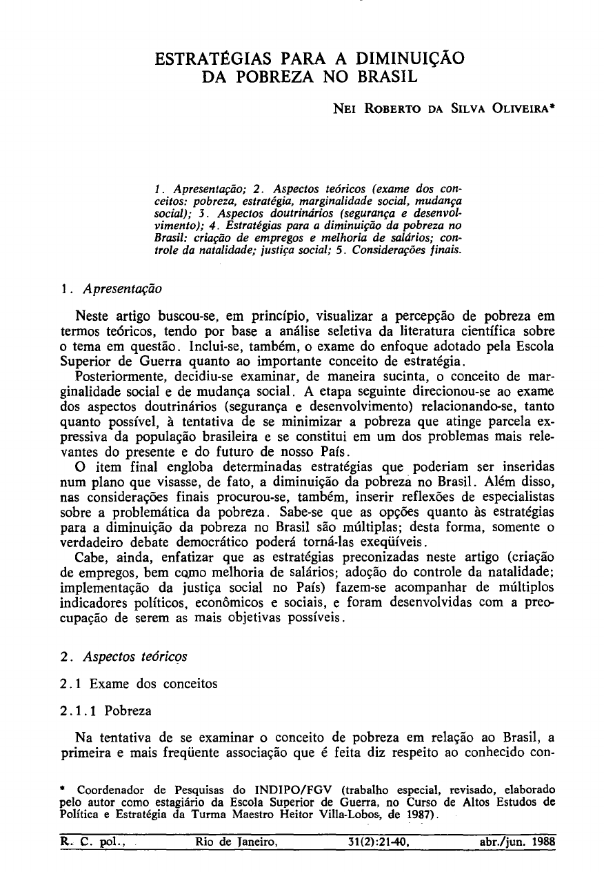ESTRAT~GIAS PARA A DIMINUIÇÃO DA POBREZA NO BRASIL NEI ROBERTO DA SILVA OLIVEIRA* 1. Apresentação; 2. Aspectos teóricos (exame dos con ceitos: pobreza, estratégia, marginalidade social, mudança social); 3. Aspectos doutrinários (segurança e desenvol vimento); 4. Estratégias para a diminuição da pobreza no Brasil: criação de empregos e melhoria de salários; con trole da natalidade; justiça social; 5. Considerações finais. 1. Apresentação Neste artigo buscou-se, em princIPlO, visualizar a percepção de pobreza em termos teóricos, tendo por base a análise seletiva da literatura científica sobre o tema em questão. Inclui-se, também, o exame do enfoque adotado pela Escola Superior de Guerra quanto ao importante conceito de estratégia. Posteriormente, decidiu-se examinar, de maneira sucinta, o conceito de mar ginalidade social e de mudança social. A etapa seguinte direcionou-se ao exame dos aspectos doutrinários (segurança e desenvolvimento) relacionando-se, tanto quanto possível, à tentativa de se minimizar a pobreza que atinge parcela ex pressiva da população brasileira e se constitui em um dos problemas mais rele vantes do presente e do futuro de nosso País. O item final engloba determinadas estratégias que poderiam ser inseridas num plano que visasse, de fato, a diminuição da pobreza no Brasil. Além disso, nas considerações finais procurou-se, também, inserir reflexões de especialistas sobre a problemática da pobreza. Sabe-se que as opções quanto às estratégias para a diminuição da pobreza no Brasil são múltiplas; desta forma, somente o verdadeiro debate democrático poderá tomá-las exeqüíveis. Cabe, ainda, enfatizar que as estratégias preconizadas neste artigo (criação de empregos, bem co.mo melhoria de salários; adoção do controle da natalidade; implementação da justiça social no País) fazem-se acompanhar de múltiplos indicadores políticos, econômicos e sociais, e foram desenvolvidas com a preo cupação de serem as mais objetivas possíveis. 2. Aspectos teóricos 2 . 1 Exame dos conceitos 2 . 1 . 1 Pobreza Na tentativa de se examinar o conceito de pobreza em relação ao Brasil, a primeira e mais freqüente associação que é feita diz respeito ao conhecido con- * Coordenador de Pesquisas do INDIPO/FGV (trabalho especial, revisado, elaborado pelo autor como estagiário da Escola Superior de Guerra, no Curso de Altos Estudos de Política e Estratégia da Turma Maestro Heitor Villa-Lobo&, de 1987). R. C. pol., Rio de Janeiro, 31(2):21-40, abr.!jun. 1988 traste entre as nossas potencialidades e riquezas e, no outro extremo, as carên cias da maioria da população. Tais carências se traduzem na total ausência de atendimento às necessidades básicas da população (habitação, saúde, educação, alimentação, etc.). Assim sendo, população carente significa aquela camada da população sem rendimento (6,6%), ou que tem rendimento mensal de até dois salários mínimos (28,7% dos assalariados), acrescentando-se, ainda, aqueles que estão desempregados (2,8%), ou que trabalham como subempregados (38,2%).' Esta primeira tentativa de definir pobreza não exclui a complexidade em defini-Ia, pois não se pode deixar de considerar os aspectos estruturais da socie dade brasileira. Em relação a tais aspectos, afirma o Prof. Ricardo Vélez Ro dríguez: 2 "A história dos últimos cinqüenta anos deixou claro que a tutela autoritária do Estado sobre a sociedade, nos moldes castilhista e getuliano, não resolve a questão. A sociedade, tutelada como menor de idade, não evolui e coloca em sério risco o élan modernizador. Velhos valores, assimilados culturalmente com a prática familística de séculos, somente mudam mediante um processo educacional. Se o Brasil não investir firme, nos próximos anos, em educação de base, que garanta a formação para a cidadania, inviabilizar-se-á o que de positivo foi conseguido nas últimas dé cadas. O nosso sistema educacional, nos níveis primário e secundário, caracte riza-se porque marginaliza expressiva parcela de crianças e jovens, frustrando-os para a integração na vida nacional ( ... )." Vale lembrar que aproximadamente seis milhões de crianças3 na faixa etária de sete a 14 anos, em todo o país, ainda não têm acesso a qualquer tipo de educação escolar. Tais crianças - segundo o I PND da Nova República - pertencem a famílias com rendimento per capita de, apenas, até um salário mínimo. Conseqüentemente, no Brasil, pobreza tem uma dimensão global abrangendo aspectos políticos, econômicos e sociais. Os aspectos políticos se referem à restrita participação da população pobre no próprio processo democrático. Aí se inclui o desconhecimento dos seus legítimos direitos, que se associa a uma incapacidade latente em se organizar. Esta restrita participação da população pobre no processo político democrático se faz sentir no desinteresse dos partidos políticos brasileiros em se aproximar, verdadeiramente, das camadas mais ca rentes da população devido à sua própria fragilidade. Assim, não são represen tativos, não têm base doutrinária-ideológica, não aglutinam correntes definidas de pensamento. não possuem projetos claros para o País. Pode-se dizer que os partidos políticos brasileiros estão desvinculados do povo, havendo mesmo supremacia de interesses particulares. Além disso, as camadas de maior poder aquisitivo c igualmente as elites políticas brasileiras convivem harmonicamente com a predominante camada da população denominada pobre, apenas sentindo-se um pouco intimidada. Vale lembrar que as previsíveis convulsões sociais são vistas como algo isolado, que certamente não terão continuidade. I República Federativa do Brasil. Secretaria de Planejamento e Coordenação. Programa de Ação Governamental (1987-1991). Brasília, DF, 1987.304 p. 2 Rodríguez, Ricardo Vélez. Aspectos estruturais da sociedade brasileira. Conf