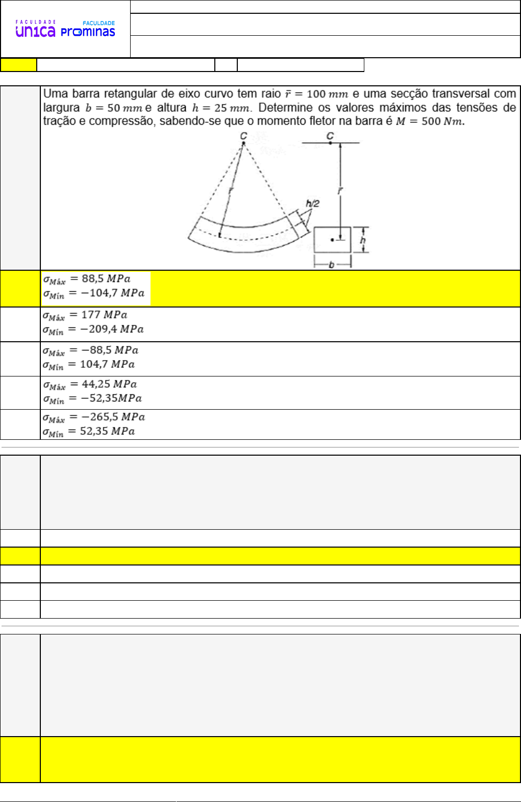 16/04/2024 19:20:42 1/4 REVISÃO DE SIMULADO Nome: PAULO SERGIO DOS SANTOS SUBTIL Disciplina: Mecânica dos Sólidos II Respostas corretas são marcadas em amarelo X Respostas marcardas por você. Questão 001 A) B) C) X D) E) Questão 002 O cisalhamento, também conhecido como força de corte, é uma forma de solicitação mecânica que ocorre quando duas partes de uma estrutura são deslocadas em direções opostas ao longo de um plano paralelo. Essa solicitação cria um efeito de deslizamento relativo entre as partes da estrutura. Qual dos seguintes exemplos representa uma situação em que ocorre cisalhamento em uma estrutura? A) Uma estrutura de concreto suportando cargas verticais. B) Uma ponte suspensa com forças atuando verticalmente sobre os cabos. X C) Uma estrutura de aço submetida a uma força de tração. D) Um prédio em um terreno plano. E) Uma viga de madeira submetida a uma força de compressão. Questão 003 A análise de carregamento transversal em vigas é fundamental na engenharia, pois permite avaliar como as forças perpendiculares à direção principal afetam a estrutura. Isso é crucial para garantir a integridade das vigas, pois cargas transversais podem causar flexão, cisalhamento e torção, podendo levar a falhas catastróficas se não forem devidamente consideradas. Portanto, essa análise desempenha um papel essencial na segurança e eficiência de projetos estruturais. Com relação a vigas submetidas a carregamento transversal, marque a alternativa INCORRETA: A) Para calcular a resposta de uma estrutura submetida a uma carga transversal, é necessário utilizar os métodos dos elementos finitos em detrimento do cálculo analítico, pois aquele possui maior precisão e assertividade do que este. 16/04/2024 19:20:42 2/4 B) A carga transversal é um importante aspecto a ser considerado no projeto e análise de estruturas, pois pode afetar a resistência, a estabilidade e o desempenho da estrutura. A capacidade da estrutura de suportar cargas transversais é determinada pela sua capacidade de resistir às deformações resultantes da carga aplicada. C) Quando uma estrutura é submetida a uma carga transversal, ocorrem deformações que causam a deflexão da estrutura. Em vigas, por exemplo, uma carga transversal faz com que a viga se flexione, resultando em uma curvatura ao longo do seu comprimento. A magnitude e a forma da deflexão dependem das propriedades do material, da geometria da estrutura, das condições de apoio e da distribuição da carga transversal. X D) Quando uma estrutura é submetida a uma carga transversal, como uma carga aplicada perpendicularmente ao seu eixo, ocorre um deslocamento transversal. Esse deslocamento é causado pela deformação na seção transversal da estrutura. Em vigas, por exemplo, a carga transversal causa uma deflexão da viga ao longo do seu comprimento. E) O carregamento transversal pode ser de diferentes tipos, como uma carga pontual, uma carga distribuída uniformemente ao longo da estrutura, uma carga concentrada em um ponto específico ou uma carga distribuída de forma não uniforme. Questão 004 Um componente de Máquina tem secção transversal em forma de T, orientada como mostrado na figura abaixo. Sabendo-se que M=2500 Nâ��m, determine a tensão nos pontos A e B respectivamente. (Dimensões em mm) A) - 104,1 MPa e 92,3 MPa X B) 92,3 MPa e 55,8 MPa C) - 104,1 MPa e 55,8 MPa D) 208,2 MPa e 104,1 MPa E) - 55,8 MPa e 92,3 MPa Questão 005 As vigas curvas são elementos estruturais que possuem uma forma geométrica curva em seu eixo longitudinal, ao contrário das vigas retas - que são retas ao longo de seu comprimento - as vigas curvas apresentam curvaturas ao longo de sua extensão. Elas podem ser encontradas em diversas aplicações, tais como pontes, arcos, estruturas de telhado, elementos de esculturas e outras estruturas arquitetônicas. Com relação as vigas curvas, todas as alternativas estão corretas, EXCETO: A) Em vigas curvas submetidas a carregamento transversal, surgirá o momento fletor, que nada mais é do que a reação de que provoca flexo-torção na viga curva. Essa flexão combinada vai variar ao longo do comprimento da viga, e também ao longo da secção transversal, de acordo com a distribuição de cargas e com a curvatura. O momento fletor resultante da curvatura da viga causará tensões de tração em ambos os lados da viga. B) esforços ao longo de sua extensão, mantendo sua integridade estrutural. Entretanto, o comportamento das vigas curvas é influenciado pela sua curvatura e geometria. 16/04/2024 19:20:42 3/4 C) Uma das características principais da viga curva diz respeito exatamente à sua curvatura onde verifica-se que a medida da sua forma curva percorre ao longo do eixo longitudinal. Essa curvatura pode ser constante ou até mesmo variar ao longo da viga, e essa disposição vai afetar a distribuição de tensões e deformações em todo o seu comprimento. X D) O projeto e a análise das vigas curvas geralmente envolvem técnicas de análise estrutural, como o método dos elementos finitos, para que seja possível determinar as tensões, deformações e deslocamentos ao longo da viga. Algumas considerações específicas, como a escolha dos materiais, a geometria da curva e as condições de contorno, são levadas em conta para garantir a segurança e o desempenho adequado das vigas curvas. E) Quando falamos de tensões e deformações, podemos afirmar que a curvatura da viga curva será responsável por essa indução. De maneira geral, as tensões são maiores na região comprimida da viga (lado interno da curva) e menores na região tracionada (lado externo da curva). Já as deformações são afetadas pela curvatura de maneira semelhante, com maior deformação na região comprimida e menor deformação na região tracionada. Questão 006 Os deslocamentos são uma resposta da estrutura às cargas aplicadas e podem ocorrer em diferentes direções e formas,