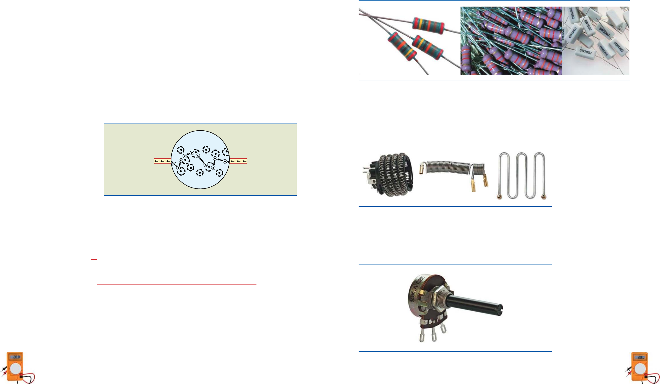 CAPÍTULO 2ELETRôNICA 1 40 41 Os resistores podem ser construídos com fio, filme de carbono, filme metálico etc. A figura 2.2 ilustra alguns tipos de resistores disponíveis comercialmente. Em outros casos, deseja-se transformar energia elétrica em térmica, como no chuveiro, no forno elétrico e no secador de cabelos. Esses elementos também são denominados resistores, mas comercialmente costumam ser chamados de ele- mentos de aquecimento ou de “resistências”. É comum dizermos que a resistên- cia do chuveiro “queimou”, o que pode causar certa confusão, pois a resistência é uma propriedade, e não um dispositivo. Outra importante característica de um resistor é a potência máxima dissipada. Resistores de carbono e filme metálico são encontrados na faixa de 0,1 a 1 W; resistores de fio estão na faixa de 5 a 100 W; e resistores de aquecimento para uso residencial se situam entre 1 e 5 kW. Figura 2.2 diversos tipos de resistor. Figura 2.3 Elementos para chuveiro Elemento para estufa Resistores para aquecimento. Figura 2.4 potenciômetro (resistor variável). FO TO S: S h U T T ER ST O c k FO TO S: V A LT ER JO SÉ M IG U EL VA LT ER JO SÉ M IG U EL Q uando se estabelece uma tensão entre os terminais de um condu- tor, o campo elétrico gerado pela tensão provoca o movimento ordenado dos elétrons livres, ou seja, uma corrente elétrica. Esses elétrons, em seu deslocamento, chocam-se com os átomos do condutor, resultan- do na produção de calor (figura 2.1). Os átomos de alguns condutores oferecem maior resistência à passagem da corrente que outros e, nesse caso, produz-se mais calor. Tal propriedade física dos condutores é chamada de resistência elétrica. Em outras palavras, parte da energia fornecida ao fio é transformada em energia elétrica (energia de movimento dos elétrons) e parte, em energia térmica. Essa conversão em calor é conhecida como efeito Joule. Quanto mais alto o valor da resistência elétrica do condutor, maior a oposição à passagem da corrente e maior a quantidade de calor dissipado. 2.1 Resistores A resistência elétrica depende do material, das dimensões do condutor e da tempe- ratura (agitação térmica). Sua unidade de medida no SI é o ohm, de símbolo Ω. Em muitos casos práticos, deseja-se que o valor da resistência seja o menor pos- sível, para reduzir a dissipação de energia – por exemplo, nos condutores empre- gados em redes elétricas, transformadores e motores. Em outras aplicações, como nos circuitos eletrônicos, deseja-se limitar a cor- rente em um valor estipulado. Nesse caso, utiliza-se um componente espe- cialmente destinado a esse fim, o resistor. Trata-se de um elemento físico cuja característica principal é a resistência elétrica. Figura 2.1 Elétrons livres em movimento chocam-se com os átomos do condutor, produzindo calor. Essa unidade foi adotada em homenagem ao cientista alemão George Simon Ohm, que formulou a lei relacionando tensão, resistência e corrente elétrica em um elemento de circuito. CAPÍTULO 2ELETRôNICA 1 42 43 2.1.2 Código de cores dos resistores Os resistores com maiores dimensões têm a indicação da resistência e da potên- cia no próprio corpo (resistores de fio). Outros, de menor potência, utilizam apenas um código de cores para indicar seu valor. O código de cores consiste em quatro ou cinco anéis coloridos impressos no corpo do resistor (figura 2.9). A tabela 2.1 apresenta o valor e a tolerância dos anéis segundo a cor. Cores Valor (1o ao 3o anel) Tolerância (4o ou 5o anel) Preto 0 (menos 1o anel) Marrom 1 1% Vermelho 2 2% Laranja 3 Amarelo 4 Verde 5 0,5% (apenas 5o anel) Azul 6 Roxo/lilás/violeta 7 Cinza 8 Branco 9 Ouro –1 (apenas 3o anel) 5% Prata –2 (apenas 3o anel) 10% (não mais fabricado) Figura 2.8 Representação gráfica de potenciômetros e trimpots. a) b) Figura 2.9 código de cores para resistores: sistemas de (a) quatro anéis e (b) cinco anéis. Tabela 2.1 código de cores de anéis Algumas aplicações exigem que o valor da resistência do resistor seja variado. Em aplicações eletrônicas de baixa potência, elementos que permitem tal varia- ção são encontrados na forma de potenciômetros como o da figura 2.4, usado para o controle de volume em sistemas de som antigos, em que o operador tinha acesso a seu eixo. Há também os trimpots (figura 2.5), utilizados para ajustes no circuito eletrôni- co, não acessíveis ao operador. Outro dispositivo que possibilita a variação da resistência é o reostato (figura 2.6), de elevada potência. 2.1.1 Simbologia Em qualquer um dos casos descritos, o resistor é representado em um circuito por um dos símbolos gráficos mostrados na figura 2.7. Os potenciômetros e os trimpots são dispositivos de três terminais, dois para o resistor e um para o cursor, e são representados graficamente como ilustrado na figura 2.8. O termo trimpot vem da junção das palavras inglesas trimmer e potenciometer. Figura 2.5 diversos tipos de trimpot (resistor variável). Figura 2.6 Tipo de reostato. Figura 2.7 Representação gráfica de uma resistência fixa. W Ik Ip Ed IA .O R G FO TO S: V A LT ER JO SÉ M IG U EL CAPÍTULO 2ELETRôNICA 1 44 45 • D: preto = 0. • E: marrom = 1%. Nesse caso, a resistência do resistor é: R = 339 · 100 Ω ± 1% = 339 kΩ ± 0,5% 2.1.3 Medição da resistência O instrumento que mede a resistência elétrica de um dispositivo ou circuito é o ohmímetro. O aparelho deve ser conectado em paralelo à resistência a ser medi- da, conforme ilustrado na figura 2.10. O componente sob medição não poderá em hipótese alguma estar energizado, a fim de evitar danos ao instrumento. Note que nessa figura a fonte está desconectada do resistor. Mesmo com o circuito desenergizado, deve-se tomar o cuidado de verificar se não existem outros componentes conectados ao resistor sob medição. No caso da figura 2.11, o ohmímetro está indicando a leitura das duas resistências