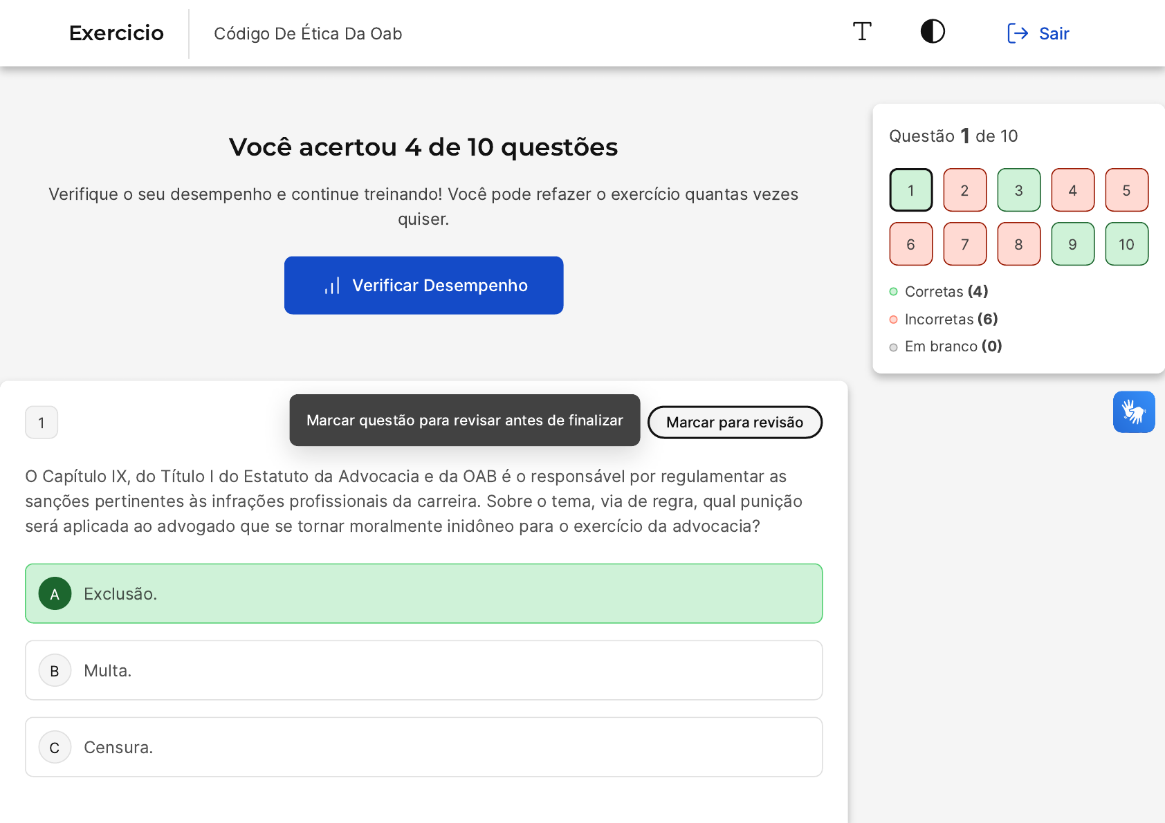 Você acertou 4 de 10 questões Verifique o seu desempenho e continue treinando! Você pode refazer o exercício quantas vezes quiser. Verificar Desempenho A B C 1 Marcar para revisãoMarcar questão para revisar antes de finalizar O Capítulo IX, do Título I do Estatuto da Advocacia e da OAB é o responsável por regulamentar as sanções pertinentes às infrações profissionais da carreira. Sobre o tema, via de regra, qual punição será aplicada ao advogado que se tornar moralmente inidôneo para o exercício da advocacia? Exclusão. Multa. Censura. Questão 1 de 10 Corretas �4� Incorretas �6� Em branco �0� 1 2 3 4 5 6 7 8 9 10 Exercicio Código De Ética Da Oab Sair D E Advertência. Suspensão. Resposta correta Parabéns, você selecionou a alternativa correta. Confira o gabarito comentado! Gabarito Comentado De acordo com o Estatuto da Advocacia e da OAB, especificamente no art. 38, II, a punição para o advogado que se torna moralmente inidôneo para o exercício da advocacia é a exclusão. Esta infração está descrita nos incisos XXVI a XXVII do art. 34. Portanto, a alternativa correta é a "A", que menciona a exclusão como punição para tal infração profissional. 2 Marcar para revisão �FGV/OAB/XXVIII Exame � 2019 � ADAPTADA� Maria teve um processo disciplinar recentemente instaurado contra si pelo Conselho Seccional da OAB, no qual está inscrita. No dia seguinte à sua notificação por meio de edital, encontra-se no fórum com Tânia, sua ex-colega de faculdade, que veio comentar com Maria sobre o conteúdo do referido processo. De acordo com o Estatuto da OAB, Tânia poderia conhecer o conteúdo do processo disciplinar instaurado, em face de Maria: A B C D E Por qualquer meio, dada a natureza pública de sua tramitação. Se fosse parte, defensora de parte ou autoridade judiciária competente, dada a natureza sigilosa de sua tramitação. Caso tivesse tido acesso à notificação inicial, feita por meio de edital, dada a natureza pública de sua tramitação. Em nenhuma hipótese, dada a natureza sigilosa de sua tramitação. Apenas se comprovar sua inscrição nos quadros da Ordem dos Advogados do Brasil. Resposta incorreta Opa! A alternativa correta é a letra B. Confira o gabarito comentado! Gabarito Comentado De acordo com o artigo 72, parágrafo 2º, da Lei 8906/94, o processo disciplinar tramita em sigilo, até o seu término. Isso significa que apenas as partes envolvidas, seus defensores e a autoridade judiciária competente têm acesso às informações do processo. Portanto, no caso apresentado, Tânia só poderia ter conhecimento do conteúdo do processo disciplinar instaurado contra Maria se fosse parte, defensora de parte ou autoridade judiciária competente. Isso reforça a importância do sigilo no trâmite de processos disciplinares, garantindo a privacidade e a justiça para as partes envolvidas. A B C D E 3 Marcar para revisão O poder de punir disciplinarmente os inscritos na Ordem dos Advogados do Brasil compete exclusivamente ao Conselho Seccional em cuja base territorial tenha ocorrido a infração, salvo se a falta for cometida perante o Conselho Federal. Nos termos da Lei 8.906/94, instaurado o processo disciplinar na OAB, se o representado não for encontrado, ou for revel, o Presidente do Conselho ou da Subseção: Deve designar-lhe defensor dativo. Deve indicar-lhe a Defensoria Pública. Deve seguir com o processo disciplinar, independentemente de advogado ou defensor. Deve suspender o processo até que o representado apareça. Deve representar pela prisão do representado. Resposta correta Parabéns, você selecionou a alternativa correta. Confira o gabarito comentado! Gabarito Comentado De acordo com o artigo 73, parágrafo 4º, do Estatuto da Advocacia e da Ordem dos Advogados do Brasil �EAOAB�, quando o representado não for encontrado ou for revel, o Presidente do A B Conselho ou da Subseção tem a obrigação de designar um defensor dativo para ele. Isso significa que, nesse contexto, um advogado é nomeado para representar e defender os interesses do representado no processo disciplinar, garantindo assim o direito de defesa e o devido processo legal. 4 Marcar para revisão O art. 35 do Estatuto da Advocacia e da OAB lista as sanções disciplinares que podem ser aplicadas pela OAB. São elas: censura, suspensão, exclusão e multa. Sobre o tema, analise os itens a seguir e, em seguida, assinale a alternativa que apresenta corretamente infrações disciplinares que são punidas com censura. I. Abandonar a causa sem justo motivo ou antes de decorridos 10 (dez) dias da comunicação da renúncia. II. Recusar-se a prestar, sem justo motivo, assistência jurídica, quando nomeado em virtude de impossibilidade da Defensoria Pública. III. Fazer publicar na imprensa, desnecessária e habitualmente, alegações forenses ou relativas a causas pendentes. IV. Deturpar o teor de dispositivo de lei ou de citação doutrinária ou de julgado, bem como de depoimentos, documentos e alegações da parte contrária, para confundir o adversário ou iludir o juiz da causa. V. Manter conduta incompatível com a advocacia. Apenas os itens III, IV e V estão corretos. Apenas os itens II, III e IV estão corretos. C D E Apenas os itens I, II e III estão corretos. Apenas os itens I, III e IV estão corretos. Apenas os itens I, II, III e IV estão corretos. Resposta incorreta Opa! A alternativa correta é a letra E. Confira o gabarito comentado! Gabarito Comentado Manter conduta incompatível com a advocacia é considerada infração de natureza grave e, por conseguinte, punida com suspensão (art. 34, XXV�. As demais infrações trazidas nos itens I, II, III e IV são punidas com censura. A censura é uma das sanções mais leves aplicadas pela OAB, de maneira que ela pune a prática das infrações mais leves cometidas pelos advogados, que são aquelas arroladas no art. 36 do Estatuto. 5 Marcar para revisão �FGV/OAB/XXVIII 