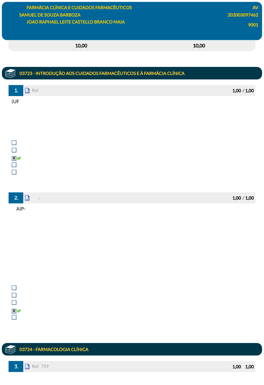 Disciplina: FARMÁCIA CLÍNICA E CUIDADOS FARMACÊUTICOS AV Aluno: SAMUEL DE SOUZA BARBOZA 202003097462 Professor: JOAO RAPHAEL LEITE CASTELLO BRANCO MAIA Turma: 9001 DGT1165_AV_202003097462 (AG) 07/11/2023 20:47:15 (F) Avaliação: 10,00 pts Nota SIA: 10,00 pts 03723 - INTRODUÇÃO AOS CUIDADOS FARMACÊUTICOS E À FARMÁCIA CLÍNICA 1. Ref.: 7664969 Pontos: 1,00 / 1,00 (UFRJ - 2018 - RJ) Um paciente com doença crônica, em acompanhamento ambulatorial, precisou ser internado. Foi solicitado aos familiares que trouxessem os medicamentos de uso crônico, que estavam em sua residência, para que ele pudesse dar continuidade ao tratamento. Ao receber a receita na farmácia, para reposição do tratamento, o farmacêutico constatou que as doses estavam muito divergentes e a correção foi providenciada para fornecimento adequado. Nesta situação identi�ca-se a promoção do uso racional, a orientação farmacêutica, o seguimento/acompanhamento farmacoterapêutico e a dispensação, que são componentes gerais da: Farmácia clínica Assistência farmacêutica Atenção farmacêutica Prescrição farmacêutica Educação em saúde 2. Ref.: 7663511 Pontos: 1,00 / 1,00 (CAIP-IMES - 2015 - Prefeitura de Mogi das Cruzes - SP - adaptada) Atenção Farmacêutica pode ser de�nida como um modelo de prática farmacêutica, desenvolvida no contexto da Assistência Farmacêutica. Compreende atitudes, valores éticos, comportamentos, ______________, compromissos e corresponsabilidades na prevenção de doenças, promoção e ______________ da saúde, de forma integrada à equipe de saúde. É a interação direta do farmacêutico com o ______________, visando a uma farmacoterapia racional e à obtenção de resultados de�nidos e mensuráveis, voltados para a melhoria da qualidade de vida. Esta interação também deve envolver as concepções dos seus sujeitos, respeitadas as suas especi�cidades biopsicossociais, sob a ótica da ____________ das ações de saúde. Assinale a alternativa que completa corretamente as lacunas do texto acima. Habilidades - obtenção - usuário - equidade Habilidades - usuário - equidade - obtenção - médica Envolvimentos - obtenção - médico - equidade Habilidades - recuperação - usuário - integralidade Envolvimentos - recuperação - médico - integralidade 03724 - FARMACOLOGIA CLÍNICA 3. Ref.: 7598964 Pontos: 1,00 / 1,00 javascript:alert('C%C3%B3digo da quest%C3%A3o: 7664969.'); javascript:alert('C%C3%B3digo da quest%C3%A3o: 7664969.'); javascript:alert('C%C3%B3digo da quest%C3%A3o: 7663511.'); javascript:alert('C%C3%B3digo da quest%C3%A3o: 7663511.'); javascript:alert('C%C3%B3digo da quest%C3%A3o: 7598964.'); javascript:alert('C%C3%B3digo da quest%C3%A3o: 7598964.'); A ___________________ é o ramo da farmacologia que estuda como a variabilidade genética altera a forma com a qual cada indivíduo responde a um medicamento. Possui o objetivo de "personalizar" ou "individualizar" a terapia medicamentosa, visando maximizar a e�cácia do fármaco e reduzindo a incidência de reações adversas. Assinale a alternativa que preenche corretamente a lacuna. Farmacovigilância Farmacogenômica Farmacoeconomia Farmacodinâmica Farmacocinética 4. Ref.: 7598969 Pontos: 1,00 / 1,00 (Adaptado da UFRJ-2018) O monitoramento terapêutico por meio de dados farmacocinéticos clínicos é essencial na garantia de uma terapia segura e e�caz, no entanto, tal monitoramento não se aplica a qualquer caso, pois depende de características inerentes ao medicamento que se pretende monitorar. Assinale a alternativa que descreve corretamente uma característica do medicamento que torna possível e/ou necessário o monitoramento terapêutico. Ausência de correlação entre a concentração sérica do fármaco e sua e�cácia e toxicidade. Presença de um parâmetro clínico claramente de�nido que permita ajustes de dose. Relação previsível entre a dose e o desfecho clínico. Toxicidade que possa levar à hospitalização, a danos irreversíveis nos órgãos e até à morte. Janela terapêutica ampla, na qual a dose de um fármaco que produz as concentrações terapêuticas desejadas seja distante da dose que também pode produzir concentração sérica tóxica. 03725 - MONITORAMENTO CLÍNICO 5. Ref.: 6117382 Pontos: 1,00 / 1,00 (PR-4 UFRJ - 2018 - UFRJ - Técnico em Farmácia) Assinale a alternativa que apresenta algumas vantagens da utilização de prescrição eletrônica. Facilidade de leitura, redução do número de erros na prescrição e rapidez na disponibilidade da prescrição para a farmácia. Presença de alertas de interação medicamentosa, possibilidade de fazer alterações manuais nas prescrições e facilidade de leitura. Facilidade de leitura, redução do número de erros na prescrição e possibilidade de repetir a prescrição de dias anteriores sem revisão. Rapidez na disponibilidade da prescrição para a farmácia, presença de alertas de interação medicamentosa e dependência do sistema eletrônico. Melhor identi�cação do prescritor, facilidade de leitura e possibilidade de erros de digitação. 6. Ref.: 6117492 Pontos: 1,00 / 1,00 (IBFC - 2016 - SES-PR - Assistente de Farmácia) A receita é de�nida como prescrição escrita de medicamento, contendo orientação de uso para o paciente, efetuada por pro�ssional legalmente habilitado, quer seja de formulação magistral ou de produto industrializado. Sobre as receitas considere as a�rmativas abaixo. I. Para ser atendida, é obrigatório que na receita conste a data e a assinatura do pro�ssional prescritor, endereço do consultório ou residência, e o número de inscrição no respectivo Conselho pro�ssional. II. A receita tem que conter expressamente o modo de usar a medicação. javascript:alert('C%C3%B3digo da quest%C3%A3o: 7598969.'); javascript:alert('C%C3%B3digo da quest%C3%A3o: 7598969.'); javascript:alert('C%C3%B3digo da quest%C3%A3o: 6117382.'); javascript:alert('C%C3%B3d