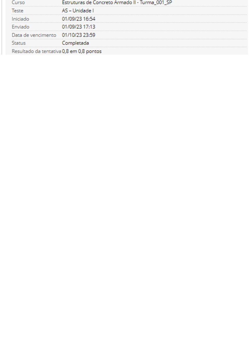 AS – UNIDADE I PERGUNTA 1 Qual das alternativas define o estado-limite último? “estado-limite último (ELU): estado-limite relacionado ao colapso, ou a qualquer outra forma de ruína estrutural, que determine a paralisação do uso da estrutura; “ a. Estado em que se inicia a formação de fissuras. Admite-se que este estado-limite é atingido quando a tensão de tração máxima na seção transversal for igual a fct,f. b. Estado no qual, em um ou mais pontos da seção transversal, a tensão normal é nula, não havendo tração no restante da seção. Verificação usual no caso do concreto protendido. c. Estado-limite relacionado ao colapso ou a qualquer outra forma de ruína estrutural, que determine a paralisação do uso da estrutura. d. Estado em que as deformações atingem os limites estabelecidos para a utilização normal, dados no item 13.3 da NBR 6118:2014. e. Estado em que as fissuras se apresentam com aberturas iguais aos máximos especificados no item 13.4.2 da NBR 6118:2014. PERGUNTA 2 Qual das alternativas define o estado-limite de formação de fissuras? “estado-limite de formação de fissuras (ELS-F): estado em que se inicia a formação de fissuras. Admite-se que este estado-limite é atingido quando a tensão de tração máxima na seção transversal for igual a fct,f; “ a. Estado-limite relacionado ao colapso ou a qualquer outra forma de ruína estrutural, que determine a paralisação do uso da estrutura. b. Estado no qual, em um ou mais pontos da seção transversal, a tensão normal é nula, não havendo tração no restante da seção. Verificação usual no caso do concreto protendido. c. Estado em que as fissuras se apresentam com aberturas iguais aos máximos especificados no item 13.4.2 da NBR 6118:2014. d. Estado em que se inicia a formação de fissuras. Admite-se que este estado-limite é atingido quando a tensão de tração máxima na seção transversal for igual a fct,f. e. Estado em que as deformações atingem os limites estabelecidos para a utilização normal, dados no item 13.3 da NBR 6118:2014. PERGUNTA 3 A norma dividiu o cálculo segundo dois modelos, os Modelos de Cálculo I e II. O Modelo de Cálculo I admite a chamada treliça clássica, com ângulo de inclinação das diagonais comprimidas (q) fixo em 45°. Já o Modelo de Cálculo II considera a chamada treliça generalizada, onde o ângulo de inclinação das diagonais comprimidas pode variar entre ___ e ___. Aos modelos de treliça foi associada uma força cortante adicional Vc, proporcionada por mecanismos complementares ao de treliça. Assinale a alternativa que completa as lacunas corretamente: a. 30° e 45°. b. 45° e 75°. c. 35° e 50°. d. 5° e 20°. e. 15° e 30°. PERGUNTA 4 1. Qual das alternativas define o estado-limite de compressão excessiva? estado-limite de compressão excessiva (ELS-CE): estado em que as tensões de compressão atingem o limite convencional estabelecido. Usual no caso do concreto protendido na ocasião da aplicação da protensão; a. Estado em que as tensões de compressão atingem o limite convencional estabelecido. Usual no caso do concreto protendido na ocasião da aplicação da protensão. b. Estado em que as deformações atingem os limites estabelecidos para a utilização normal, dados no item 13.3 da NBR 6118:2014. c. Estado em que as vibrações atingem os limites estabelecidos para a utilização normal da construção. d. Estado no qual, em um ou mais pontos da seção transversal, a tensão normal é nula, não havendo tração no restante da seção. Verificação usual no caso do concreto protendido. e. Estado no qual garante-se a compressão na seção transversal, na região onde existem armaduras ativas. Essa região deve se estender até uma distância ap da face mais próxima da cordoalha ou da bainha de protensão. AS – UNIDADE I I PERGUNTA 1 “De acordo com Vasconcelos (1991) apud Cruz (2016), os estudos objetivando definir um parâmetro para a avaliação da consideração dos efeitos de segunda ordem, através da rigidez horizontal de uma estrutura, tiveram início há bastante tempo. Porém, somente em ____ é que Hurbert Beck e Gert König conseguiram equacionar o problema. Eles se basearam na teoria de ____ e apresentaram um modelo que considera um pilar engastado na base e livre no topo, com cargas vertical e horizontal, distribuídas, ao longo de toda a sua altura, supondo-se para esta estrutura comportamento elástico-linear”. Assinale a alternativa que completa as lacunas corretamente: a. 1910 e Bernoulli. b. 1967 e Euler. c. 1980 e Botelho. d. 1950 e Passos. e. 1856 e Newton. PERGUNTA 2 Por essa razão, a análise global da estrutura e o estudo das causas e consequências do coeficiente ______ são itens que fazem parte do projeto, e que não podem ser ignorados. O processo "P-Delta" torna-se então uma alternativa viável para a consideração dos efeitos de 1ª + 2ª ordem na Estrutura. Assinale a alternativa que completa a lacuna corretamente: a. Gama-Z. b. Arrasto. c. Majoração. d. Manning. e. Minoração. PERGUNTA 3 Em 1885, o arquiteto William Le Baron Jenney construiu o primeiro arranha-céu do mundo em Illinois, Chicago. Note que a construção possuía __ andares e posteriormente foram adicionados mais ___ andares, sua medida original era de 42,1 metros. Então em 1885 um edifício com 42 metros já era considerado um grande feito da engenharia, assim como deveria assombrar quem passava por perto ou entrava dentro dele. Assinale a alternativa que completa as lacunas respectivamente e corretamente: a. 10 e 2. b. 6 e 4. c. 12 e 3. d. 10 e 4. e. 2 e 10. PERGUNTA 4 A expressão proposta por Beck e König, Eq. 1, para a quantificação do parâmetro, que já foi chamado de ___________________ (TRM), reúne a influência da altura, H; das cargas verticais uniformemente distribuídas ao longo da altura H do pilar com valor característico, Fvk, bem como a rigidez a flexão EI. (JÚNIOR et al (20