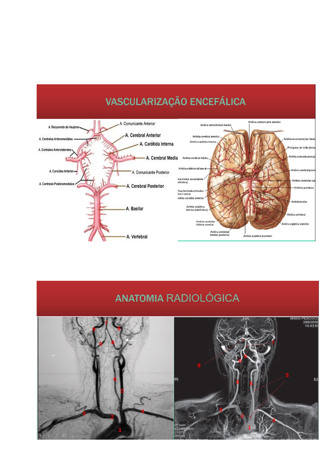 Círculo Arterial Cerebral (Polígono de Willis) As Aa. Carótidas Externas são responsáveis, através de seus ramos, pela vascularização da face e do couro cabeludo, enquanto que as Aa. Carótidas Internas serão responsáveis, através de seus ramos (Polígono de Willis) pela vascularização das partes médias e anteriores do Cérebro. Estudo anatômico radiológico (ÂngioRM de pescoço) Neste estudo anatômico podemos identificar importantes estruturas descritas abaixo: 1. Arco da A. Aorta 2. Tronco Braquiocefálico 3. A. Subclávia D 4. A. Subclávia E 5. A. Carótida Comum E 6. Aa. Vertebrais D/E 7. A. Basilar 8. A. Cerebral posterior D 9. Aa. Carótidas Internas D/E Radiograficamente, podemos observar o Círculo Arterial Cerebral (Polígono de Willis) através de exames contrastados realizados pela hemodinâmica (Ângiografia cerebral), pela Ressonância Magnética (ÂngioRM cerebral) ou pela Tomografia Computadorizada (ÂngioTC cerebral). Estudo anatômico radiológico (ÂngioRM/Ângiografia) Neste estudo anatômico podemos identificar importantes estruturas descritas abaixo: 1. Aa. Vertebrais D/E 2. Aa. Carótidas Internas D/E 3. A. Basilar 4. A. Cerebral Posterior E 5. Não apontado 6. A. Cerebral Média D 7. A. Cerebral Anterior D Obs: A Ângiografia cerebral realizada pela hemodinâmica pode ser identificada pelo aspecto radiológico radiolúcido, característico da fluoroscopia (método de exposição contínua de Rx). Seios encefálicos Os ductos formados pelo encontro das laminas externas e internas da meninge dura- máter é responsável pela maior parte da drenagem do sangue presente no crânio. O sangue venoso oriundo dos seios sagitais superior e inferior, reto, e occipital se encontram na confluência dos seios. Daí, seguem pelos seios transversos, sigmóides até chegarem a veia jugular interna. Estudo anatômico radiológico (ÂngioRM venosa) Neste estudo anatômico ÂngioRM venosa cerebral, podemos identificar importantes estruturas descritas abaixo: 8. Seio sagital superior 9. Seio sagital inferior 10. Seio reto 11. Confluência dos seios 12. Seios Tranversos D/E 13. Seios Sigmoides D/E 14. Seio Occipital 15. Veias Jugulares Internas D/E Líquido Cerebrospinal, Ventrículos e Meninges O líquor ou líquido cerebrospinal é um fluido incolor que ocupa o espaço subaracnóideo e as cavidades ventriculares A função primordial do líquor é de proteção mecânica do sistema nervoso central, formando um coxim líquido entre este o estojo ósseo Qualquer pressão ou choque que se exerça em um ponto deste coxim, distribuir-se- á igualmente a todos os pontos (princípio de Pascal) Por outro lado, em virtude do SNC encontrar-se totalmente submerso em líquido, este torna-se muito mais leve (princípio de Arquimedes), o que reduz o risco de traumatismos do encéfalo O liquido cerebrospinal é produzido nos plexos corióideos, que se projetam em cada um dos quatro ventrículos; Os ventrículos laterais contribuem com o maior contingente liquórico, que passa para o terceiro ventrículo pelos forames interventriculares e daí ao quarto ventrículo através do aqueduto do mesencéfalo; Através das aberturas laterais e mediana, o liquido cerebrospinal ganha o espaço subaracnóideo, sendo reabsorvido principalmente através das granulações aracnóideas que se projetam no interior dos seios da dura-máter No espaço subaracnóideo da medula espinal, o liquido cerebrospinal desce em direção caudal, mas apenas uma pequena parte volta, pois há reabsorção nas pequenas granulações aracnóideas existentes nos prolongamentos da dura-máter que acompanham as raízes dos nervos espinais Um possível desequilíbrio entre a produção e a drenagem desse líquor pode ocasionar a dilatação dos ventrículos conhecido como hidrocefalia. Tema 2 / Tópico 4 Anatomia Radiológica da Coluna Vertebral Superiormente, se articula com o osso occipital (crânio); inferiormente, articula-se com o osso do quadril (Ilíaco). A coluna vertebral é dividida em quatro regiões: Cervical, Torácica, Lombar e Sacro- Coccígea. São 7 vértebras cervicais, 12 torácicas, 5 lombares, 5 sacrais e cerca de 3 coccígeas. Estudo da anatomia radiológica da Coluna vertebral (Rx - AP e Perfil) Neste estudo anatômico através do Rx de Coluna vertebral, podemos identificar importantes estruturas descritas abaixo: 1. Arco anterior do Atlas (C1) 2. Áxis (C2) 3. C3 4. Corpo da vertebra (C7) 5. Espaço intervertebral 6. Forame intervertebral 7. Processo espinhoso (C2) 8. Laringe 9. Traquéia 10. Osso Hióide Importante entendermos que, devido sua densidade, não conseguimos visualizar o disco intervertebral na radiografia simples, portanto, denominamos sua região. A manutenção do espaço é um bom sinal da integridade do disco e é utilizado como um parâmetro no diagnóstico da hérnia de disco. Já na Tomografia Computadorizada (TC) e Ressonância Magnética, devido à sensibilidade dessas modalidades é possível visualizar o Disco Intervertebral, portanto, o descrevemos. Estudo Anatômico Radiológico do Pescoço Nesta RM de Pescoço podemos observar importantes estruturas anatômicas abaixo enumeradas: 11. Glândula Parótida 12. Músculo Esternocleidomastóideo 13. Disco Intervertebral 14. Vertebra Cervical (C7) 15. Ápices pulmonares 16. Meato Acústico Externo (MAE) 17. Artéria Vertebral E No corte sagital, podemos observar a sintopia entre as vias respiratórias, digestórias, Coluna Vertebral e Medula Espinal. Nesta perspectiva de visão (sagital) podemos estudar as seguintes estruturas enumeradas: 18. Traquéia 19. Medula Espinal 20. M. Trapézio 21. Costela 22. Bulbo 23. Medula Espinal O 10 trata-se do Disco Intervertebral e o 15 o Ápice do Pulmão