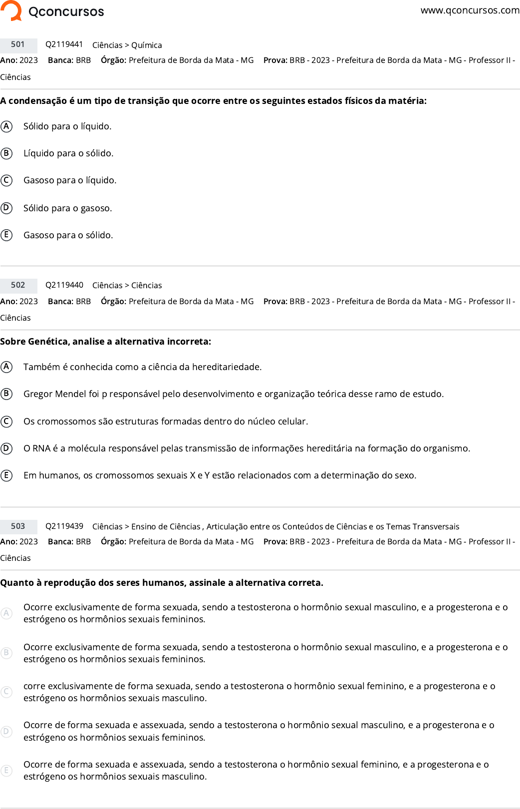 www.qconcursos.com Ano: 2023 Banca: BRB Órgão: Prefeitura de Borda da Mata - MG A condensação é um tipo de transição que ocorre entre os seguintes estados físicos da matéria: A Sólido para o líquido. B Líquido para o sólido. C Gasoso para o líquido. D Sólido para o gasoso. E Gasoso para o sólido. Ano: 2023 Banca: BRB Órgão: Prefeitura de Borda da Mata - MG Sobre Genética, analise a alternativa incorreta: A Também é conhecida como a ciência da hereditariedade. B Gregor Mendel foi p responsável pelo desenvolvimento e organização teórica desse ramo de estudo. C Os cromossomos são estruturas formadas dentro do núcleo celular. D O RNA é a molécula responsável pelas transmissão de informações hereditária na formação do organismo. E Em humanos, os cromossomos sexuais X e Y estão relacionados com a determinação do sexo. Ano: 2023 Banca: BRB Órgão: Prefeitura de Borda da Mata - MG Quanto à reprodução dos seres humanos, assinale a alternativa correta. A Ocorre exclusivamente de forma sexuada, sendo a testosterona o hormônio sexual masculino, e a progesterona e o estrógeno os hormônios sexuais femininos. B Ocorre exclusivamente de forma sexuada, sendo a testosterona o hormônio sexual masculino, e a progesterona e o estrógeno os hormônios sexuais femininos. C corre exclusivamente de forma sexuada, sendo a testosterona o hormônio sexual feminino, e a progesterona e o estrógeno os hormônios sexuais masculino. D Ocorre de forma sexuada e assexuada, sendo a testosterona o hormônio sexual masculino, e a progesterona e o estrógeno os hormônios sexuais femininos. E Ocorre de forma sexuada e assexuada, sendo a testosterona o hormônio sexual feminino, e a progesterona e o estrógeno os hormônios sexuais masculino. 501 Q2119441 >Ciências Química Prova: BRB - 2023 - Prefeitura de Borda da Mata - MG - Professor II - Ciências 502 Q2119440 >Ciências Ciências Prova: BRB - 2023 - Prefeitura de Borda da Mata - MG - Professor II - Ciências 503 Q2119439 >Ciências Ensino de Ciências , Articulação entre os Conteúdos de Ciências e os Temas Transversais Prova: BRB - 2023 - Prefeitura de Borda da Mata - MG - Professor II - Ciências https://www.qconcursos.com/ https://www.qconcursos.com/questoes-de-concursos/bancas/brb https://www.qconcursos.com/questoes-de-concursos/institutos/prefeitura-de-borda-da-mata-mg https://www.qconcursos.com/questoes-de-concursos/bancas/brb https://www.qconcursos.com/questoes-de-concursos/institutos/prefeitura-de-borda-da-mata-mg https://www.qconcursos.com/questoes-de-concursos/bancas/brb https://www.qconcursos.com/questoes-de-concursos/institutos/prefeitura-de-borda-da-mata-mg https://www.qconcursos.com/questoes-de-concursos/questoes/75f13cb8-da https://www.qconcursos.com/questoes-de-concursos/disciplinas/ciencias-ciencias https://www.qconcursos.com/questoes-de-concursos/disciplinas/ciencias-ciencias/quimica https://www.qconcursos.com/questoes-de-concursos/provas/brb-2023-prefeitura-de-borda-da-mata-mg-professor-ii-ciencias https://www.qconcursos.com/questoes-de-concursos/provas/brb-2023-prefeitura-de-borda-da-mata-mg-professor-ii-ciencias https://www.qconcursos.com/questoes-de-concursos/questoes/75edcb21-da https://www.qconcursos.com/questoes-de-concursos/disciplinas/ciencias-ciencias https://www.qconcursos.com/questoes-de-concursos/disciplinas/ciencias-ciencias/ciencias https://www.qconcursos.com/questoes-de-concursos/provas/brb-2023-prefeitura-de-borda-da-mata-mg-professor-ii-ciencias https://www.qconcursos.com/questoes-de-concursos/provas/brb-2023-prefeitura-de-borda-da-mata-mg-professor-ii-ciencias https://www.qconcursos.com/questoes-de-concursos/questoes/75ea8ae2-da https://www.qconcursos.com/questoes-de-concursos/disciplinas/ciencias-ciencias https://www.qconcursos.com/questoes-de-concursos/disciplinas/ciencias-ciencias/ensino-de-ciencias https://www.qconcursos.com/questoes-de-concursos/disciplinas/ciencias-ciencias/articulacao-entre-os-conteudos-de-ciencias-e-os-temas-transversais https://www.qconcursos.com/questoes-de-concursos/provas/brb-2023-prefeitura-de-borda-da-mata-mg-professor-ii-ciencias https://www.qconcursos.com/questoes-de-concursos/provas/brb-2023-prefeitura-de-borda-da-mata-mg-professor-ii-ciencias Ano: 2023 Banca: BRB Órgão: Prefeitura de Borda da Mata - MG Analise os exemplos a seguir: I. Poluição da água, do ar e do solo II. Desmatamento e queimadas III. Erosão e compactação do solo. IV. esgotamento dos recursos naturais. São tipos de problemas ambientais rurais, provenientes do uso dos recursos naturais para o desenvolvimento tecnológico. A I e II. B II, e III. C I, II, II e IV. D IV e V. E III e IV. Ano: 2023 Banca: BRB Órgão: Prefeitura de Borda da Mata - MG Quanto à classi�cação dos seres vivos, assinale a alternativa que representa a ordem correta de classi�cação hierárquica: A Reino — Espécie — Filo — Gênero — Classe — Ordem — Família. B Reino — Filo — Espécie — Gênero — Classe — Ordem — Família. C Filo — Espécie — Reino — Gênero — Classe — Ordem — Família. D Reino — Filo — Espécie — Gênero — Classe — Ordem — Família. E Reino — Filo — Classe — Ordem — Família — Gênero — Espécie. Ano: 2023 Banca: BRB Órgão: Prefeitura de Borda da Mata - MG Analise as assertivas a seguir. I. A formação de vulcões e terremotos está associada à movimentação das placas tectônicas. II. Terremotos são vibrações no solo em decorrência da movimentação das placas tectônicas em função da intensa atividade energética no núcleo do planeta. III. Vulcões dormentes são inativos, e por isso, não entram em erupção. Está(ão) correta(s) apenas: A I e II. B II e III. C III. D I, II e III. E I e III. 504 Q2119438 >Ciências Ciências Prova: BRB - 2023 - Prefeitura de Borda da Mata - MG - Professor II - Ciências 505 Q2119436 >Ciências Ciências Prova: BRB - 2023 - Prefeitura de Borda da Mata - MG - Professor I