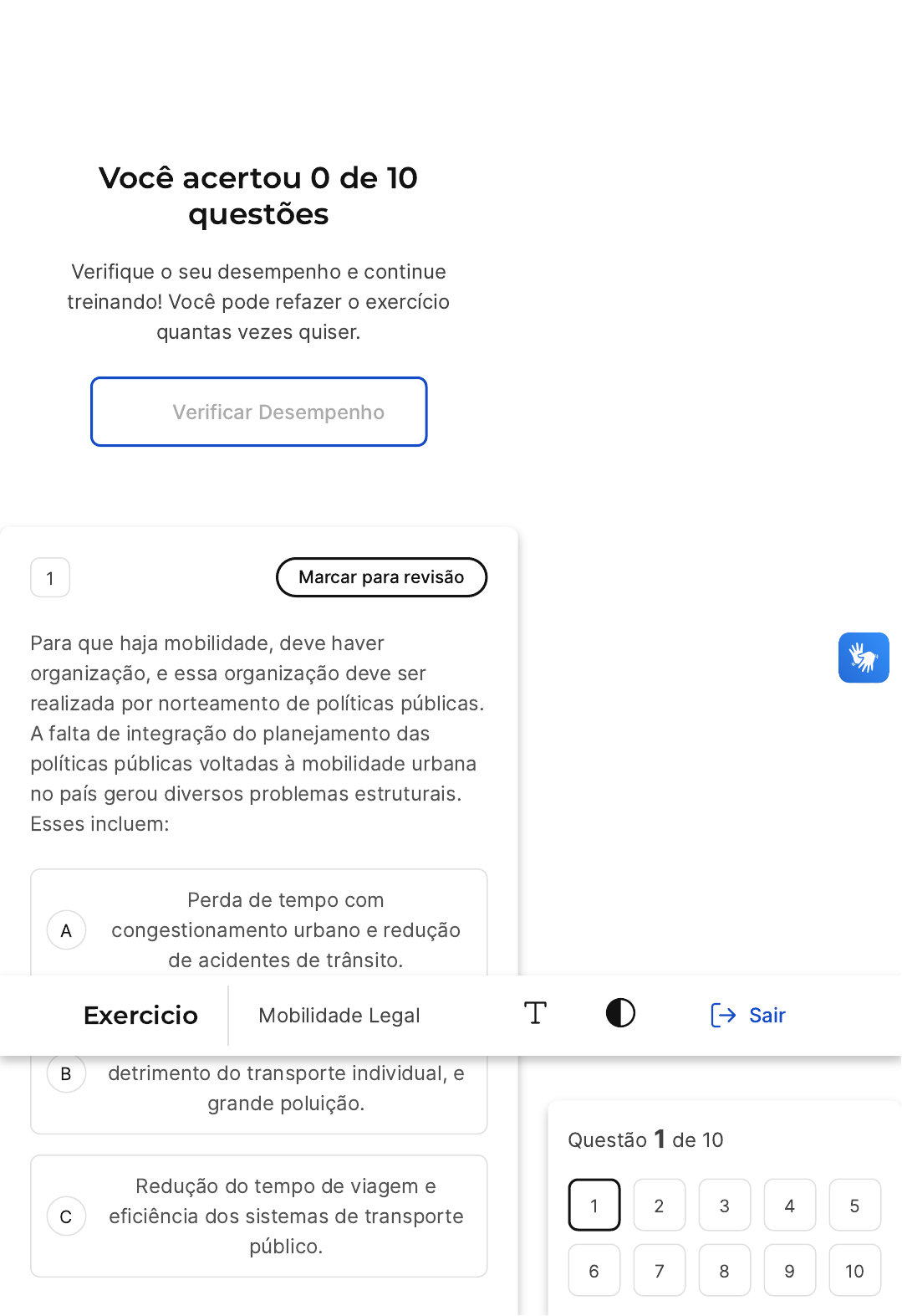 Você acertou 0 de 10 questões Verifique o seu desempenho e continue treinando! Você pode refazer o exercício quantas vezes quiser. Verificar Desempenho A B C 1 Marcar para revisão Para que haja mobilidade, deve haver organização, e essa organização deve ser realizada por norteamento de políticas públicas. A falta de integração do planejamento das políticas públicas voltadas à mobilidade urbana no país gerou diversos problemas estruturais. Esses incluem: Perda de tempo com congestionamento urbano e redução de acidentes de trânsito. Uso intenso do transporte coletivo, em detrimento do transporte individual, e grande poluição. Redução do tempo de viagem e eficiência dos sistemas de transporte público. Questão 1 de 10 1 2 3 4 5 6 7 8 9 10 Exercicio Mobilidade Legal Sair D E Baixa ocorrência de trens e metrôs de alta capacidade, restritos a poucas regiões metropolitanas, e sem rede planejada. Redução do congestionamento urbano e uso intensivo do transporte individual. Questão não respondida Opa! A alternativa correta é a letra D. Confira o gabarito comentado! Gabarito Comentado A alternativa correta é a letra D. O enunciado da questão aborda a falta de integração do planejamento das políticas públicas voltadas à mobilidade urbana no país e os problemas estruturais que isso gerou. A alternativa D menciona a baixa ocorrência de trens e metrôs de alta capacidade, restritos a poucas regiões metropolitanas, e a ausência de uma rede planejada. Isso reflete a realidade de muitas cidades brasileiras, onde o transporte público é insuficiente e mal distribuído, causando problemas como congestionamentos e dificuldades de deslocamento para a população. Portanto, a alternativa D é a que melhor responde à questão, pois aponta um dos principais problemas gerados pela falta de planejamento e integração das políticas públicas de mobilidade urbana. Em branco �10� A B C D E 2 Marcar para revisão Os gargalos rodoviários do Brasil e o trânsito caótico em suas metrópoles obrigam os governos estadual e federal a retomarem os planos de implantação de trens regionais. Nas últimas quatro décadas, a malha ferroviária foi esquecida e sucateada, tanto que hoje, em todo o país, apenas duas linhas de passageiros estão em operação. Elas transportam 1,5 milhão de pessoas entre Belo Horizonte �MG� e Vitória �ES� e entre São Luís �MA� e Carajás �PA� � ambas operadas pela mineradora Vale. Na década de 1960, mais de 100 milhões de passageiros utilizaram os trens intermunicipais no território nacional. Disponível em: www.estadao.com.br, em 2 de setembro de 2010. O desmantelamento do meio de transporte descrito foi causado pela Redução da demanda da população por trens intermunicipais. Priorização da malha viária no período de modernização do espaço. Inadequação das rotas devido ao tamanho do país. Precariedade tecnológica em relação a outros meios de deslocamento. Aumento dos problemas ambientais associados à conservação das ferrovias. Questão não respondida Opa! A alternativa correta é a letra B. Confira o gabarito comentado! Gabarito Comentado Historicamente, o Brasil tem priorizado investimentos na malha rodoviária em detrimento de outros modais de transporte, como os trens. Durante o período de modernização do espaço, essa tendência se acentuou, levando ao desmantelamento da malha ferroviária. A falta de investimentos significativos em trens resultou em seu desuso em grande parte do país, conforme evidenciado pelo fato de que, atualmente, apenas duas linhas de passageiros estão em operação. Portanto, a alternativa correta é a B, que afirma que o desmantelamento do meio de transporte descrito foi causado pela priorização da malha viária no período de modernização do espaço. 3 Marcar para revisão Além de emitir muitos gases, os transportes também apresentam outros efeitos indesejados. Alguns são listados abaixo: I. Impacto nos espaços naturais; II. Aumento da poluição sonora; III. Danos aos ecossistemas marinhos e aéreos. Está correto o que se afirma em: A B C D E I, II e III. Apenas III. I e II. I e III. II e III. Questão não respondida Opa! A alternativa correta é a letra A. Confira o gabarito comentado! Gabarito Comentado Além da poluição atmosférica, o transporte tem outros efeitos nocivos: Impacto nos espaços naturais. Aumento da poluição sonora. Danos aos ecossistemas marinhos e aéreos. 4 Marcar para revisão Qual dos seguintes meios pode ser considerado como transporte alternativo para a mobilidade urbana sustentável nas grandes cidades: A B C D E Veículo particular. Cavalo. Trem. Ônibus a combustão interna. Motocicletas. Questão não respondida Opa! A alternativa correta é a letra C. Confira o gabarito comentado! Gabarito Comentado Os trens são considerados uma alternativa de transporte sustentável para a mobilidade urbana nas grandes cidades. Comparados a outros meios de transporte, os trens modernos são mais eficientes e simplificados. Eles emitem menos CO , consomem menos energia e operam a uma velocidade quase constante, pois geralmente seguem uma rota linear. Além disso, os trens não enfrentam congestionamentos e têm uma probabilidade menor de acidentes. Portanto, a alternativa correta é o trem. 2 5 Marcar para revisão A B C D E A localização da moradia influencia diretamente no sistema de transporte. É comum haver o conflito de interesse, quando se deve escolher entre: onde morar, quando, como e o quanto se locomover. A esse conflito de interesse, chamamos de trade-off. A consideração do trade-off é importante pois Atende ao modelo de cidades que comportam os modelos integrados de transportes. Define a quantidade de transportes públicos destinados à população, e a localização de seus centros comerciais. Define a quantidade de moradias destinadas à população, e a localização dos seus centros comerciais. Define a quantidad