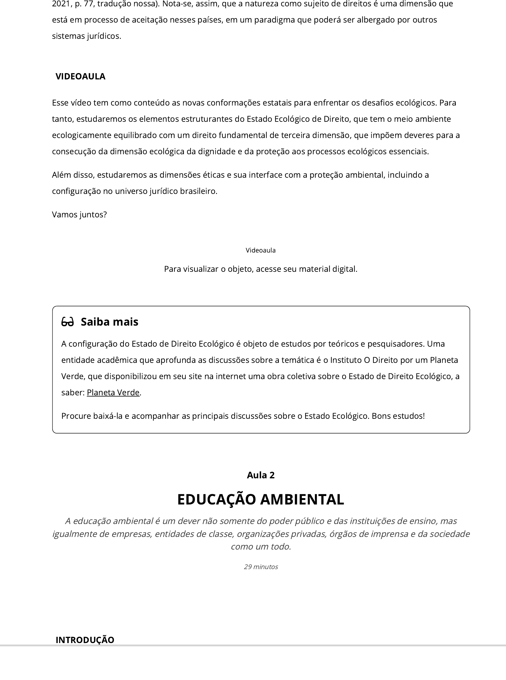 3/26/24, 2:03 PM wlldd_231_u4_res_soc_amb https://www.colaboraread.com.br/integracaoAlgetec/index?usuarioEmail=natalileitesilveira%40gmail.com&usuarioNome=NATALI+DE+OLIVEIRA+LEITE+SILVEIRA&disciplinaDescricao=&atividadeId=3923020&ativ… 6/25 2021, p. 77, tradução nossa). Nota-se, assim, que a natureza como sujeito de direitos é uma dimensão que está em processo de aceitação nesses países, em um paradigma que poderá ser albergado por outros sistemas jurídicos. VIDEOAULA Esse vídeo tem como conteúdo as novas conformações estatais para enfrentar os desa�os ecológicos. Para tanto, estudaremos os elementos estruturantes do Estado Ecológico de Direito, que tem o meio ambiente ecologicamente equilibrado com um direito fundamental de terceira dimensão, que impõem deveres para a consecução da dimensão ecológica da dignidade e da proteção aos processos ecológicos essenciais. Além disso, estudaremos as dimensões éticas e sua interface com a proteção ambiental, incluindo a con�guração no universo jurídico brasileiro. Vamos juntos? Saiba mais A con�guração do Estado de Direito Ecológico é objeto de estudos por teóricos e pesquisadores. Uma entidade acadêmica que aprofunda as discussões sobre a temática é o Instituto O Direito por um Planeta Verde, que disponibilizou em seu site na internet uma obra coletiva sobre o Estado de Direito Ecológico, a saber: Planeta Verde. Procure baixá-la e acompanhar as principais discussões sobre o Estado Ecológico. Bons estudos! Videoaula Para visualizar o objeto, acesse seu material digital. INTRODUÇÃO Aula 2 EDUCAÇÃO AMBIENTAL A educação ambiental é um dever não somente do poder público e das instituições de ensino, mas igualmente de empresas, entidades de classe, organizações privadas, órgãos de imprensa e da sociedade como um todo. 29 minutos http://www.planetaverde.org/arquivos/biblioteca/arquivo_20221108171214_8395.pdf 3/26/24, 2:03 PM wlldd_231_u4_res_soc_amb https://www.colaboraread.com.br/integracaoAlgetec/index?usuarioEmail=natalileitesilveira%40gmail.com&usuarioNome=NATALI+DE+OLIVEIRA+LEITE+SILVEIRA&disciplinaDescricao=&atividadeId=3923020&ativ… 7/25 Estudante, é uma alegria tê-lo conosco em um novo encontro, em que discutiremos a educação ambiental. Falar em educação ambiental é discutir os valores, conhecimentos, habilidades, atitudes e competências para o exercício de uma cidadania voltada para a sustentabilidade. É por meio dela que tomamos consciência e re�etimos sobre a importância da proteção do meio ambiente em nosso cotidiano. A educação ambiental é um dever não somente do poder público e das instituições de ensino, mas igualmente de empresas, entidades de classe, organizações privadas, órgãos de imprensa e da sociedade como um todo. Portanto, conhecer os princípios e objetivos da Política Nacional de Educação Ambiental poderá auxiliá-lo na sua atividade pro�ssional, de forma a contribuir na formulação de projetos e iniciativas para a sustentabilidade. Vamos juntos no estudo dessa instigante temática! O CONCEITO DE EDUCAÇÃO AMBIENTAL O que é educação ambiental? Quais os princípios e objetivos da educação ambiental no Brasil? E de que maneira a educação ambiental poderá auxiliar na construção de uma sociedade sustentável? Na primeira conferência das Nações Unidas para o meio ambiente, em Estocolmo, 1972, a educação ambiental passou a ser uma temática central nas proposições ecológicas, ao envolver não apenas as escolas, mas os meios de comunicação, as empresas e toda a sociedade. Nesse sentido, a Declaração de Estocolmo sobre o Meio Ambiente Humano destacou em seu princípio 19 que: A Constituição de 1988, por sua vez, estabelece no art. 225, § 1º, VI, como dever do poder público “[...] promover a educação ambiental em todos os níveis de ensino e a conscientização pública para a preservação do meio ambiente” (BRASIL, 1988). Esse dever foi regulamentado pela Lei nº 9.795/1999, que instituiu a Política É indispensável um esforço para a educação em questões ambientais, dirigida tanto às gerações jovens como aos adultos e que preste a devida atenção ao setor da população menos privilegiado, para fundamentar as bases de uma opinião pública bem-informada, e de uma conduta dos indivíduos, das empresas e das coletividades inspirada no sentido de sua responsabilidade sobre a proteção e melhoramento do meio ambiente em toda sua dimensão humana. É igualmente essencial que os meios de comunicação de massas evitem contribuir para a deterioração do meio ambiente humano e, ao contrário, difundam informação de caráter educativo sobre a necessidade de protegê-lo e melhorá- lo, a �m de que o homem possa desenvolver-se em todos os aspectos. — (ONU, 1972, p. 5) 3/26/24, 2:03 PM wlldd_231_u4_res_soc_amb https://www.colaboraread.com.br/integracaoAlgetec/index?usuarioEmail=natalileitesilveira%40gmail.com&usuarioNome=NATALI+DE+OLIVEIRA+LEITE+SILVEIRA&disciplinaDescricao=&atividadeId=3923020&ativ… 8/25 Nacional de Educação Ambiental (PNEA), inserindo a educação ambiental como componente essencial e permanente da educação nacional, e disciplinando os seus princípios, objetivos e responsabilidades para todos os atores públicos e privados. Para a PNEA, a educação ambiental é entendida como “[...] os processos por meio dos quais o indivíduo e a coletividade constroem valores sociais, conhecimentos, habilidades, atitudes e competências voltadas para a conservação do meio ambiente [...]” (BRASIL, 1999). Ademais, a PNEA, ao teor da Constituição de 1988, reconhece o meio ambiente como “[...] bem de uso comum do povo, essencial à sadia qualidade de vida e sua sustentabilidade” (BRASIL, 1999). A educação ambiental “[...] é um componente essencial e permanente da educação nacional, devendo estar presente, de forma articulada, em todos os níveis e modalidades do pro