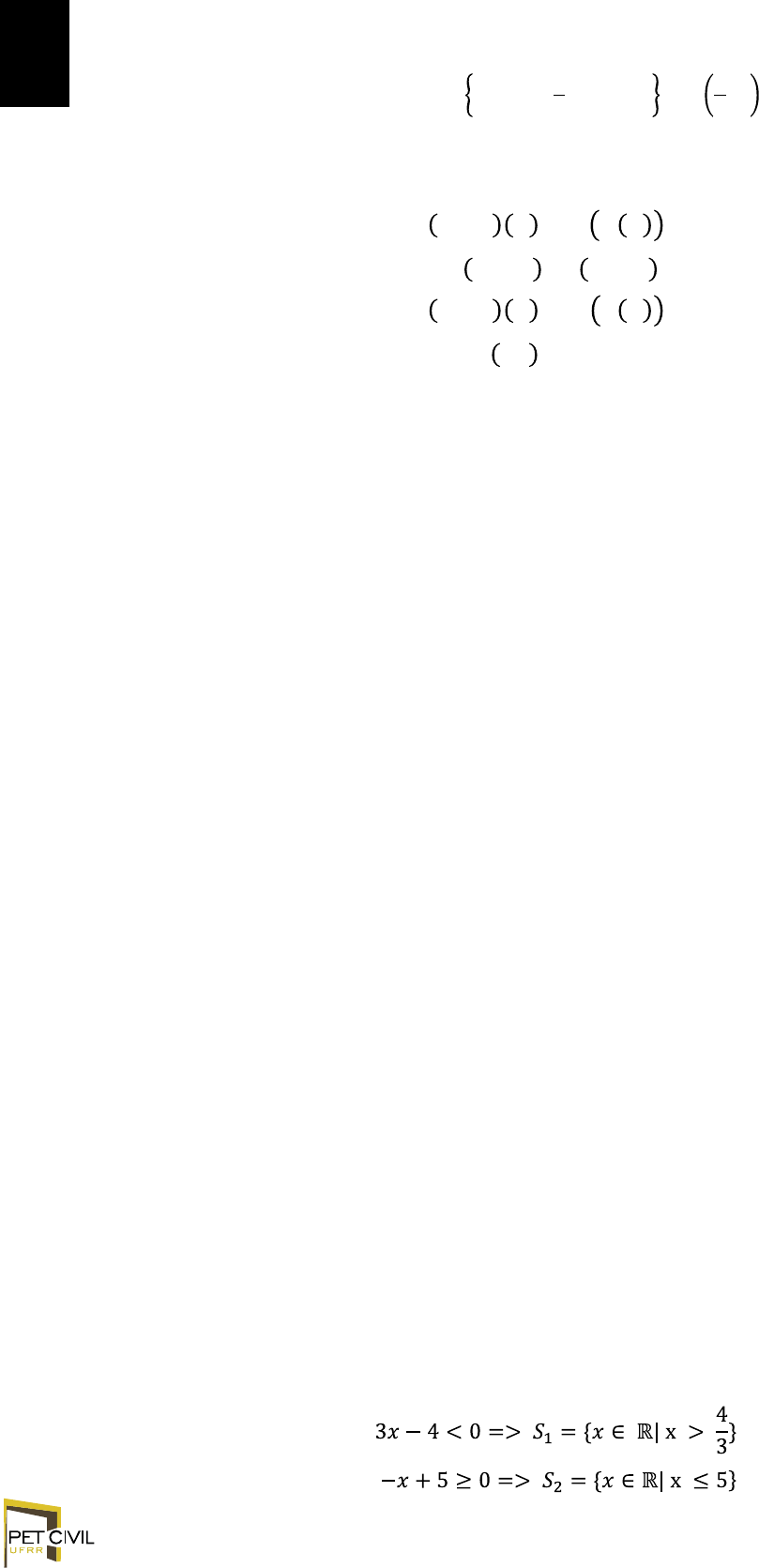 40 Pré-cálculo para os ingressantes nos cursos de Engenharia e ciências exatas Vejamos um exemplo: Se S = 𝑥 ∈ ℝ | 4 3 < 𝑥 ≤ 5 𝑜𝑢 4 3 , 5 , encontre as funções compostas 𝑓 ∘ 𝑔 e 𝑔 ∘ 𝑓 . Temos 𝑓 ∘ 𝑔 𝑥 = 𝑓 𝑔 𝑥 = 𝑓 𝑥 − 3 = 𝑥 − 3 2 𝑔 ∘ 𝑓 𝑥 = 𝑔 𝑓 𝑥 = 𝑔 𝑥2 = 𝑥2 − 3 2.2.8 INEQUAÇÕES Inequação é uma expressão matemática que tem como objetivo expressar desi- gualdades. Para tanto, fazemos o uso dos sinais < : menor que > : maior que ≤ : menor que ou igual ≥ : maior que ou igual Ao contrário das equações, a solução de uma inequação não necessariamente consiste em um único valor, podendo ser dada por intervalos. Vejamos em um exemplo como resolver uma inequação. 2.2.8.1 INEQUAÇÃO DE 1º GRAU Exemplo: a) 2x - 300 > 0 Esse problema não apresenta dificuldades por se tratar de uma única equação de grau 1. Então, basta prosseguir como se faz com equações para encontrar a solução. 2x > 300 x > 300/2 x > 150 Escrevendo em forma de intervalo: {x∈ (150,+∞)} b) !3𝑥𝑥 − 4 > 0 −𝑥𝑥 + 5 ≥ 0, para x ∈ ℝ Resolveu-se separado cada uma das inequações e pegou-se o intervalo que satisfaz ambas como solução. Vejamos: 41 Grupo PET – Engenharia Civil / UFRR Tomando a interseção dos conjuntos Pode-se observar graficamente na figura abaixo. 2.2.8.2 INEQUAÇÕES - PRODUTO E INEQUAÇÕES – QUOCIENTE A resolução aqui é mais complexa, pois exige a análise do sinal dos termos da ine- quação em todo o seu domínio. Exemplo: Inequação-produto: (x-2)(1-2x)≤0, para x ∈R. Utiliza-se outra metodologia para abordar esta desigualdade, não sendo aconse- lhável tentar resolver separadamente os termos para a desigualdade ≤ 0, pois os termos se multiplicam. Devemos proceder de outra maneira: representando graficamente as equações e fazendo a análise de sinal ao longo de todo o domínio. Representando na reta real e lembrando que no produto , fazemos “jogo de sinais” com as funções da mesma forma que fazemos com números. Logo, os intervalos que nos interessam são dois e escrevemos: A resolução das inequações-quociente se dá de modo análogo. 42 Pré-cálculo para os ingressantes nos cursos de Engenharia e ciências exatas 2.2.8.3 INEQUAÇÃO DE 2º GRAU Nesse caso, a análise de sinal é feita a partir da parábola resultante da função quadrática. 1º caso: Δ > 0 a) a > 0 (concavidade para cima) ƒ(x)> 0 ƒ(x)> 0 ƒ(x)< 0 x” x x’ f(x)=0 para x=x'' ou x=x' f(x)>0 para x<x'' ou x>x' f(x)<0 para x''<x<x' b) (concavidade para baixo) f(x)=0 para x=x'' ou x=x' f(x)>0 para x''< x< x' f(x)<0 para x< x'' ou x> x' Outra forma representativa dos sinais é dada abaixo: 1º caso: Δ > 0 a) Δ > 0 e a > 0 b) Δ > 0 e a < 0 { {