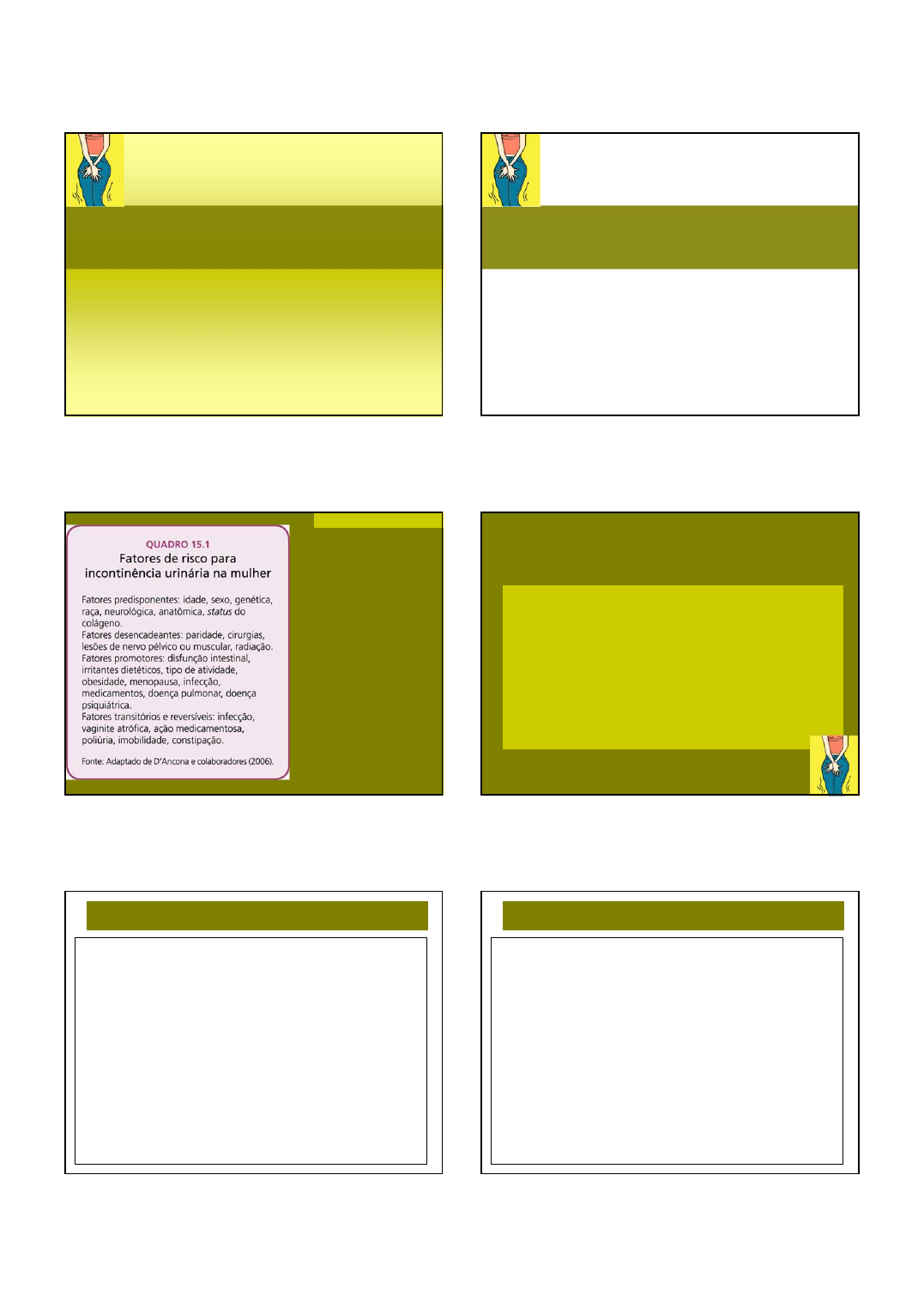 02/05/2023 1 Incontinência urinária Disciplina: Fisioterapia Urogineco-funcional Profa. Dra. Martina E. B. Vieira Diagnóstico da IU (FREITAS et al., 2011) FATORES DE RISCO Predisponentes Desencadeantes Promotores Transitórios/reversíveis Avaliação • Anamnese • Exame físico • Propedêutica complementar Anamnese – Queixas urinárias • Levantamento das queixas da pcte • Todos os sintomas devem ser avaliados quanto à duração, intensidade e fatores desencadeantes – Perda urinária aos esforços (Tosse? Carregar peso? Correr? Volume da perda? Freq dos episódisos? Uso de protetores higiênicos? Evolução do sintoma ao longo do tempo?) – Urgência miccional (desespero para urinar?) – Urge-incontinência (perda involuntária de urina acompanhada ou precedida por urgência miccional?) – Polaciúria ou frequência (pcte relata urinar muitas vezes ao dia; noctúria?) – Enurese noturna – Sensação de esvaziamento vesical incompleto (sente a bexiga ainda cheia?) (PIATO, 2008) Anamnese – Antecedentes pessoais • Condições relevantes para o diagnóstico de IU: – DM (neuropatia periférica sensitiva e motora) – HAS (medicamentos, contra-indicação relativa a alguns ttos clínicos) – Obesidade (aumento da pressão intra-abdominal, limitação para ttos como algumas cirurgias) – Neuropatias centrais e periféricas (alteração do reflexo de micção, da sensibilidade vesical, da musculatura do assoalho pélvico, do esvaziamento vesical, etc.) – DPOC (aumento crônico da pressão abdominal, tosse crônica, pior resultado em cirurgias) (PIATO, 2008) 1 2 3 4 5 6 02/05/2023 2 Anamnese – Antecedentes pessoais • Condições relevantes para o diagnóstico de IU (cont.): – Constipação intestinal (aumento crônico da pressão intra- abdominal, retocele) – Incontinência anal (comum associação dos defeitos por lesão extensa do assoalho pélvico) – Prolapso genital (fatores etiológicos comuns) – Uso de medicamentos – Ingestão de substâncias irritantes vesicais (café, chá, refrigerantes tipo cola e álcool) – Tabagismo (PIATO, 2008) Anamnese – Antecedentes pessoais • Outros dados da história médica relevantes para a IU: – Antecedentes menstruais/menopausa – Antecedentes obstétricos (número de gestações e partos) – Histórico dos partos (normal/cesárea; lacerações, peso do RN) – Cirurgias prévias (PIATO, 2008) Exame físico • Avaliação física e ginecológica completa • Foco em: – Detectar e graduar prolapso genital concomitante – Detectar e graduar ruptura perineal associada – Avaliar trofismo urogenital – Avaliar força do assoalho pélvico (fechamento do intróito vaginal e contração percebida ao toque vaginal com 2 dedos) – Confirmar e caracterizar a perda urinária por meio do teste da perda – Avaliar a integridade neurológica (PIATO, 2008) Avaliação funcional da MAP Palpação bidigital (FREITAS et al., 2011) 7 8 9 10 11 12 02/05/2023 3 ESCALA OXFORD DescriçãoGrau Ausência de contração dos mm perineais0 Esboço de contração muscular não sustentada1 Presença de contração de pequena intensidade, mas que se sustenta (sem percepção de subida do AP) 2 Contração sentida com aumento da pressão intravaginal que comprime os dedos do examinador com pequena elevação da parede posterior vaginal 3 Contração satisfatória que aperta os dedos do examinador com elevação da parede posterior vaginal em direção à sínfise púbica (contra resistência por < 5 seg) 4 Contração forte, compressão firme dos dedos do examinador com movimento positivo em direção à sínfise púbica (contra resistência por > 5 seg) 5 MORENO. 2009 Teste da perda urinária 1. Repleção vesical 2. Pcte em pé com um dos MMII apoiado em um degrau e em posição ginecológica 3. Teste do esforço 4. Verificação da perda urinária 5. Checar controle da perda 6. Observar quantidade 7. Proceder também com a bexiga “vazia” (PIATO, 2008) Exame físico – teste da perda urinária • Perdas urinárias que ocorrem durante esforço são suspeitas de IUE • Perdas urinárias após o esforço, em maior quantidade e sem controle, que se assemelham a micção completa são suspeitas de hiperatividade do detrusor • Perda urinárias ao esforço mesmo com a bexiga vazia supeita-se de deficiência esfincteriana intríseca (próprios da uretra) (PIATO, 2008) Exame físico – Exame neurológico • Testes que avaliam o arco reflexo sacral e demostram a integridade do componente motor do n pudendo: 1. Reflexo bulbocavernoso – estimulação do clitóris provoca contração do m bulbocavernoso 2. Reflexo da tosse – durante a tosse há contração espontânea dos mm do assoalho pélvico 3. Reflexo anocutâneo – a estimulação da pele próxima ao ânus provoca contração do esfincter anal. (MORENO, 2009) Propedêutica complementar • Diário miccional – Anotação em tabela da ingestão de líquidos, das micções e das perdas urinárias – Geralmente, é realizado por 3 dias consecutivos – Inclui o horário da micção ou da perda urinária, assim como os sintomas associados (ex: urgência) – Registro do volume de cada micção (avalia a capacidade funcional máxima–volume total da bexiga) – Observar o maior intervalo entre as micções (PIATO, 2008) Propedêutica complementar • Estudo urodinâmico – Diagnóstico diferencial das perdas urinárias, reproduzindo as condições habituais dos sintomas da pcte – Podem-se avaliar outros sintomas urinários, como alterações de esvaziamento e complacência vesical – Antes da realização do exame – Excluir ITU por meio de cultura da urina (PIATO, 2008) 13 14 15 16 17 18 02/05/2023 4 Estudo urodinâmico • Indicações – Incontinência urinária recidivada – Planejamento cirúrgico – Persistência de sintomas após tratamento conservador – Distúrbios de esvaziamento • Exame em 3 etapas – fluxometria, cistometria e estudo miccional